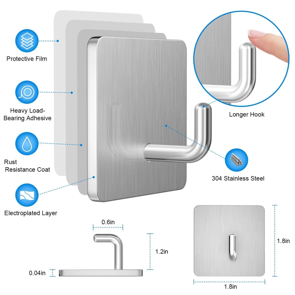 ACMYCH Adhesive Hooks, Waterproof Stainless Steel Hooks,Towel Hooks-4 Packs Easy to Install:Totally a hassle-free installation. Installation without tools and screw. It is do not need to drill holes on the wall, just stick on the wall(suit for different space). Functional and Modern looking:Stylish silver adhesive hooks, beautiful and fashionable, compatible with any other modern designed home decor. Help you save more space and keep your room tidy. Rustproof and Waterproof: Made of Upgraded SUS-304 Brushed Stainless Steel, High Load-Bearing Capacity, Better Protect Against Corrosion & Rust. Ensuring Quality and Longevity Widely Application For Home:Self adhesive hooks could easily stick to glass, wood, metal, ceramics, tile and so on. Suitable for holding towels, hats, clothes, bathrobes, keys, umbrellas. Best Services:If you're not completely satisfied, we will give you a 100% refund. It is our intention to offer the BEST customer service on Amazon. SHIPPING Domestic Buyers - We have confidence in our products, but if you are not fully satisfied please contact us within 30 days of purchase and you will get full refund. - We ship within 3 business days of payment, usually sooner - We offer FREE shipping on all orders! - We only ship to the lower 48 states, no APO/FPO addresses or PO Boxes allowed International buyers – please note: Import duties, taxes, and charges aren't included in the item price or postage cost. These charges are the buyer's responsibility. - Please check with your country's customs office to determine what these additional costs will be prior to bidding or buying. * Order Cancellation Policy ** You can return a product for up to 30 days from the date you purchased it. 1. The seller reserves the right to cancel the special case only due to eBay cancellation fee. 2. The decision of seller is the final. 3. The seller will respond to the cancellation request within 2 business days. Please wait for the result of cancellation. 4. In case the cancellation is not completed by some reasons, the buyer can follow the options below to get the refund. 4.1 The buyer can reject the item when it arrives. 4.2 The buyer can send the item back to the seller within 30 days If the buyer receives item (USA Shipment ONLY). The seller will provide the FREE return label to the buyer when the buyer opens " Return Item" case on eBay by using the reason as "Change my mind" ONLY. 5. When buyer has placed the order. The order will be processed and completed by automatic warehouse system within 5 minutes. In case that buyer sends the cancellation request after 5 minutes of placing the order, the request will be rejected. **Sending direct message to cancel the order is not allowed for every case.* Return Policy For the return case - If buyer would like to return the items for refund or replacement, please CONTACT SELLER to receive the free return label from seller. The refund or replacement will be processed with the tracking number of return label which is provided by seller only. The other ways of return which are not approved by seller will not be processed for the refund or replacement.