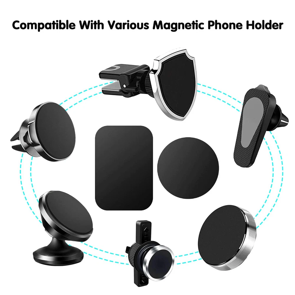 4.5 cm x 6.5 cm rectangular thin metal plate (2Pcs), diameter 4 cm ( 2Pcs) round metal plates Please note that the metal plate does not have magnets. They are the only spare parts compatible with magnetic mounts Stick to the back of your phone or put it between your phone and the case.The Adhesive magnetic plate has strong adhesion, which can keep your equipment stable and safe during driving. If you stick a phone magnet plate on the back of your phone or phone case, you may disable wireless charging.Suggest to take the case off when use wireless charging 100% SATISFACTION Contact us if you are not satisfied, we promise that we will make it right for you.