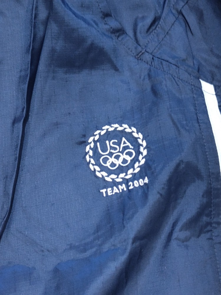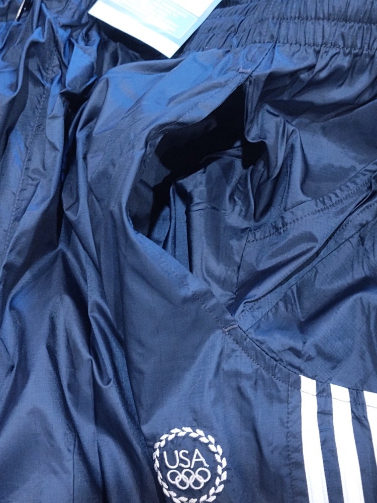New Adidas 2004 Athens Olympics USA Teflon Track Pants Navy Mesh Lined Vintage Men's 3XL. Zipper opening leg bottoms. 4 pockets: 2 front hip pockets, one back zipper pocket and one side pocket.