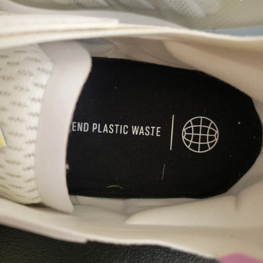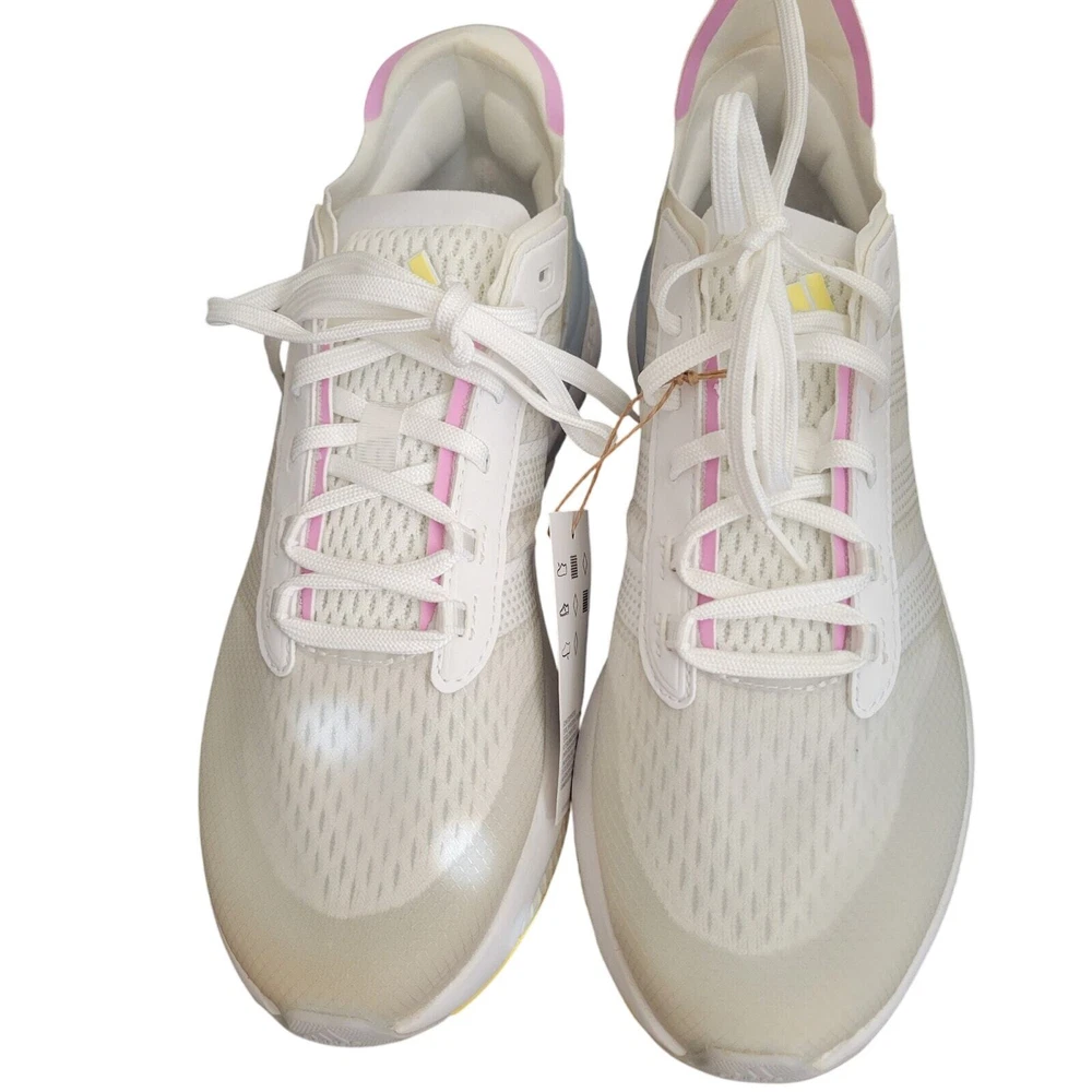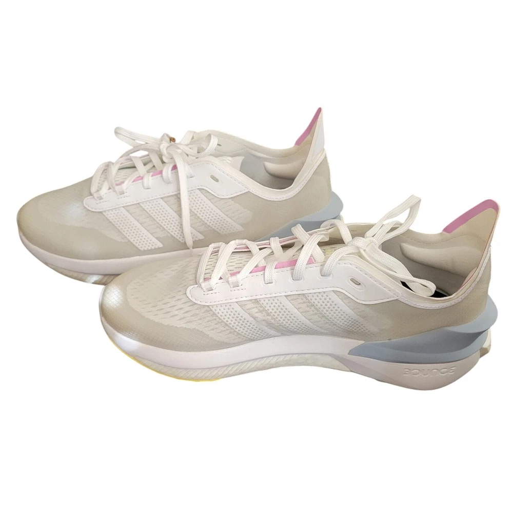 Adidas Avryn White Wonder Blue Women's Athletic Sneaker Women's Running White, Gray and Blue on the top of the shoe The bottom of the shoe is pink, gray, and yellow Sole material is rubber Mesh Upper Lace-up Mid Sole Layers Boost Bounce Technology that delivers Comfort and Support These are new but they may have been returned and may have been tried on. MSRP is $140.00