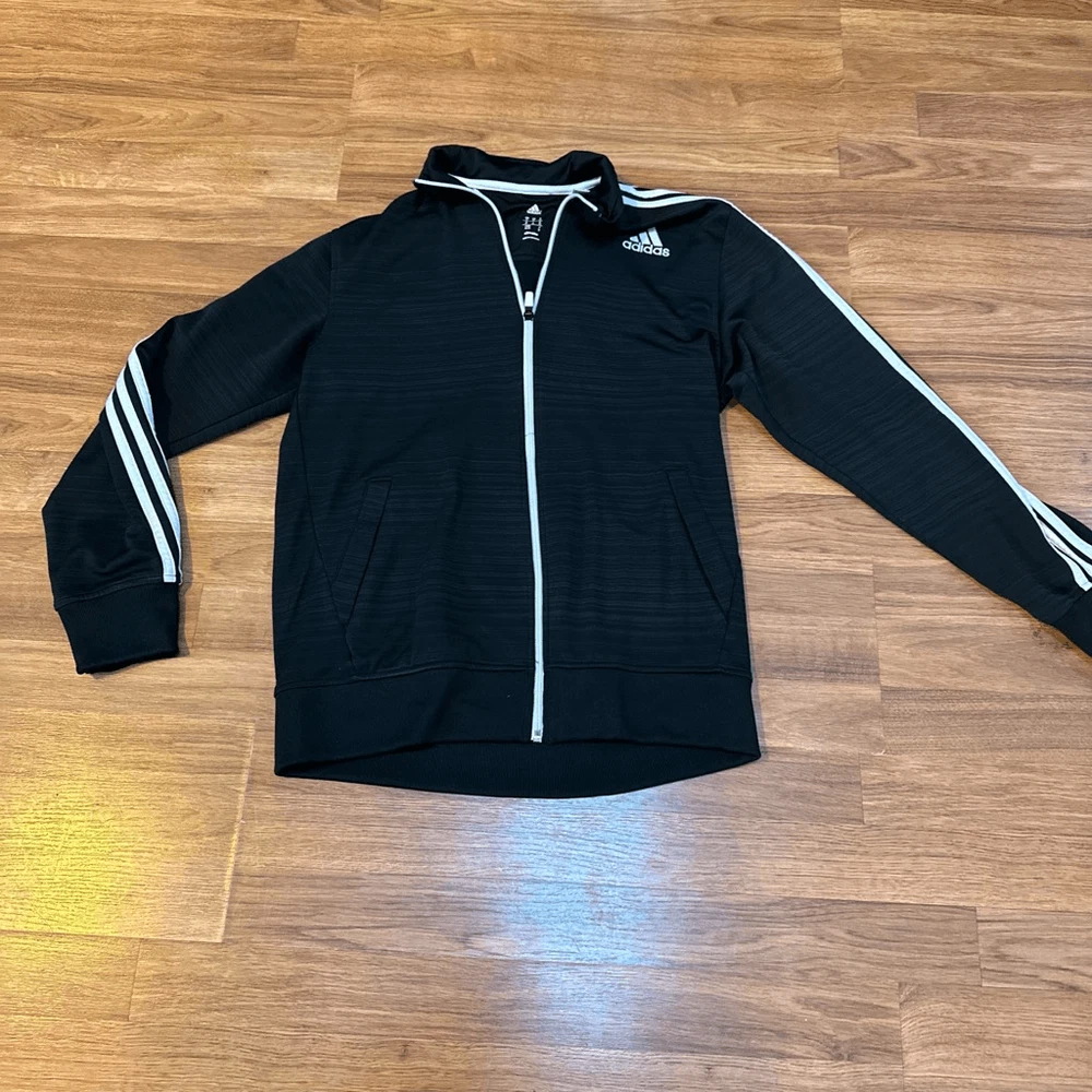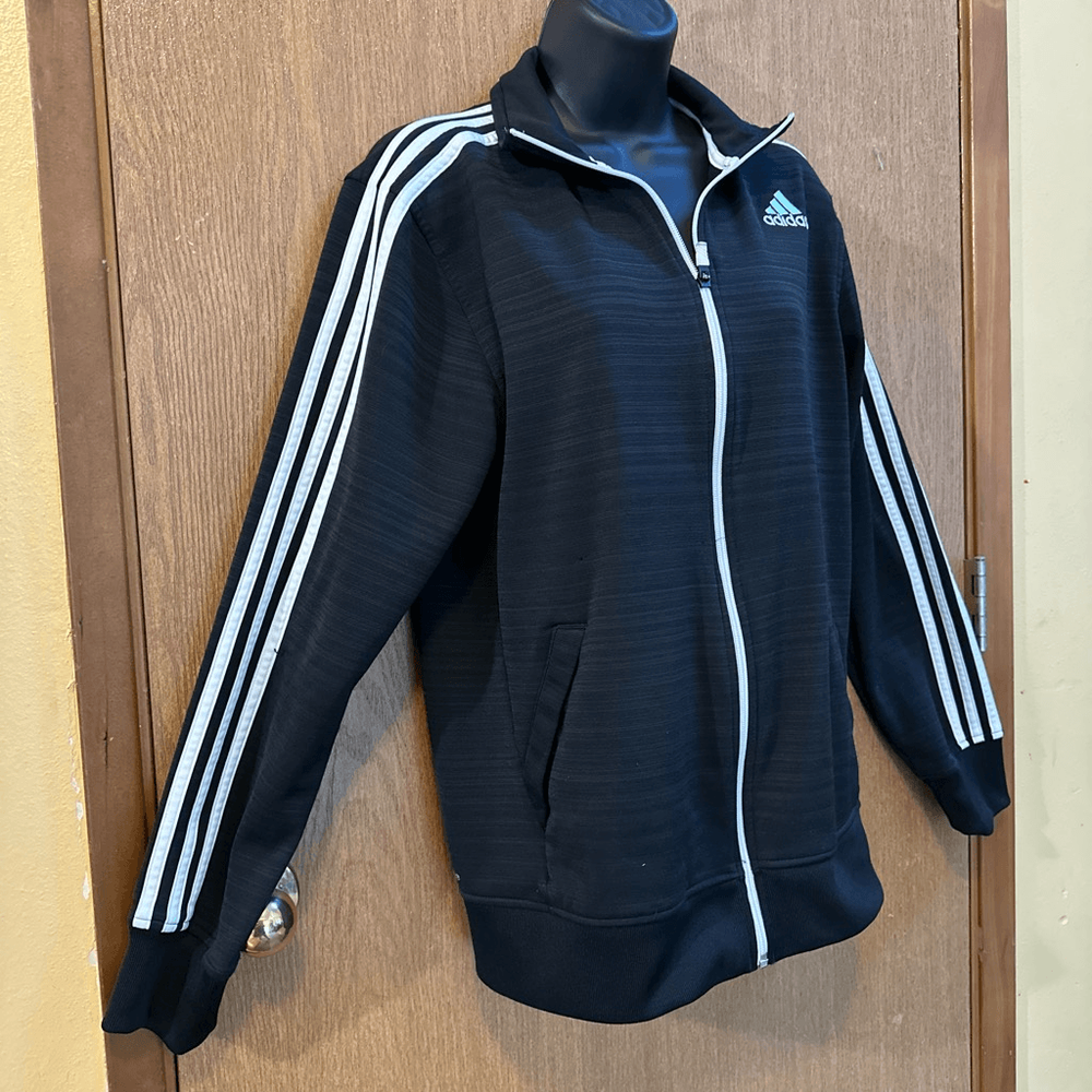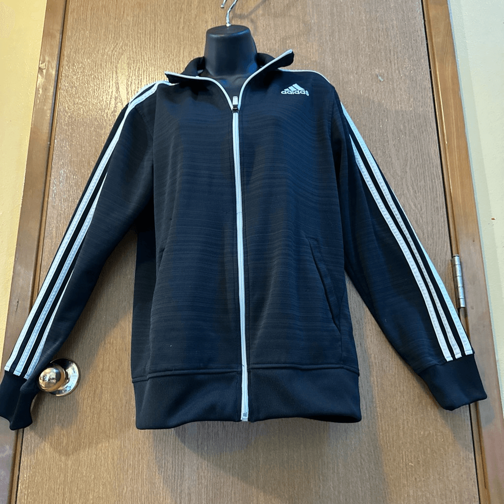 Men’s Adidas track jacket with white stripes and zipper. Has pockets and collar. It is pre-owned but still in Really good condition.nice for all seasons, sports wear, casual. Length 25, chest 19”. #1375