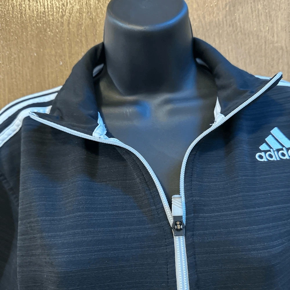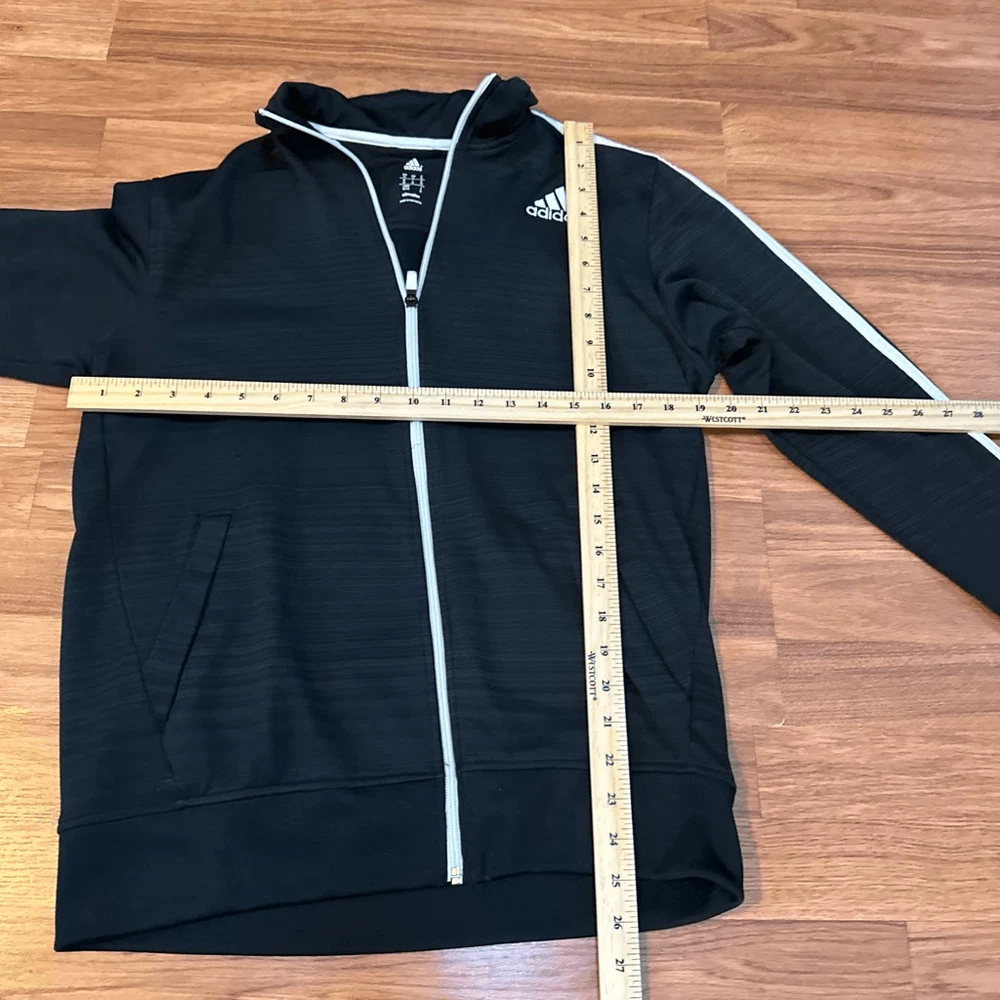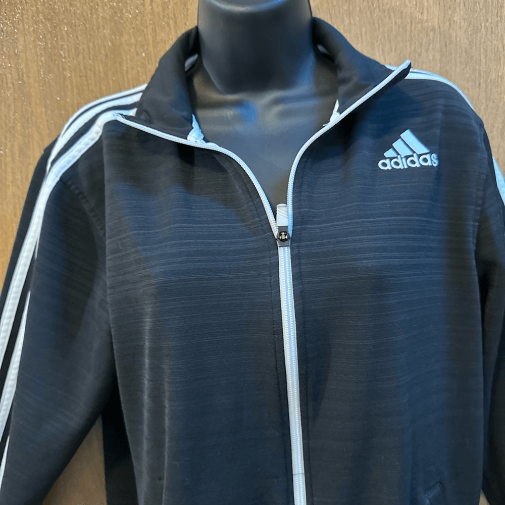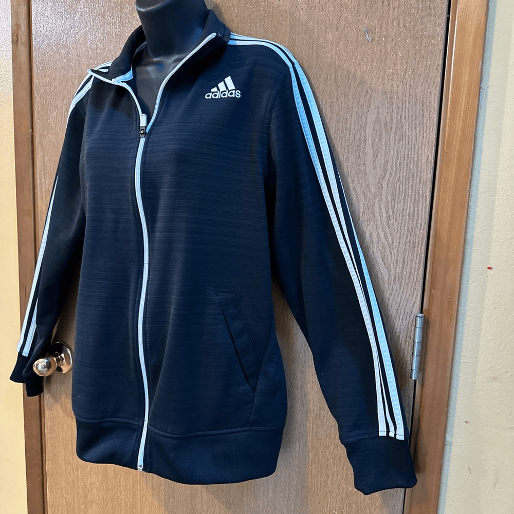 Men’s Adidas track jacket with white stripes and zipper. Has pockets and collar. It is pre-owned but still in Really good condition.nice for all seasons, sports wear, casual. Length 25, chest 19”. #1375