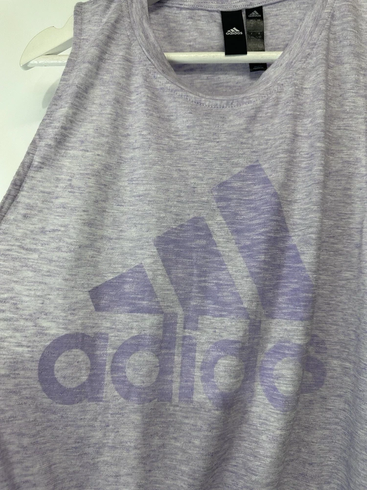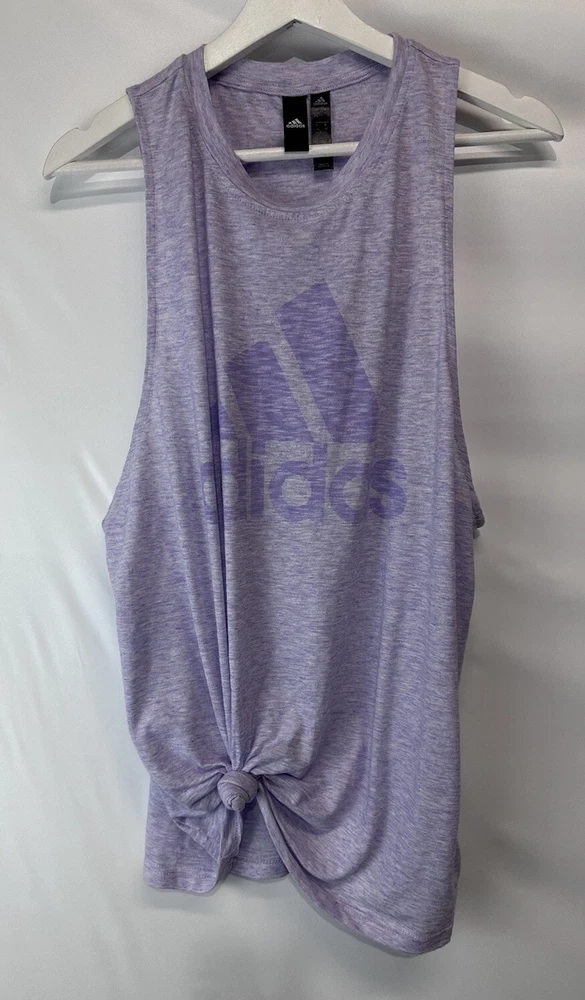MEASUREMENTS length-29” bust-24” unstretched This Adidas Logo Athletic Top is the perfect addition to your casual wardrobe. The marled purple color and tie front closure add a touch of style to this basic sleeveless tee. Made with breathable and stretchy cotton material, this top is machine washable for easy care. Designed with an athletic fit, this top is perfect for any sports occasion, whether you're hitting the gym or going for a run. The crew neck and size L make it suitable for women of all sizes. With its versatile design, this top is a must-have for any sports enthusiast.
