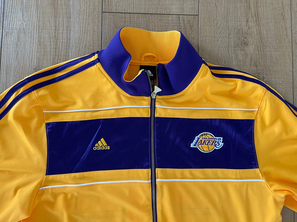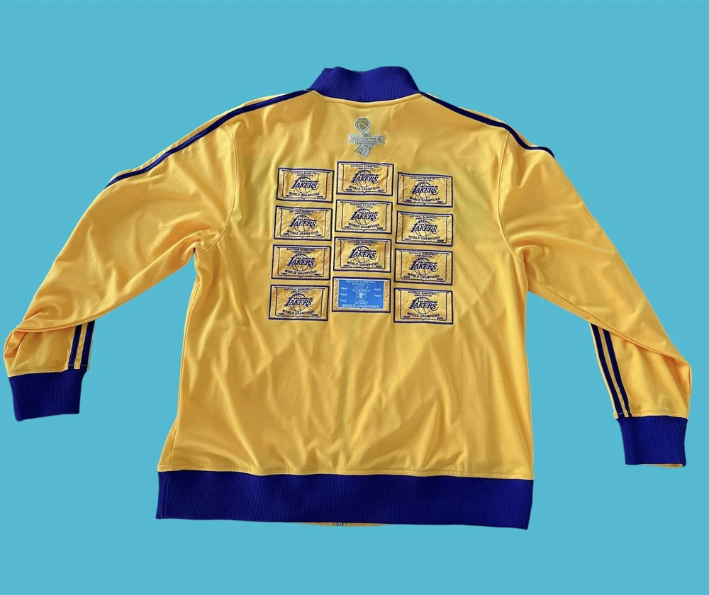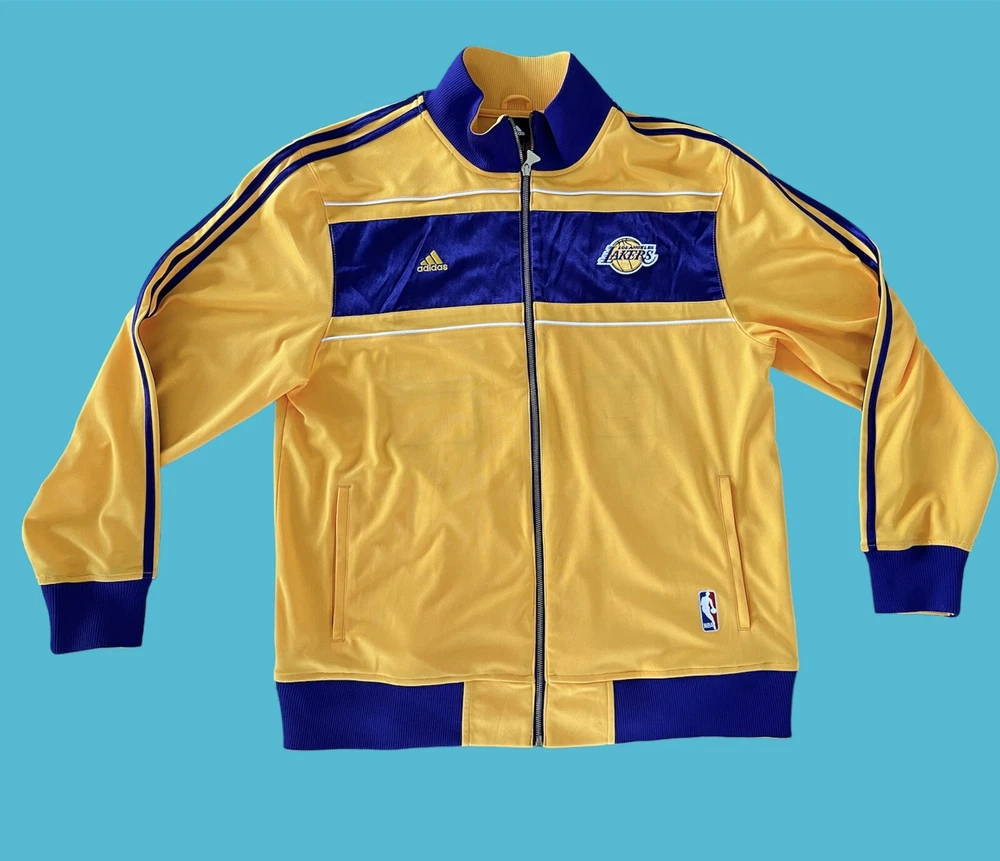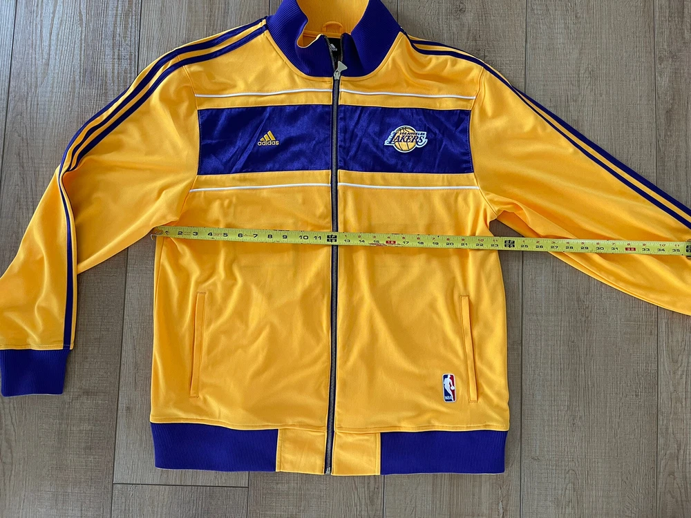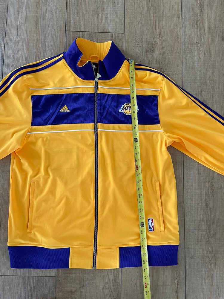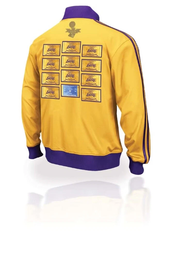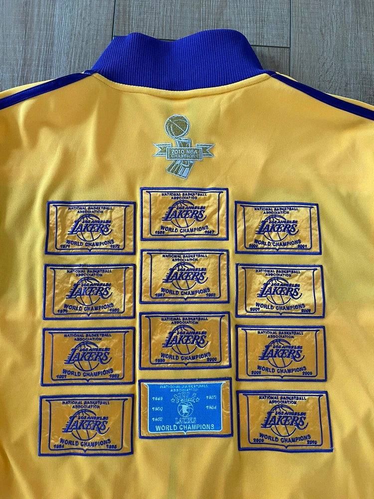 Adidas Los Angeles Lakers 16X Champs Banners Ring Ceremony Jacket 2010. Show your love for the Los Angeles Lakers and the late Kobe Bryant with this Adidas champion banners ring ceremony jacket. The gold jacket features the team's iconic purple and gold colors, with Bryant's number 24 and his nickname "Black Mamba" on the back. The jacket is made for men and is size XL, perfect for any fan of the NBA and the Lakers. This jacket is perfect for any occasion, whether you're going to the NBA Finals or just want to show your support for the Lakers. The jacket is made in Indonesia and is an official Adidas product. Get this jacket and show your love for the Lakers and Kobe Bryant today!
