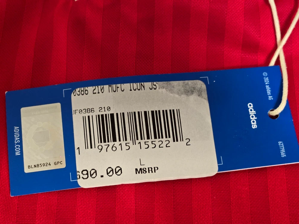 The product is a brand new, officially licensed Adidas Manchester United FC Red Terrace Icon Jersey in size L for men. Made in Thailand, this soccer jersey in red color is designed for fans of the English Premier League team, Manchester United. Perfect for showing support for your favorite club during matches and displaying team pride. MSRP: $90.00