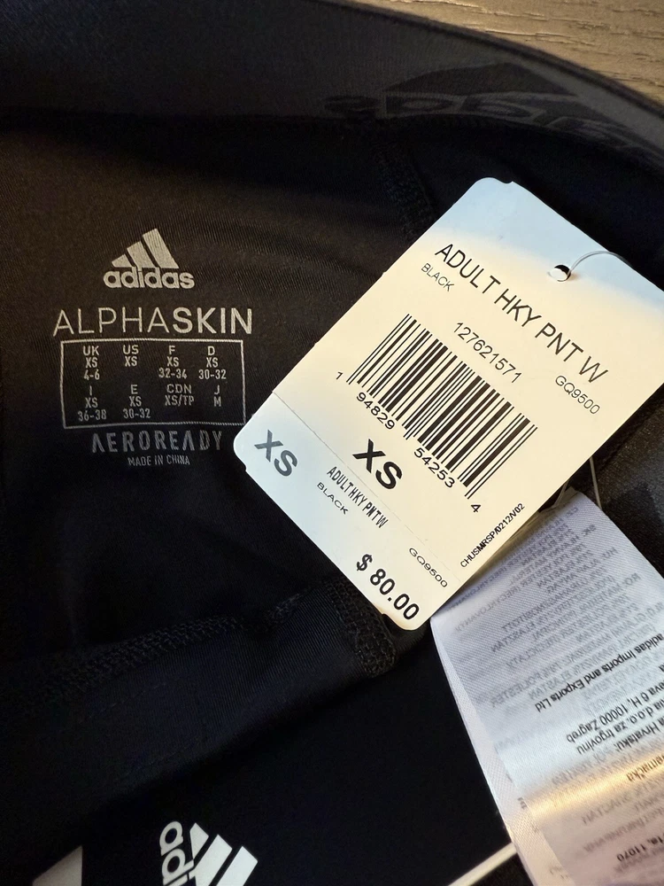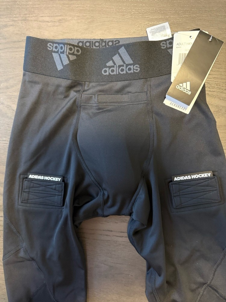 Adidas Hockey Men's Baselayer Pants Tights w/ Cup Size XS Black Alphaskin. Elevate your hockey game with these Adidas Hockey Baselayer Pants Tights. Designed for compression, elastic waist, lightweight, shaping, comfort, and stretch, these pants are perfect for any hockey occasion. The pants are made with Alphaskin GQ9502 material that is quick-drying and ideal for activewear. The pants come in a size XS with a 26-inch inseam and pull-on closure. The black color and Adidas branding make these pants stylish and high-quality. Perfect for hockey enthusiasts, these pants are part of the Adidas Hockey product line.