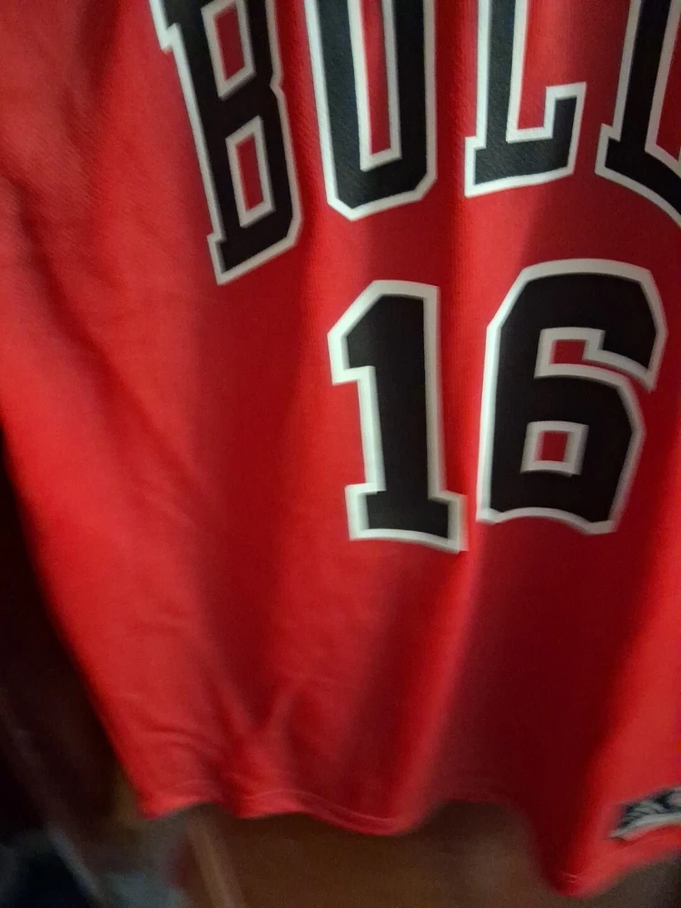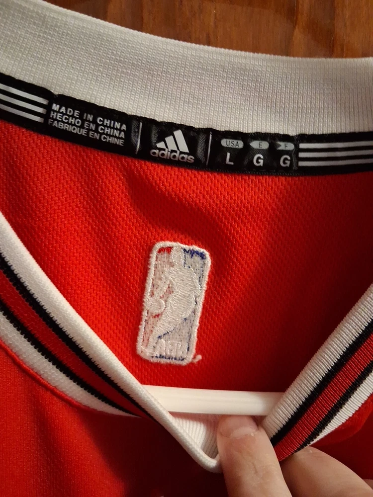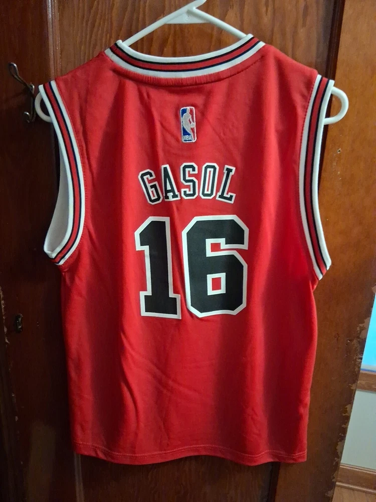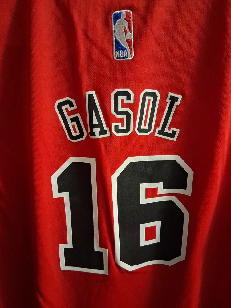 The product is an Adidas men's Chicago Bulls jersey featuring the name and number of player Pau Gasol, specifically jersey number 16. The jersey is in size large, colored red, and officially licensed by the National Basketball Association (NBA). It is designed for fans of the Chicago Bulls team and basketball enthusiasts looking to support their favorite player in style. The jersey is made in China and is a must-have for any fan looking to show their team spirit.