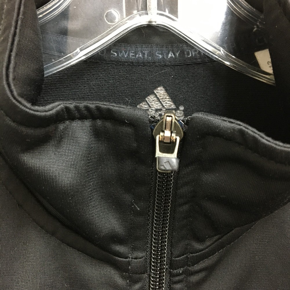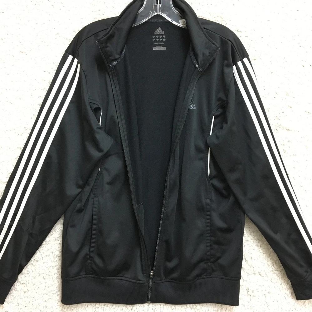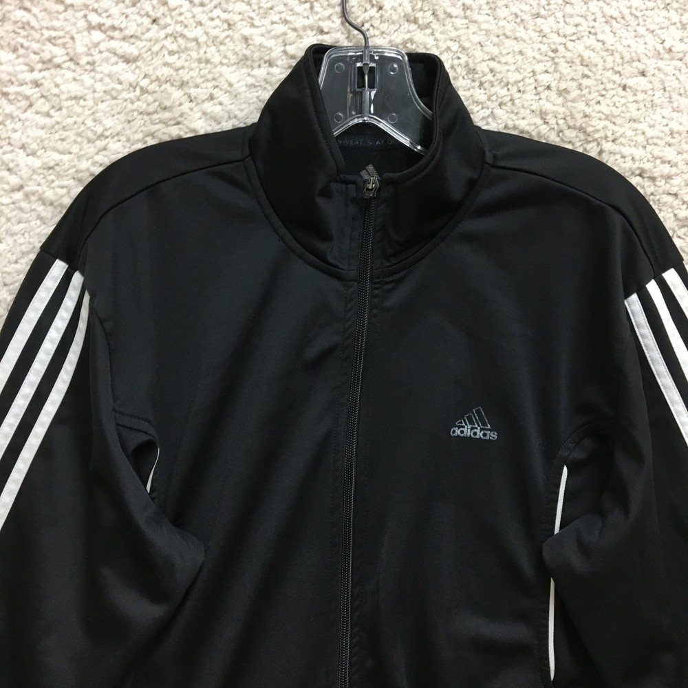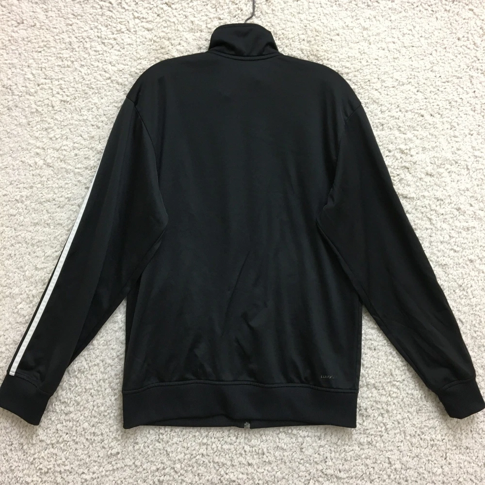 Adidas Jacket Mens Large Black White Track Full Zip 3 Stripe Climalite Athletic Condition: Good - gently worn, minor signs of use, no major visible flaws 100% polyester shell, Climalite fabric for moisture management Classic Adidas three white stripes down sleeves Small embroidered Adidas logo chest, Climalite logo back hem Full zip front with stand up collar and Adidas branded zipper pull Two side hand pockets Tag size: Large (Mens) Made in Cambodia Approximate flat measurements: pit to pit 23 in, back length 28 in Perfect for athletic activities, running, or casual streetwear style