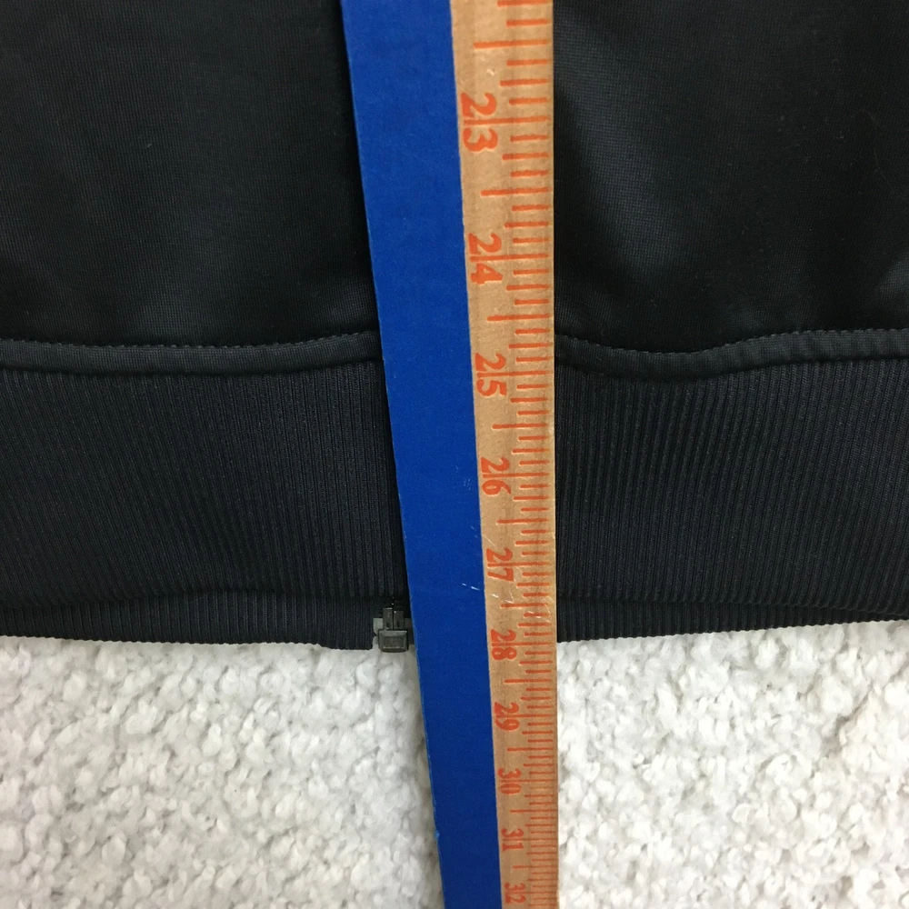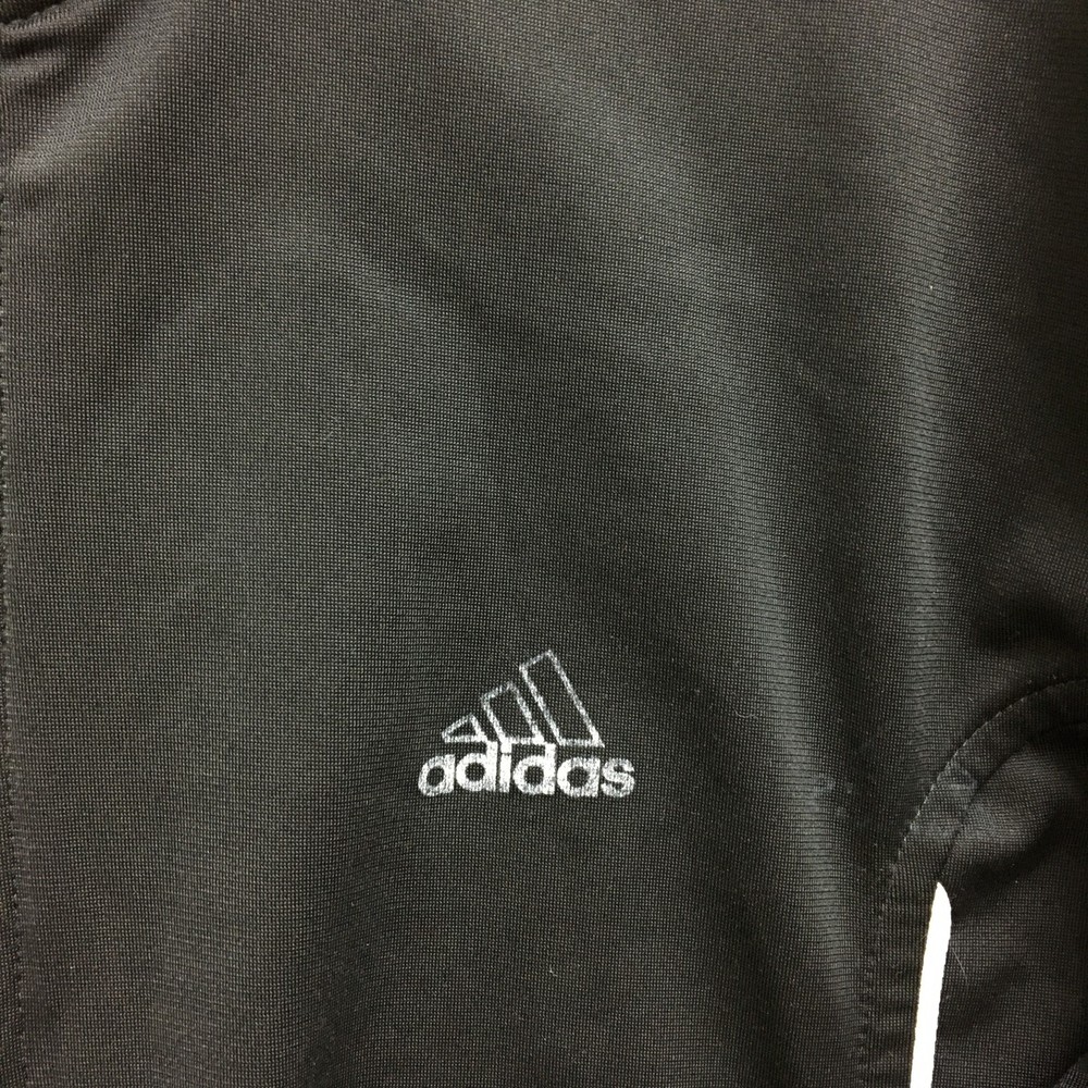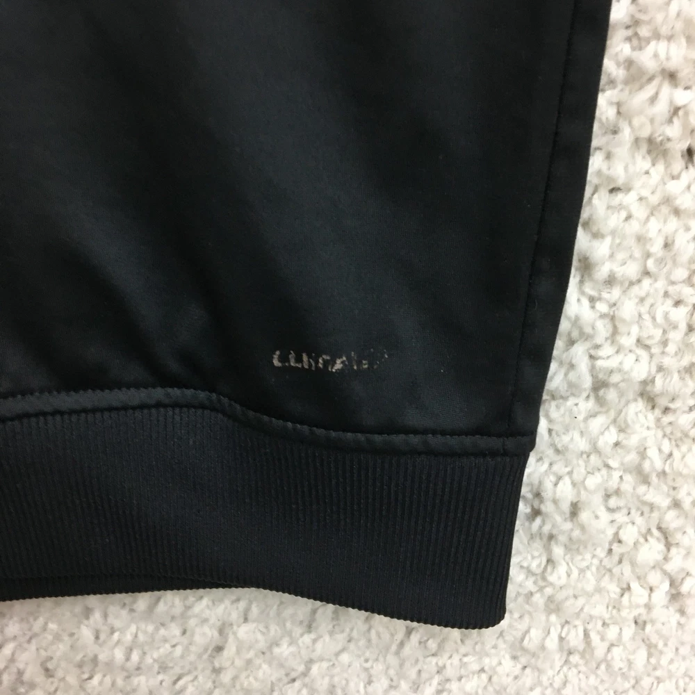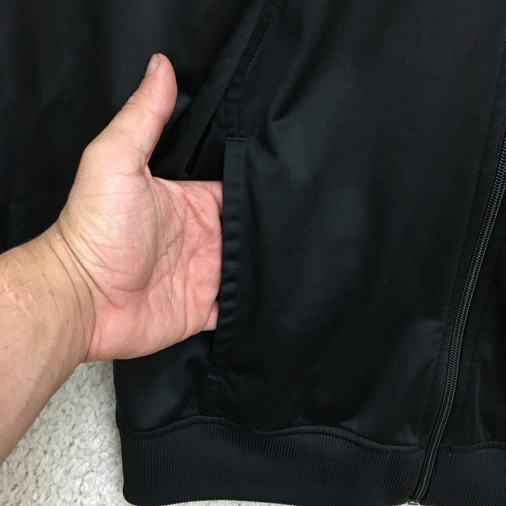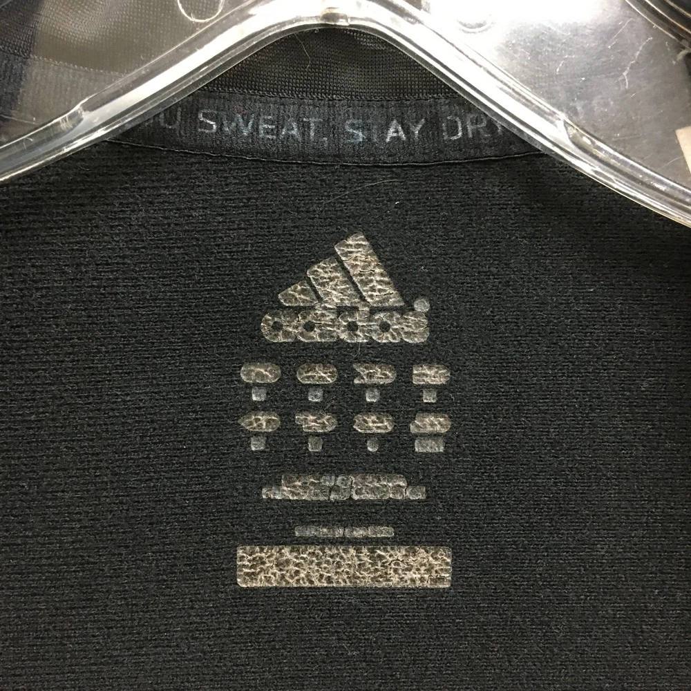 Adidas Jacket Mens Large Black White Track Full Zip 3 Stripe Climalite Athletic Condition: Good - gently worn, minor signs of use, no major visible flaws 100% polyester shell, Climalite fabric for moisture management Classic Adidas three white stripes down sleeves Small embroidered Adidas logo chest, Climalite logo back hem Full zip front with stand up collar and Adidas branded zipper pull Two side hand pockets Tag size: Large (Mens) Made in Cambodia Approximate flat measurements: pit to pit 23 in, back length 28 in Perfect for athletic activities, running, or casual streetwear style