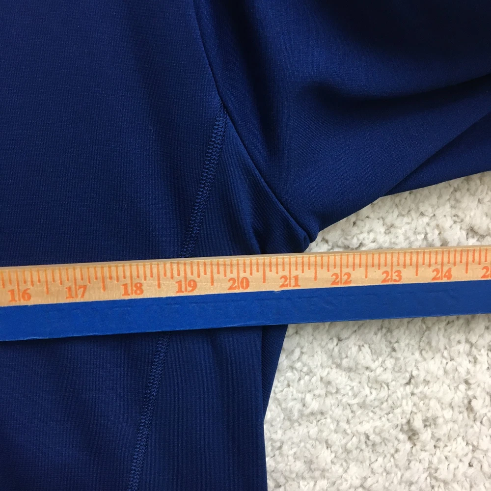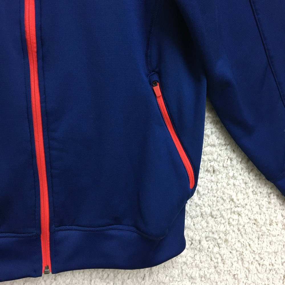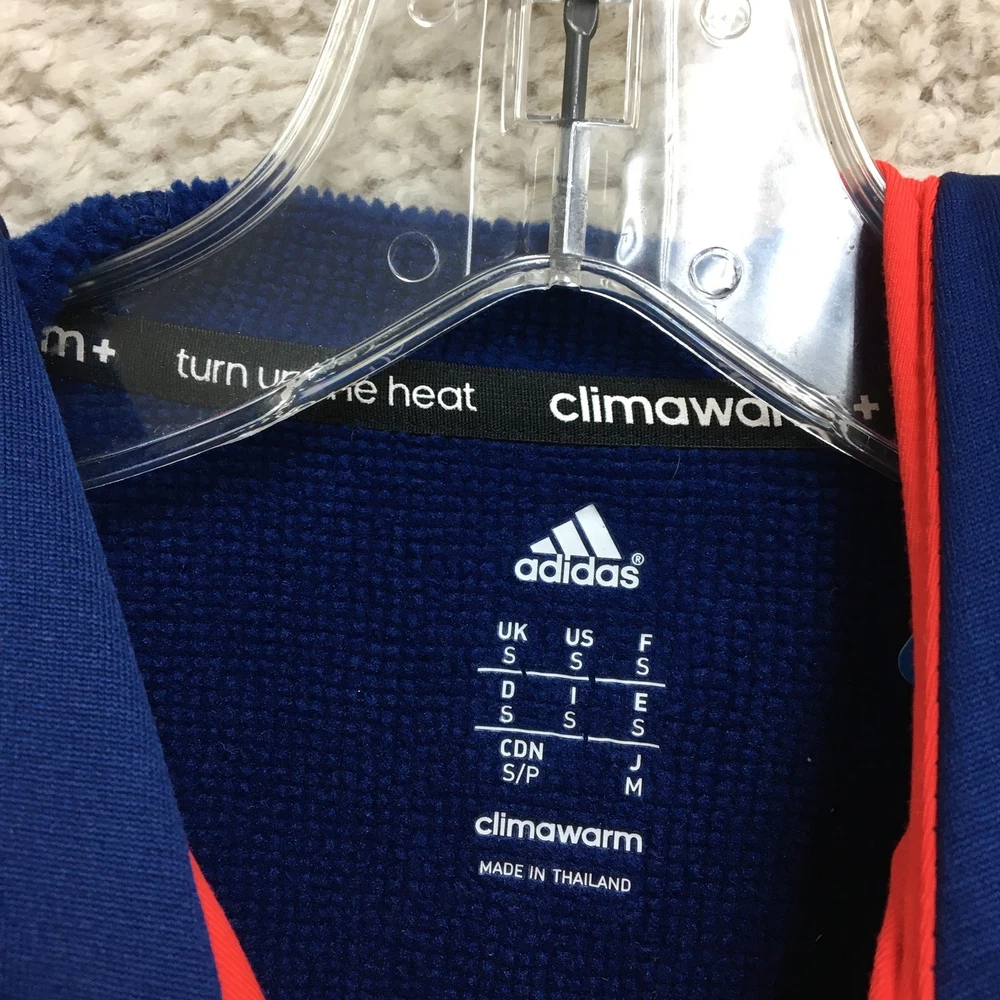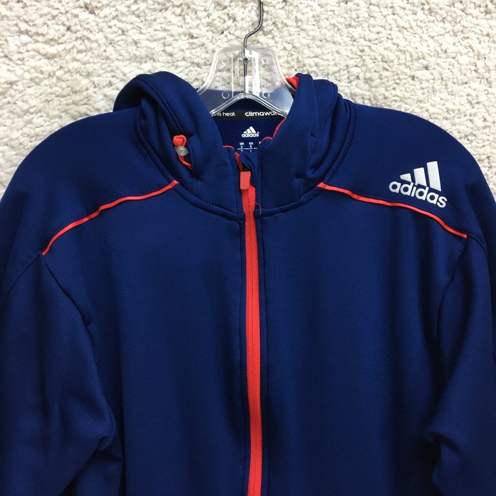 Adidas Jacket Mens Small Blue ClimaWarm Full Zip Hooded Athletic Red Trim Pockets Condition: Gently worn, no visible flaws, zippers and seams all intact Material: 95% polyester, 5% spandex Features a full zip front with bright red contrasting zippers and piping Two zippered hand pockets for secure storage Drawstring adjustable hood for added warmth ClimaWarm thermal insulation for cold weather workouts Adidas logo embroidered on left chest Interior waffle lining for extra warmth and comfort Color: Deep blue with red accents Made in Thailand Tag size: Small (Mens) Approximate flat measurements: Pit to pit 20 in; Back length 27 in Inventory Number: Z1253