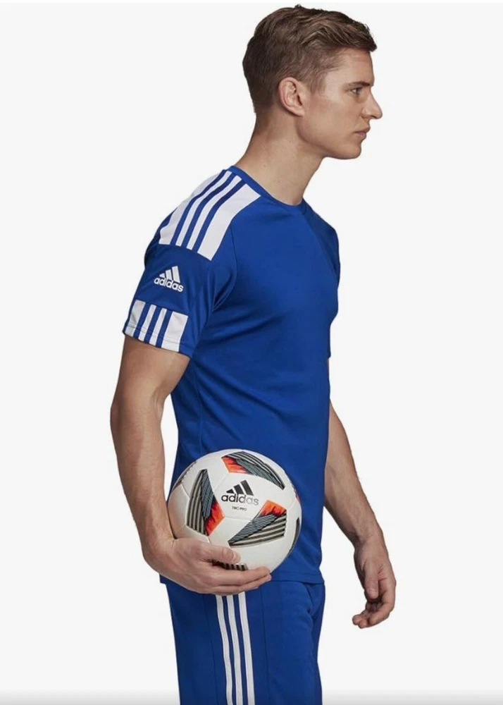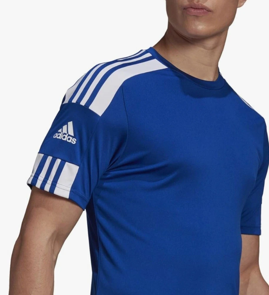 Elevate your activewear game with this Adidas Men's Squadra 21 Sports Shirt Football Short Sleeve Soccer Jersey. The royal blue and white jersey features an asymmetrical sleeve, crew neckline, and pullover closure. It's made of a lightweight and breathable jersey fabric with contrasting trim and moisture-wicking technology for all seasons. The shirt is machine washable and quick-drying, making it perfect for soccer and football activities. It also comes with a tagless design and is compressible for easy storage. Get ready to astound the crowd with this stylish and functional jersey from Adidas.