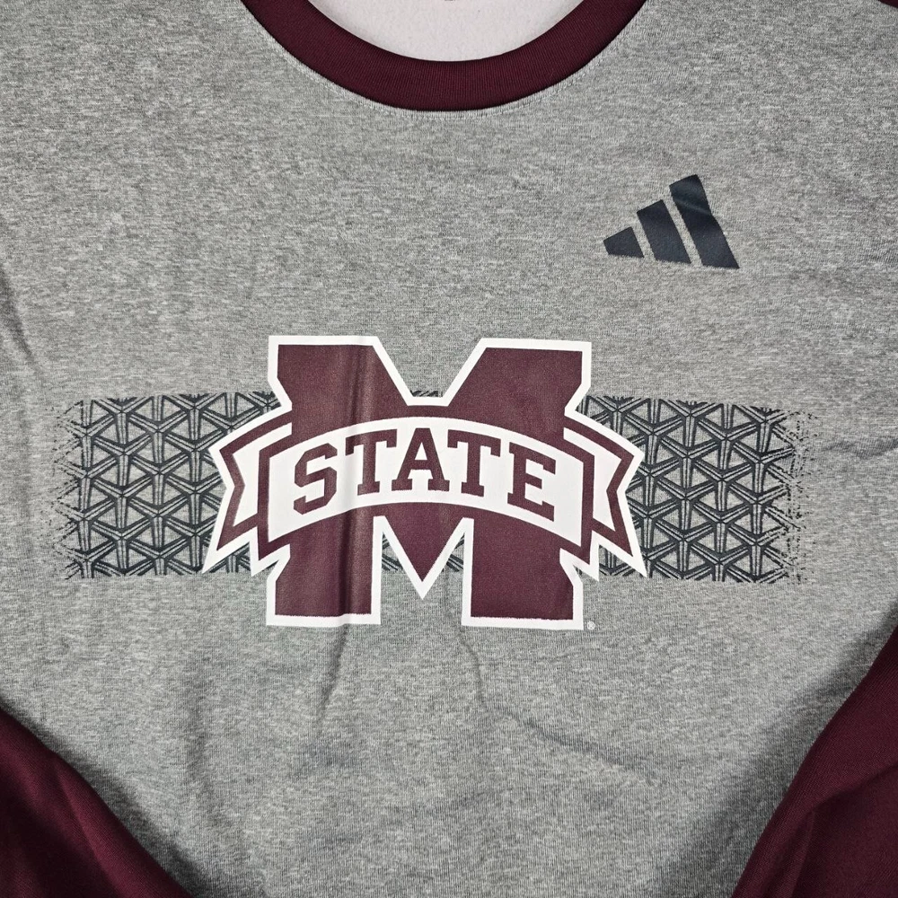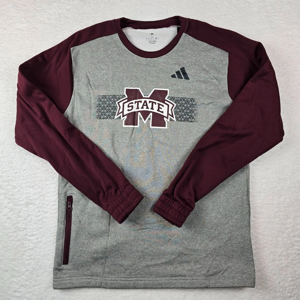Show your support for the Mississippi State Bulldogs with this officially licensed Adidas sweatshirt. With a stylish gray and maroon color design and the team's logo prominently displayed on the front, this sweatshirt is perfect for any fan of the team. It's made from high-quality materials and features the iconic Adidas brand logo on the chest. This sweatshirt is a great addition to any collection of fan apparel and souvenirs, and it's sure to be a hit at any sporting event. The size is a men's size M and it's made in Honduras. Get yours today and show your love for the Mississippi State Bulldogs!