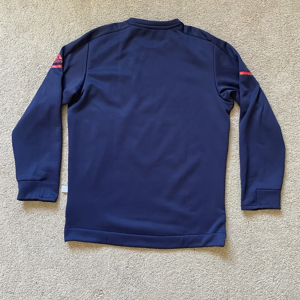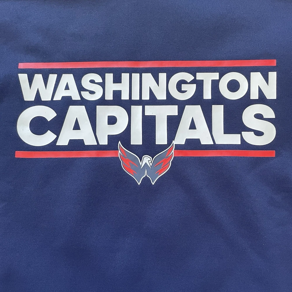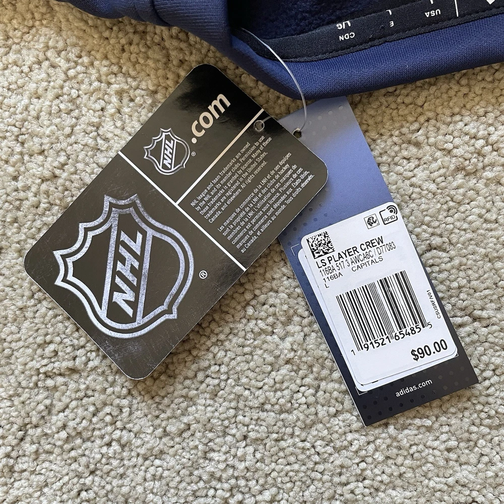 Step up your game day attire with the Adidas NHL Washington Capitals Long Sleeve Player Crewneck in a striking navy blue. Designed for the ultimate Capitals fan, this crewneck is both comfortable and stylish, featuring the team's colors and logo for a look that shows your support for the squad. The size large fits true to size, ensuring a great fit for your game day ensemble or casual outings. Officially licensed by the NHL, this sweatshirt signifies your allegiance to the Washington Capitals during the regular season and beyond. Crafted with quality materials, it's a staple for any hockey enthusiast looking to rep their team with confidence. Whether you're at the arena or enjoying the game from home, this Adidas crewneck is a perfect addition to your collection. MSRP $90