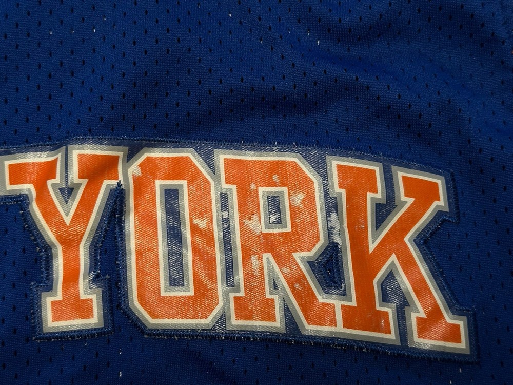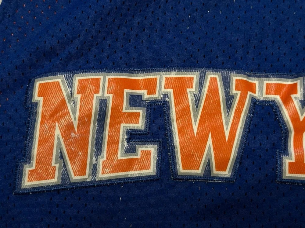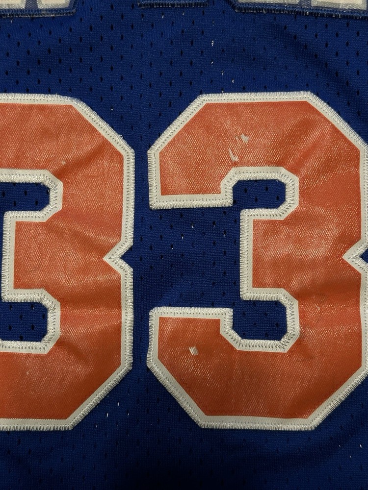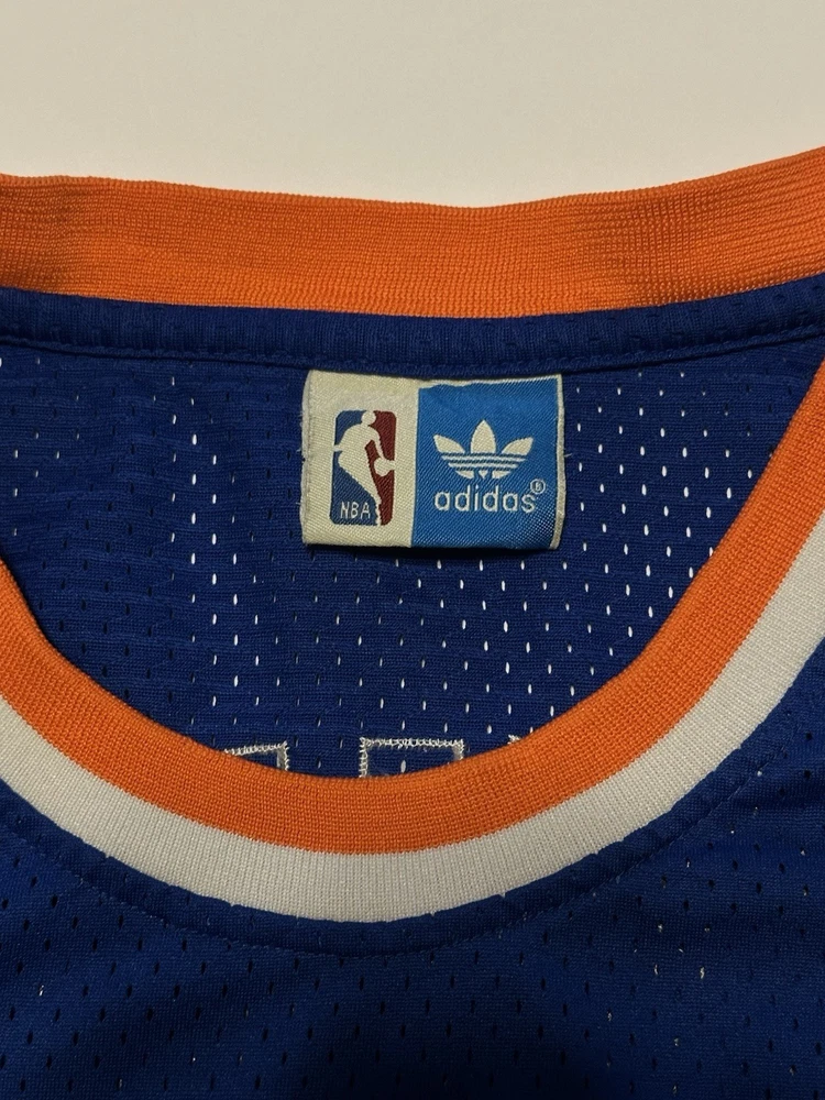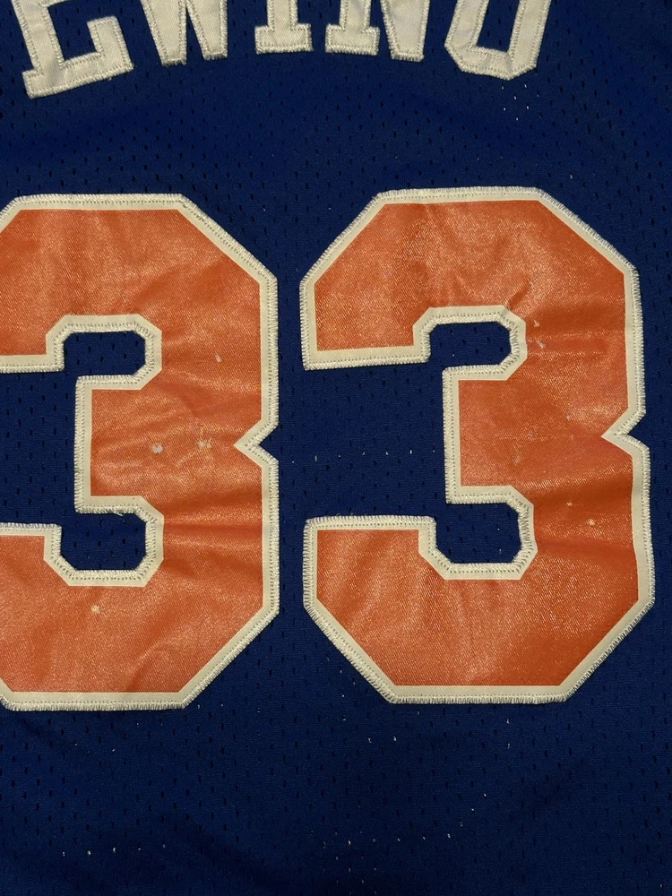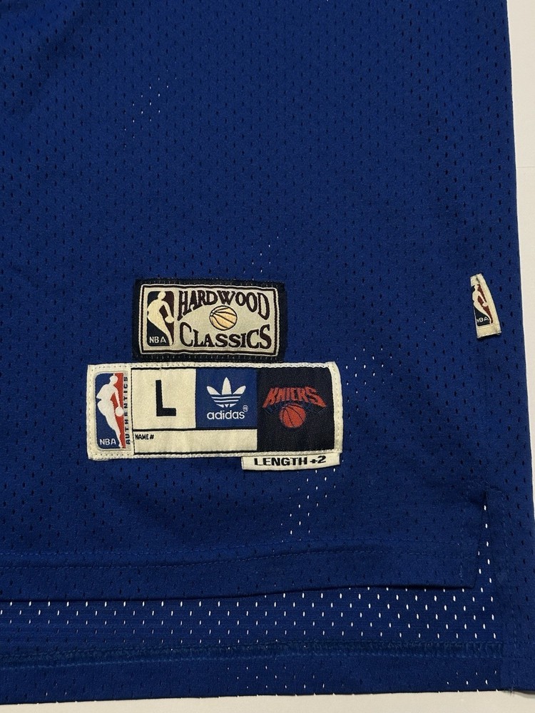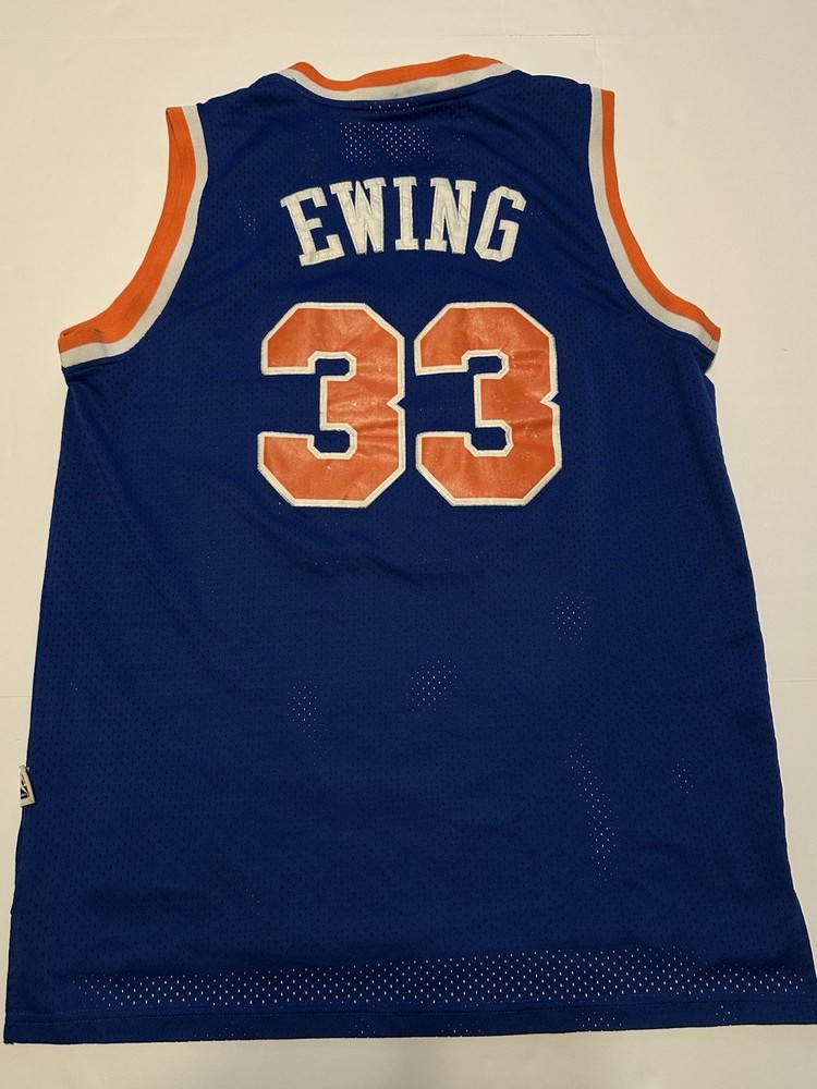 Preowned in good condition. 30 day free return. Please see pictures for physical details. Minor worn damages and small white marks/specks visible on the surface of the orange texts and numbers. The product is an Adidas New York Knicks Patrick Ewing jersey from the Hardwood Classics collection in size L. This officially licensed NBA jersey features the iconic blue color of the team and is designed for men who are fans of the New York Knicks. With the player's name and number displayed on the jersey, this piece of fan apparel is perfect for showcasing team spirit during the regular season games.