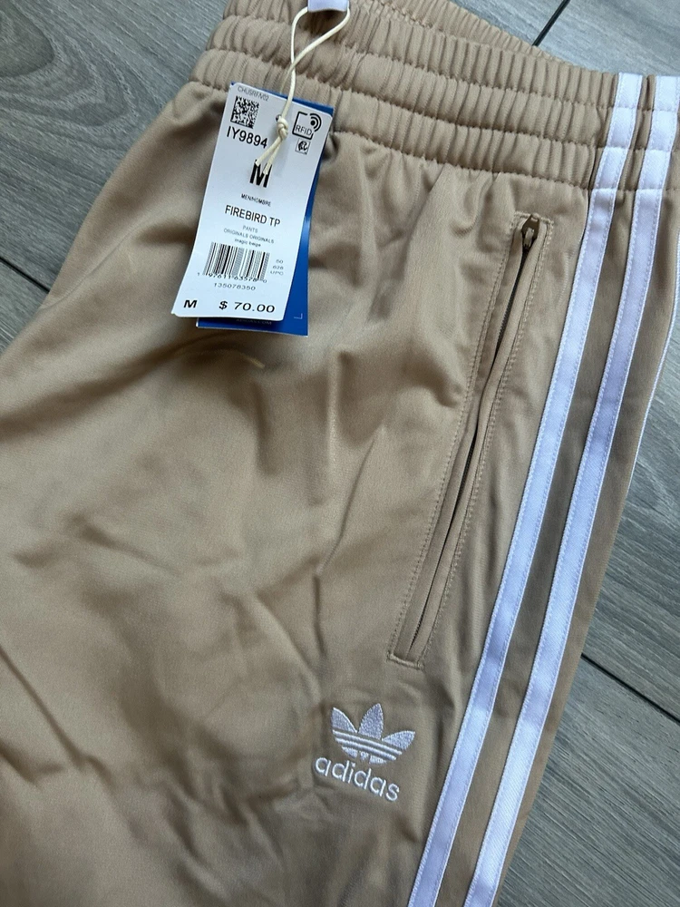 The Adidas Originals Track Pants in size Medium are made of 100% recycled polyester tricot fabric in a stylish tan color with a striped pattern. These jogger-style pants feature a drawstring closure, front zip pockets, and a drawcord on the elastic waist for a comfortable fit. The pants belong to the Adidas Firebird product line and are suitable for various occasions including travel, parties, casual outings, and workwear. Designed for men, these track pants have a regular fit and a straight leg style, making them ideal for activities like gym training, soccer, and running. NEW with TAGS . Pet&smoke free home. I have size medium & Large.