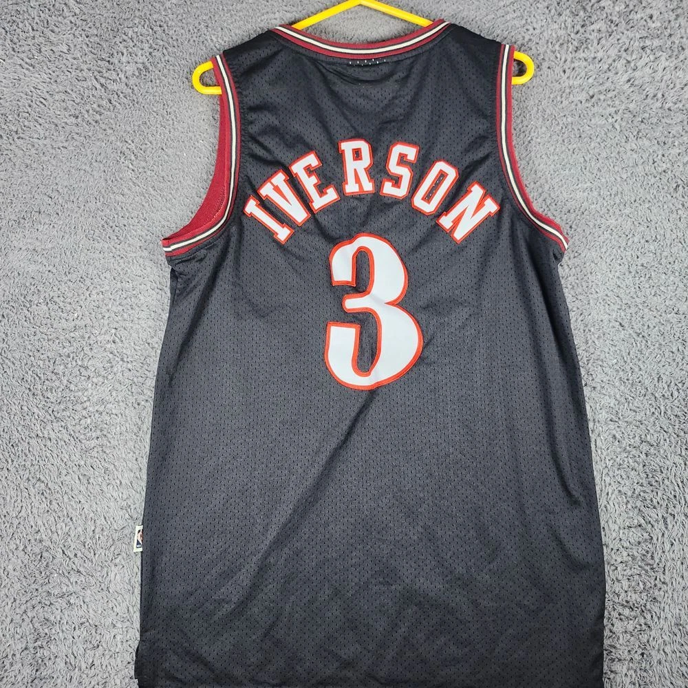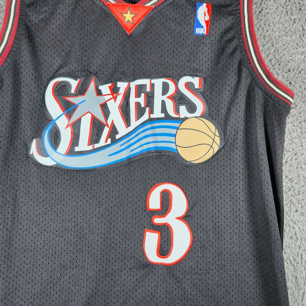 Classic Philadelphia 76ers jersey featuring the iconic Sixers logo with flowing basketball design. Perfect for game days, casual wear, or adding to your NBA collection. This authentic Hardwood Classics piece combines style and basketball heritage, ideal for true fans and collectors. Great for sporting events, pickup games, or displaying your team pride. Product: Jersey Team: Philadelphia 76ers Player: Allen Iverson Color: Black Keywords: Philadelphia 76ers, Sixers, NBA Jersey, Basketball Jersey, Hardwood Classics, Adidas NBA, Retro Jersey, Sports Memorabilia, Number 3, Mesh Jersey, Authentic NBA, Collectible Jersey