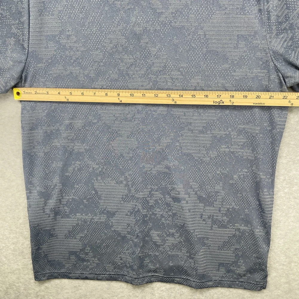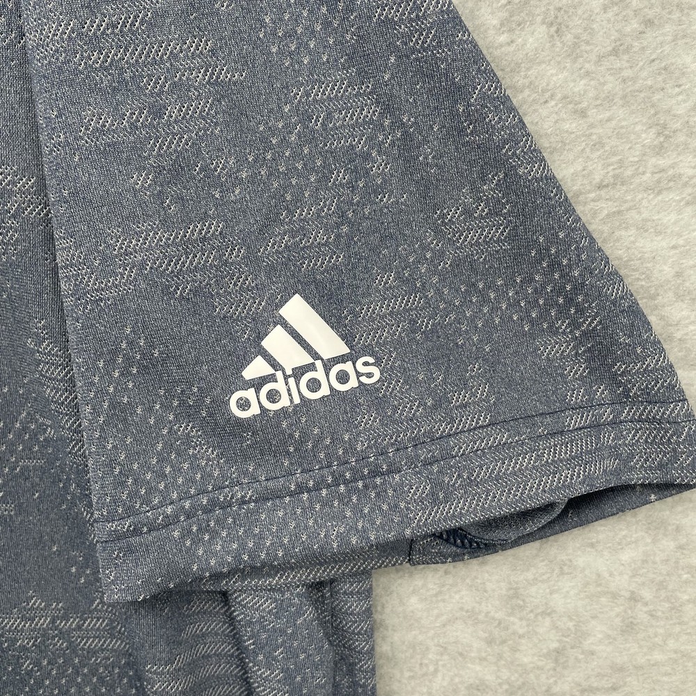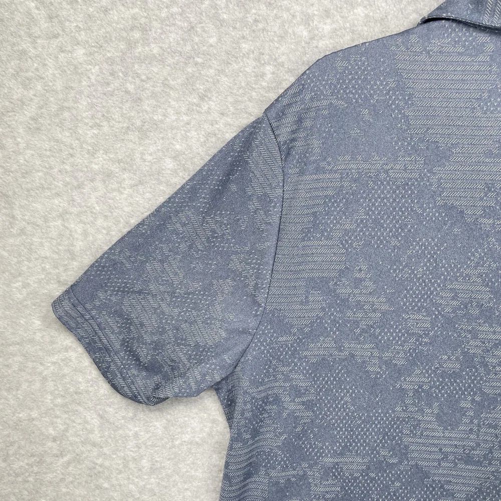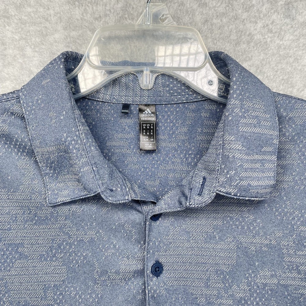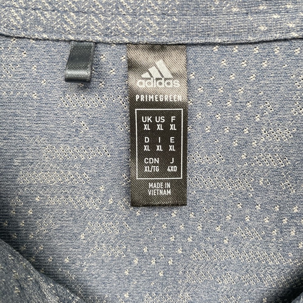 Adidas Primegreen Polo Shirt Camo Mens XL Blue Golf Short Sleeve Performance Condition: Gently worn, no visible flaws Material: Not specified on visible tags, lightweight Primegreen recycled polyester blend fabric Color: Heathered blue with subtle allover pattern Embroidered yellow golfer and MV logo on left sleeve, Adidas logo on right sleeve Collared neck with button placket Short sleeves Tag size: XL (Mens) Pit to pit: approximately 22 inches Length: approximately 31 inches Style code: GM0258 Date: 10/20 Made in Vietnam Machine washable, see tag for care details