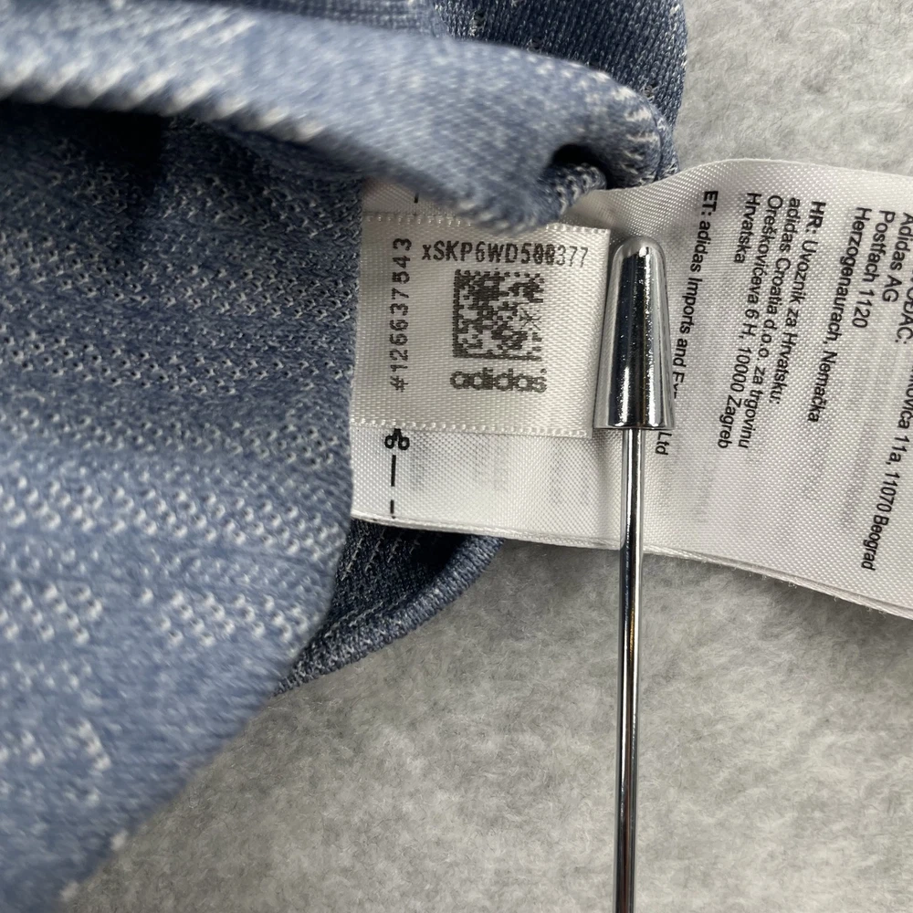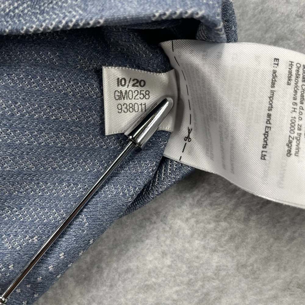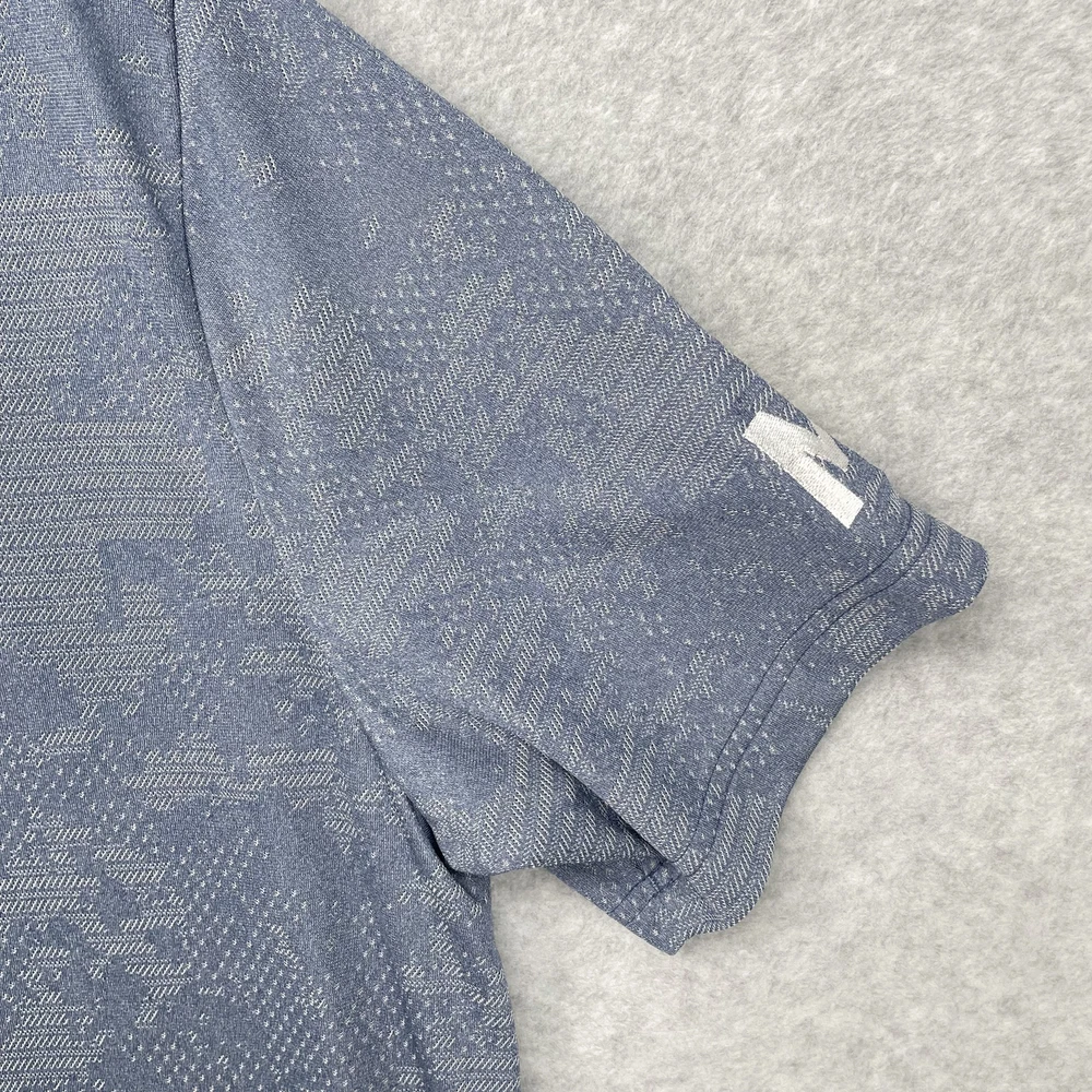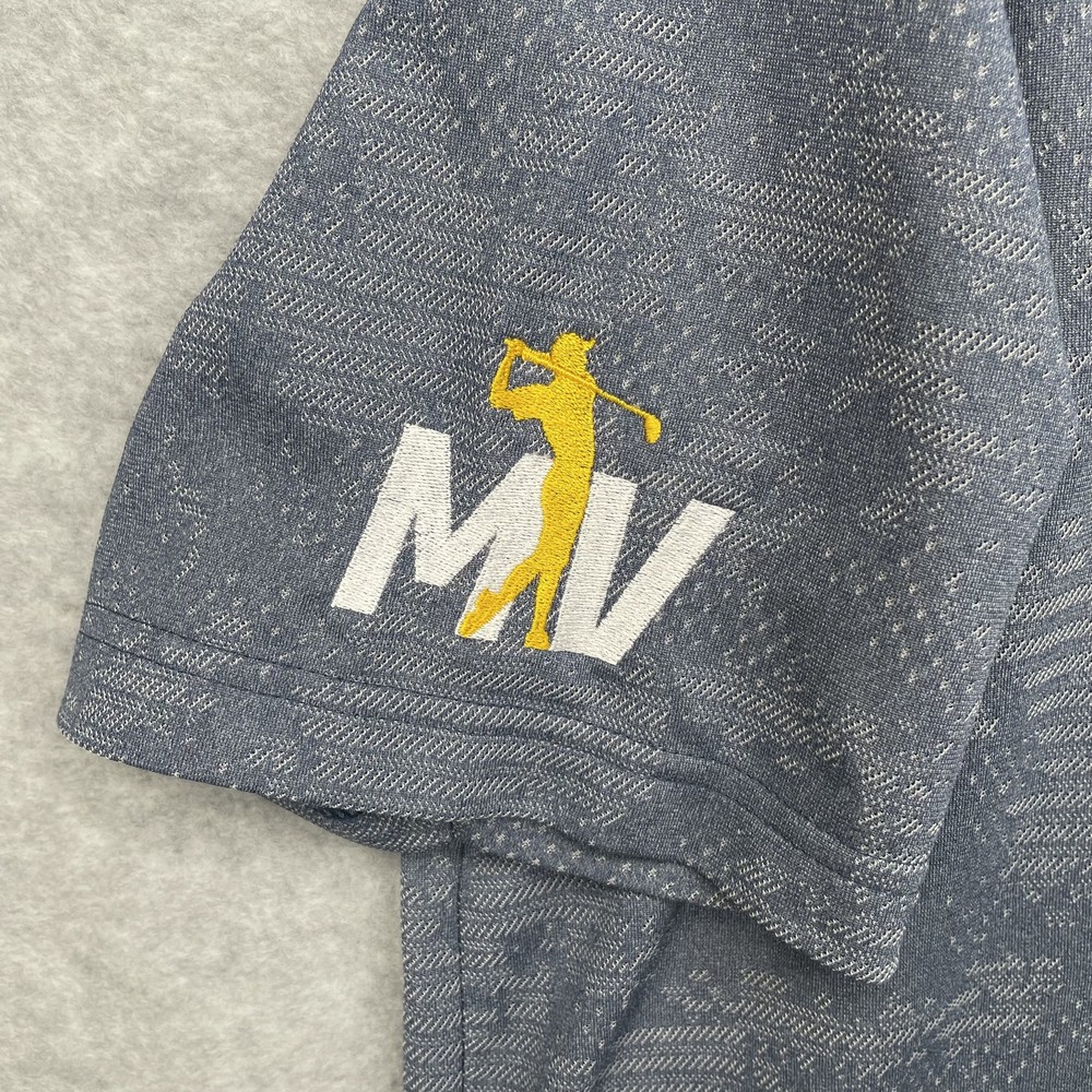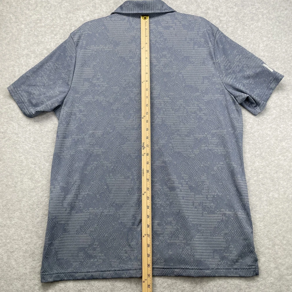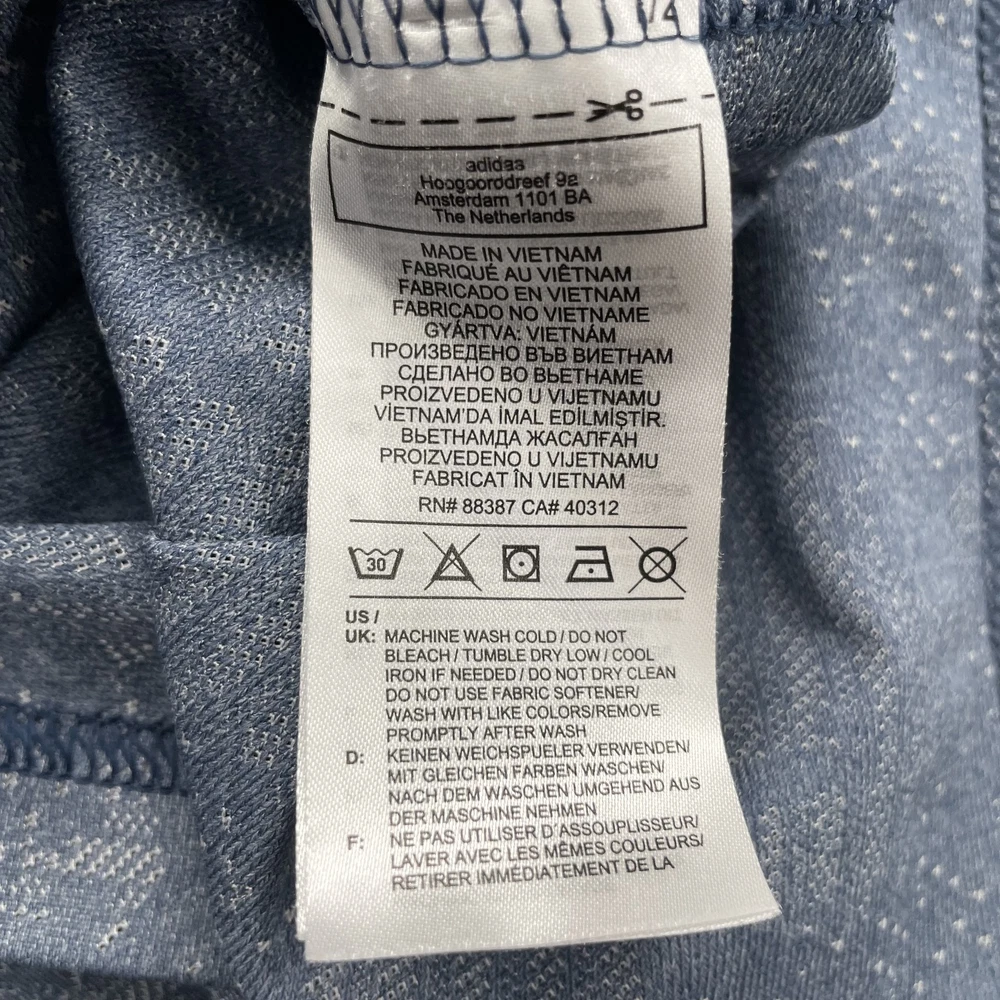 Adidas Primegreen Polo Shirt Camo Mens XL Blue Golf Short Sleeve Performance Condition: Gently worn, no visible flaws Material: Not specified on visible tags, lightweight Primegreen recycled polyester blend fabric Color: Heathered blue with subtle allover pattern Embroidered yellow golfer and MV logo on left sleeve, Adidas logo on right sleeve Collared neck with button placket Short sleeves Tag size: XL (Mens) Pit to pit: approximately 22 inches Length: approximately 31 inches Style code: GM0258 Date: 10/20 Made in Vietnam Machine washable, see tag for care details