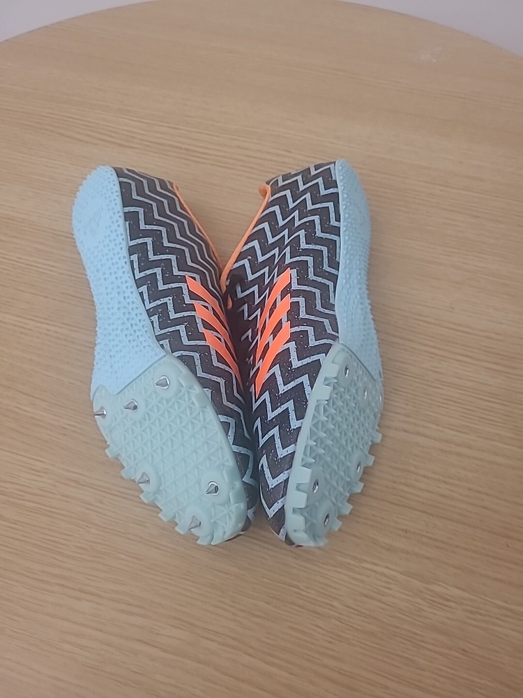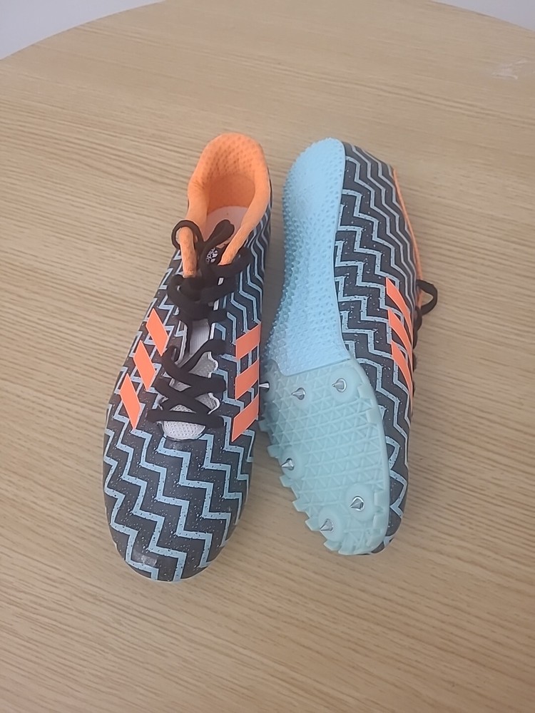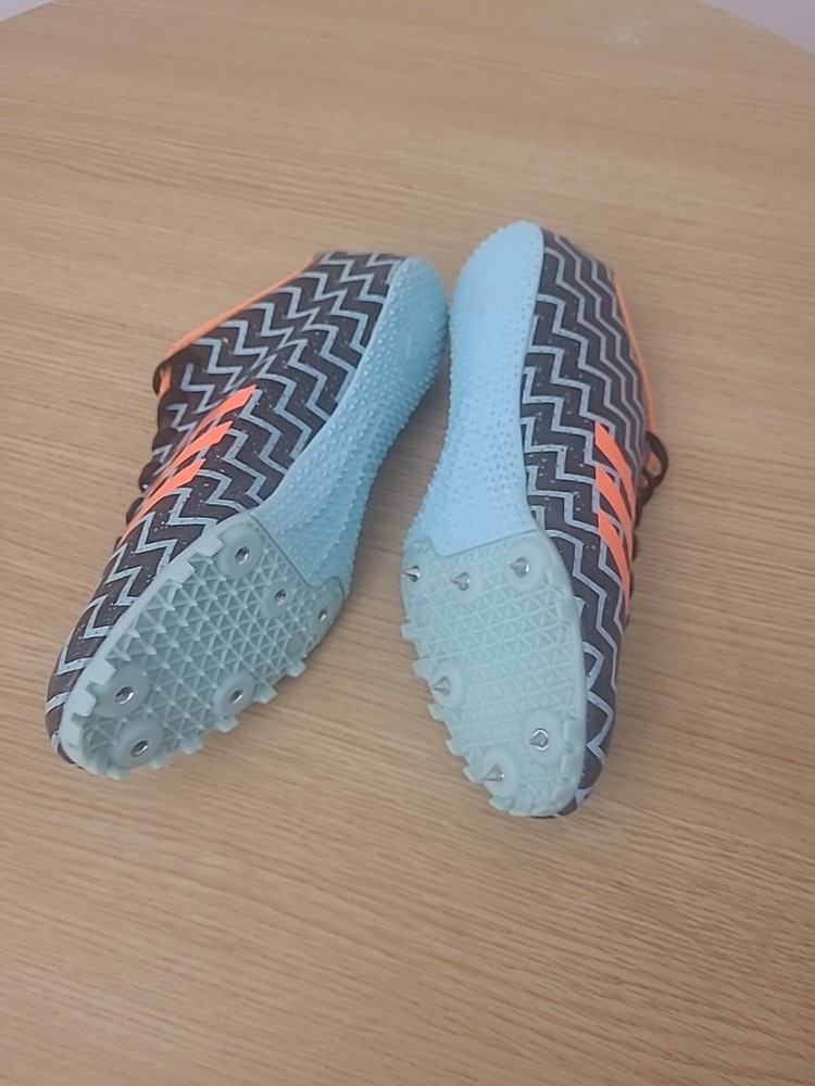 This Adidas Sprintstar Track Shoe is designed for women and is a size 9. It is a multicolor athletic sneaker made of 100% cotton. The shoe is missing spikes on one side, which may need to be replaced for optimal performance. The shoe is part of the Adidas Sprintstar product line, perfect for track and field activities.