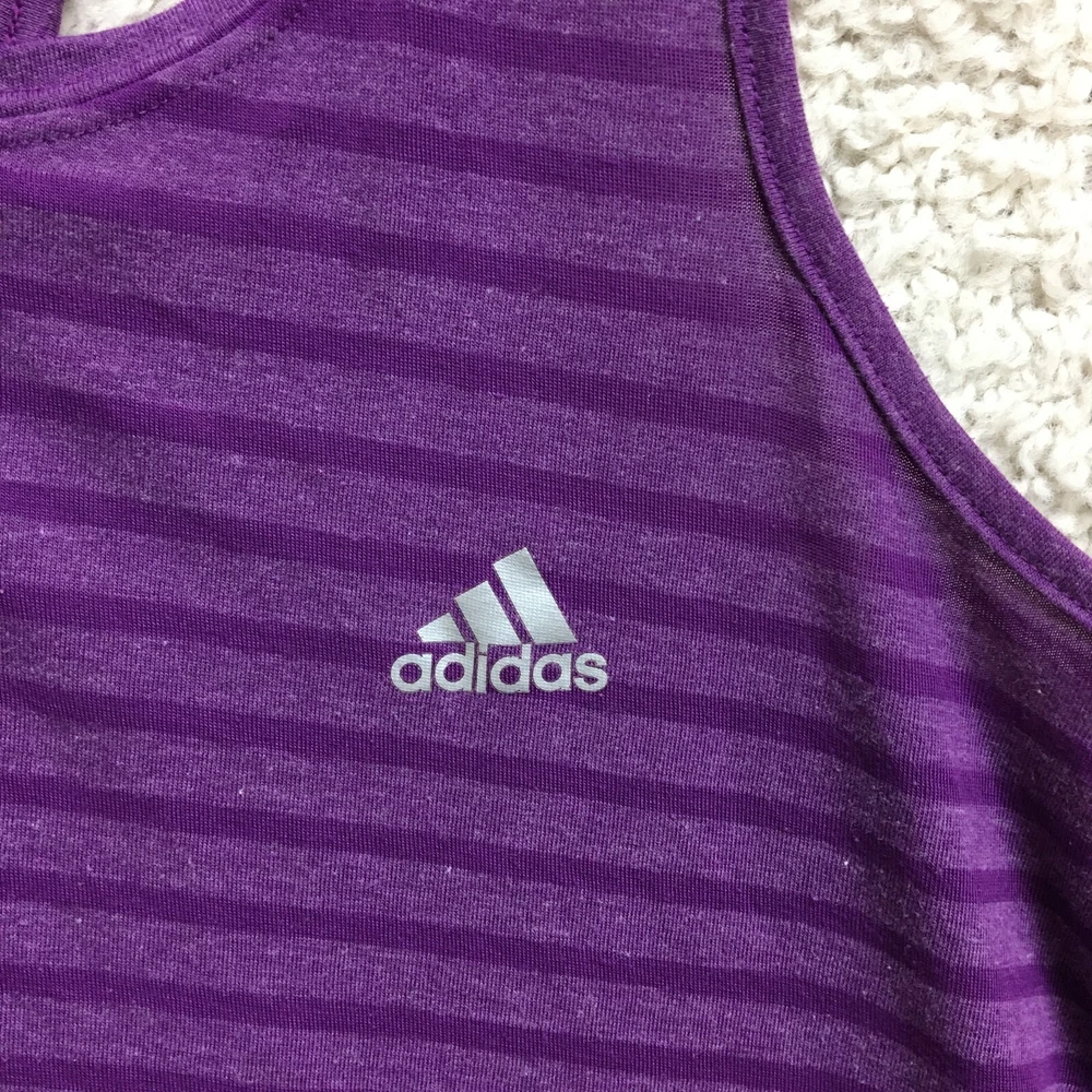 Fabric Wash: Medium Type: Tank Material: Cotton, Polyester Performance/Activity: Gym & Training, Running & Jogging, Walking Closure: Pullover Theme: Classic, Logo, Sports Style: Basic Size Type: Regular Fabric Type: Blended Fabric Neckline: Round Neck Garment Care: Machine Washable Size: M Season: Fall, Spring, Summer, Winter Country/Region of Manufacture: El Salvador Color: Purple Occasion: Activewear, Casual, Travel Pattern: Striped Sleeve Length: Sleeveless Features: Breathable, Collarless, Lightweight Sleeve Type: Casual Sleeve Seller Notes: “Very Good Used Condition. Please, See Pictures for Full Condition and Measurements.” Fit: Regular Strap Type: Racerback Brand: adidas Department: Women
