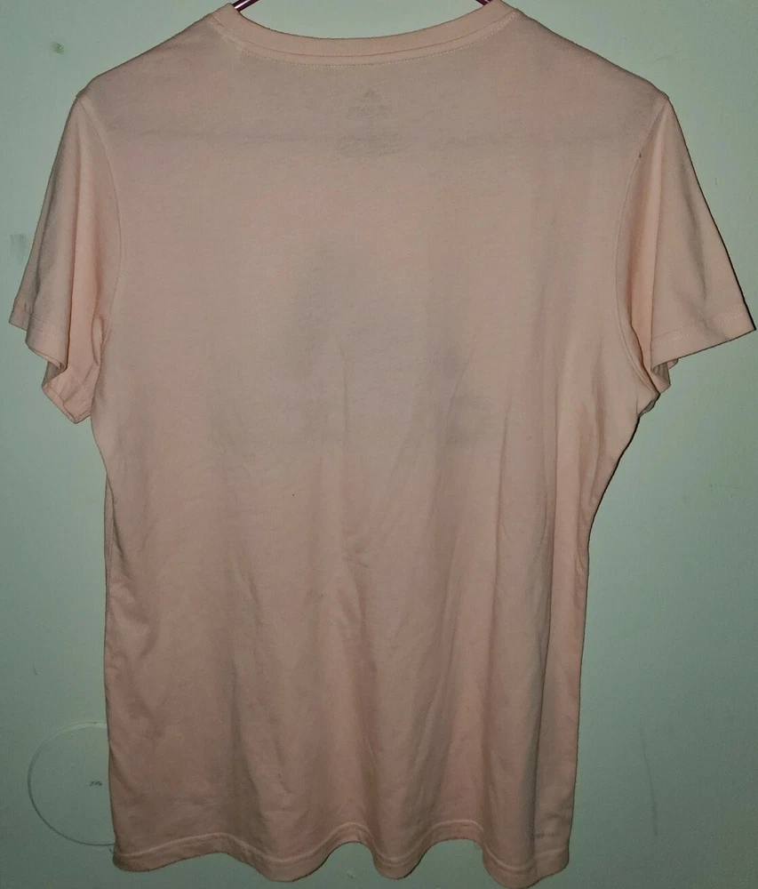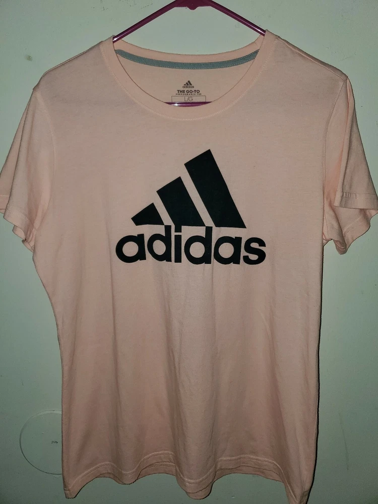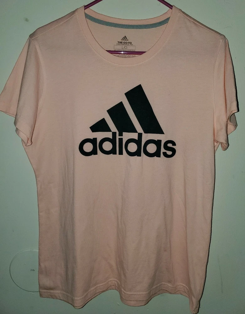 Adidas go to performance tee Womans Size Large...Not sure about the shade of this adidas shirt but its a really unique a cute shade obviously will go very well with black since adidas Logo Is Black.. I purchased this back in "2018" If you need additional photos or photos of shirt taken in natural Outside lighting please let me know.. This has a crew collar and has been Worn 2-3 times & was well taken care of.. Some very light piling on front but still has a ton of life left in it.. Really pretty color not sure of the shade to be honest.. Condition is "Pre-owned". Shipped with USPS First Class.