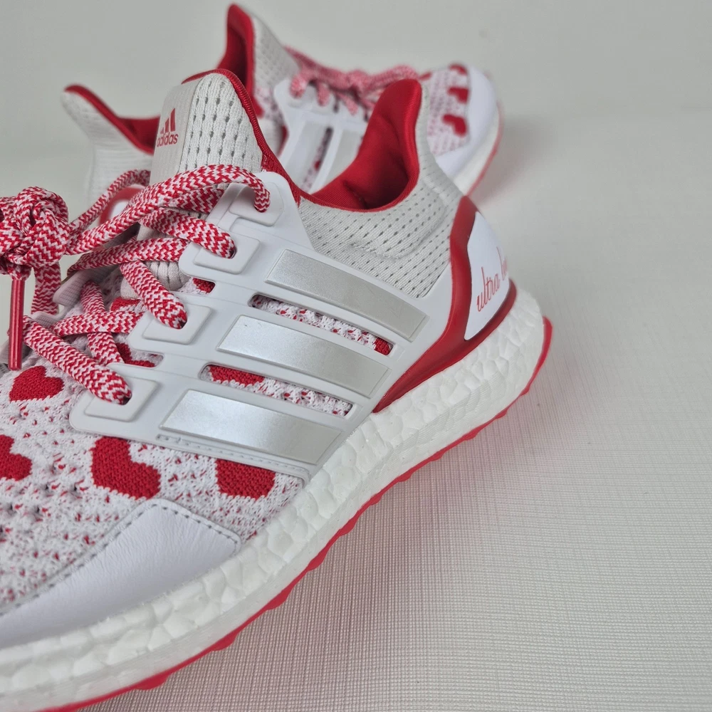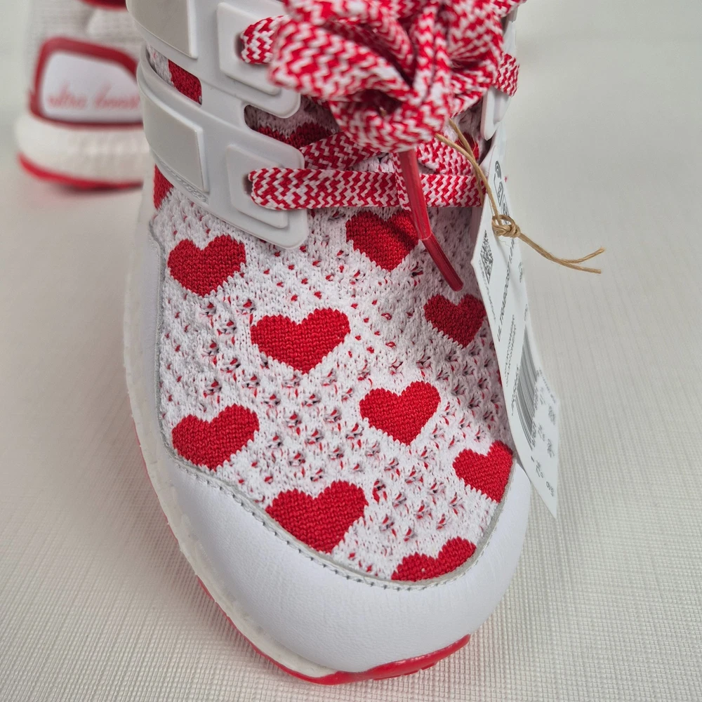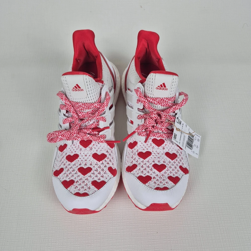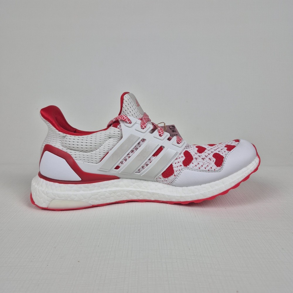The Adidas Ultraboost 1.0 Valentine’s Day Hearts Prime-knit Women's Size 9 JR5845 is a stylish and comfortable sneaker designed for women. Featuring a lace-up closure and a low-top shoe shaft style, these sneakers are ideal for activewear and casual occasions. The white and red color scheme with heart accents adds a touch of love and Valentine's theme to the design. Made with lightweight and cushioned features, these sneakers provide comfort for walking, cross-training, and running activities. Crafted with Primeknit+ upper material and a foam insole, the Adidas Ultraboost 1.0 is a fashionable and functional choice for women looking for a versatile and trendy shoe.