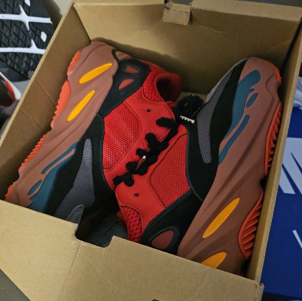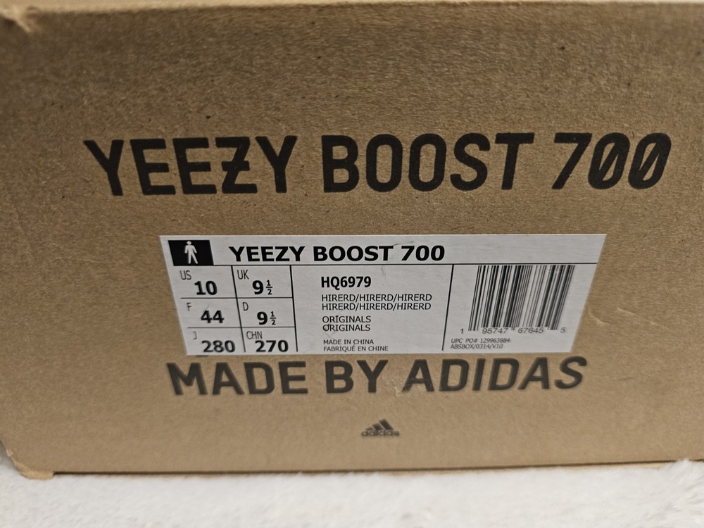 Elevate your style with the Adidas Yeezy Boost 700 in Hi-Resolution Red, a striking addition to any sneaker collection. The bold red suede upper catches the eye, complemented by the distinctive Yeezy silhouette that's become a hallmark of modern sneaker design. A true statement piece, these sneakers are designed for those who appreciate both form and function. Crafted for comfort and durability, the shoes feature the advanced cushioning of Boost technology, ensuring a comfortable experience with every step. The high-top design provides ankle support, making these sneakers not only stylish but also suited for a variety of activities. With their release in 2022, the Yeezy Boost 700 in Hi-Res Red are a contemporary choice for any fashion-forward individual. amazing shape.. not original laces