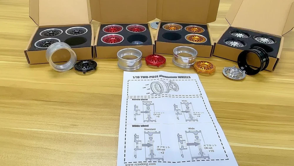 RC Car Wheels Adjustable Offset 1/2/3/4mm for 1/10 Drift On Road Touring Chassis Description Made of high quality aluminum, durable in use adjustable offset: +2mm / +4mm /+1mm / +3mm Quantity: 4pcs / Materials: Aluminum Outer diameter: 52mm / Width: 26mm / Hex:12mm Color: Black /Silver/Gold/Red Compatible with 1/10 Tamiya Series Car Models Using Narrow 26mm Tires Package List (Color Optional) 4pcs Aluminum Wheels 4pcs Carbon Fiber Wheel Ring Note: Assembly required. 2 types of o ffset can be achieved, depending upon the assembly method used.