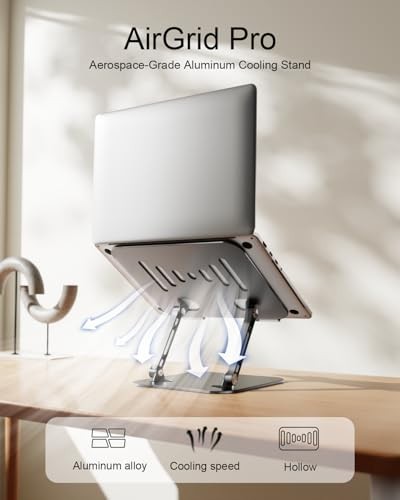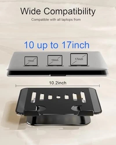 Ultimate Laptop Stand for Comfort and Convenience Transform your workspace with our versatile laptop stand, designed to enhance your productivity and comfort. Here’s why it’s the perfect addition to your home, office, or travel setup: WIDE COMPATIBILITY Compatible with all laptops from 10" to 17" Supports popular models including MacBook, Dell XPS, HP, Lenovo ThinkPad, Surface, Acer, ASUS, Samsung, Google Pixelbook, and Chromebook. Ideal for home, office, or travel use. STURDY & STABLE CONSTRUCTION Crafted from premium aluminum alloy for superior stability and durability. Features non-slip silicone pads and protective hooks to keep your device securely in place. Supports laptops up to 17 inches without wobbling. ENHANCED HEAT DISSIPATION Open structure design promotes airflow to prevent overheating. Keeps your device performing at its best while providing additional space underneath for a keyboard or mouse. ERGONOMIC ADJUSTABLE DESIGN Customize your viewing angle for optimal comfort and productivity. Adjustable height and tilt help reduce neck, shoulder, and back strain. Perfect for long hours of typing or video meetings. FOLDABLE & PORTABLE DESIGN Lightweight and easy to fold for convenient storage. Fits easily into your backpack or laptop bag for on-the-go use. Saves valuable desk space when not in use. COMPACT & TRAVEL-FRIENDLY <