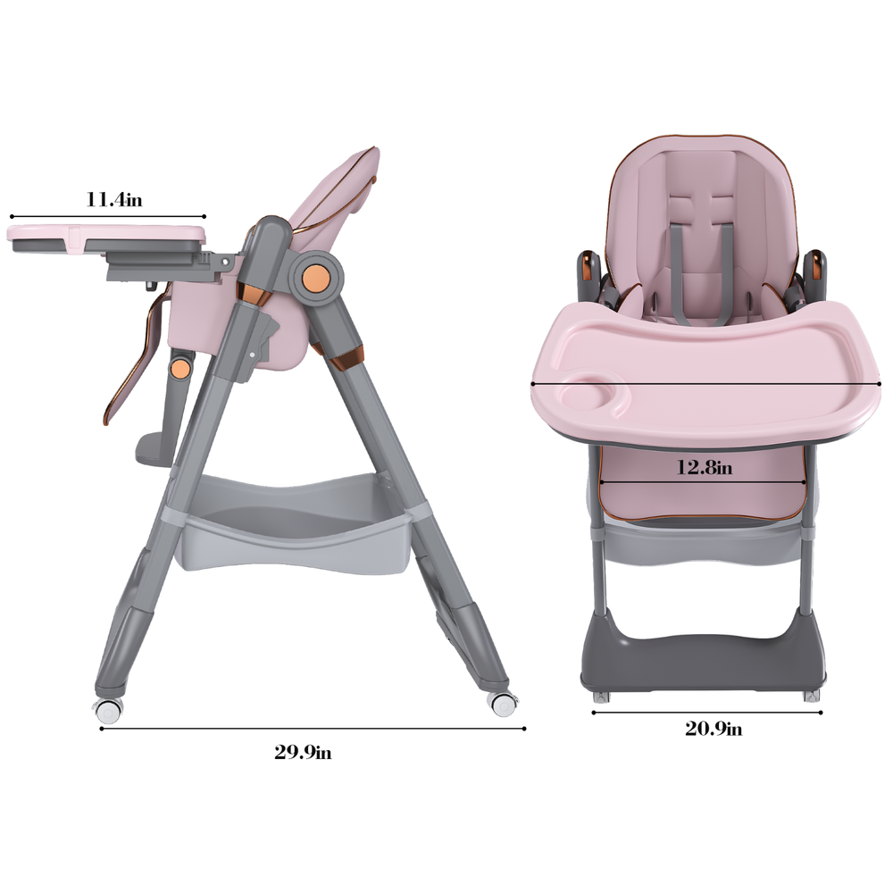 Specification Product Information Item Code: W2699P299044 Product Type: Single Box Product Product Name: Adjustable Baby High Chair 0-6 Years – Portable Infant Feeding Seat with Safety Belt, Silent Lockable Wheels & Easy-Clean Design for Home, Dining, Living Room, Bedroom (Pink) Place of Origin: China Main Color: Pink Main Material: Polypropylene Filler: PU Leather Product Style: American Design,Classic,Luxury Use Case: Dining Room Product Dimensions Assembled Length (in.): 19.30 Assembled Width (in.): 29.90 Assembled Height (in.): 37.40 Product Weight (lbs.): 12.35 Package Size Length (in.): 20.87 Width (in.): 12.20 Height (in.): 20.47 Weight (lbs.): 14.55 Product Features 【Multi-functional Foldable Baby High Chair】Portable dining seat for children aged 6 months to 6 years, featuring a detachable dual-layer tray (meal zone + play area) made of BPA-free food-grade PP material. 【5-Level Adjustable Feeding System】4-position tray adjustment, 5-height settings, and 3-position reclining backrest adapt to growing children , The inner diameter of the seat is widened to 12.8inch, giving your baby more room to move around 【Premium Safety & Comfort Design】Reinforced steel frame with anti-tip base, adjustable five-point safety belt,silent lockable wheels, and waterproof PU cushion with removable/washable seat pad for easy cleaning. 【Space-Saving Foldable Solution】One-second folding mechanism with included storage bag, ideal for home use and travel. Ergonomic design supports sitting/leaning positions. 【Developmental Dining Experience】FDA-compliant meal surfaces promote independent eating skills, while extra-deep tray prevents spills. Grows with child from infancy to pre-teen years. 【Effortless Assembly】You can assemble easily with the included instructions,And it won't take up too much of your time.