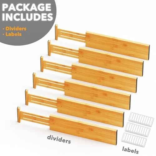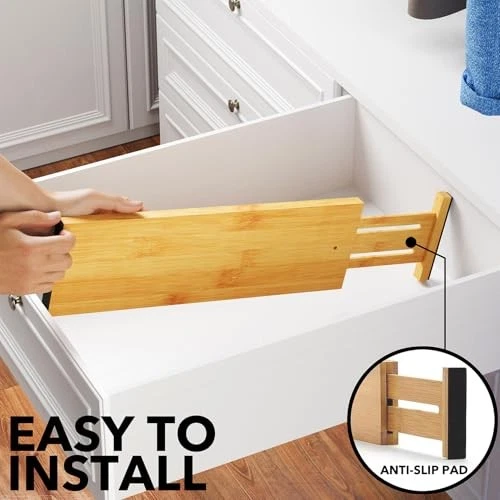 Return Policy Fast Delivery Trusted seller Bamboo Dresser Drawer Dividers 6 Pack, 4.65“ High Adjustable 17“-22” Drawer Organizers, Expandable Organization for Clothing, Clothes, Dressers, Natural Product Description 6 Drawer Dividers: Customize your dresser drawer with our dresser organizers; You can organize your clothes dresser with this 4.65 inches high drawer dividers 30 Label Stickers Included: Identify drawer contents instantly with this organizer label stickers set; Write directly on the label and stick it to the dividers; The preprinted arrow on the label helps you identify more efficiently Adjustable Expandable Organization: Each drawer divider is 4.65" wide, 0.6" thick and expandable from 17" to 22" in full length; Suitable for most drawers in your home, bedroom, bathroom, closet and office Drawer Dividers That Stay in Place: Strong spring-loaded design makes them sturdy dividers, with non-slip rubber pads in the end, keeping it stay put all the time and protect your drawers from scratches Easy Organization: Effortlessly sort clothing, accessories, office supplies, and kitchen utensils; Find what you need in seconds with our simple drawer organizers solution Shipping Returns Payment Shipping Shipping is FREE to all addresses other than APO/PO boxes in the lower 48 states. All our stock ships from US-based warehouses. Shipped via USPS or UPS (depending on location and package weight) Unless stated otherwise, all orders will ship within 24-72 hours of your payment being processed. Check our feedback to see the great reviews of FAST shipping we offer. Returns Seller does not accept returns Payment We currently accept payment via eBay managed payments only. Once payment is cleared, we will dispatch your shipment within 1-3 business days. Please refer to the "Shipping" tab for more information regarding shipping speed to your destination.