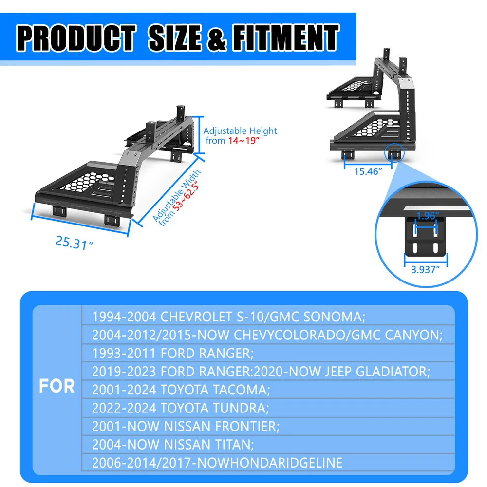 For Jeep Toyota Ford Chevy Full-size Pickup Trucks Adjustable Bed Rack Roll bar Description: The roll bar is 14-19'' tall from the bed rail to the top of the roll bar Adds utility and roll-over protection Improves the vehicleβs overall style. Brings a sporty appearance to your truck. Convenient to carry some outdoor gear. Adjustable design offers extension options for fitment to different sizes of trucks Adjustable mount width ranges from 53-62.5'' Textured black powder coat finish & premium E-coating process. Direct bolt-on installation. Comes with mounting hardware. Some wiring operation is required. Product weight: about 82.67 lbs FitmentοΌ For 1994-2004 Chevrolet S-10/GMC Sonoma; 1994-2004 Chevrolet S-10/GMC Sonoma; For 2004-2012/2015-2025 Chevy Colorado/GMC Canyon For 1993-2011/2019-2025 Ford Ranger For 2020-2025 Jeep Gladiator ; For 2005-2025 Toyota Tacoma For 2001-2025 Nissan Frontier For 2017-2025 Honda Ridgeline Specifications: Type: Truck Bed Roll Bar Material: Steel Color: Black Mounting Hardware: Included Adjustable Length: 53-62.5 inches Adjustable Height:14-19 inches Surface Finish: Black Powder Coated Finished Surface: Anti-corrosion Textured Powder Coating Packing Includes: 1x Truck Bed Roll Bar 1x set of Mounting Accessories Payment Delivery details Terms of sales About us Contact us Payment π We accept PayPal (Recommended), credit card, VISA, Google Pay & Discover etc. π Please submit your payment within 7 days after your purchase. π If not, eBay will automatically open an Unpaid Item Dispute on our behalf if the item(s) are not paid within 7 days. Delivery details π Please double check your delivery address and contact information. π All items will be shipped within 1 business days after payment received. π Tracking numbers will be easily accessible ASAP they are created and processed. Terms of sales π Free 30 days Return, we will cover the return post fee. π If a defective product was received, please do not hesitate to message us via eBay message. π We will response in 24 hours in business to resolve the problem π We stand behind our products. Items can be returned for exchange or full refund within 30 days from the date you receive. About us π Wolfstorm has a huge warehouse and office located in the United States. π All US domestic 48 states customers are able to benefit from the FREE SHIPPING services. π Our experienced, professional customer service representatives offers prompt and courteous service. π Best quality products, outstanding services and professional experience keep our customers. Contact us π Please feel free to contact us if you have any problems. π Emails will be replied within 24 hours in working days. π After hours emails will be replied on the next business day. On Mar 24, 2025 at 02:09:41 PDT, seller added the following information: