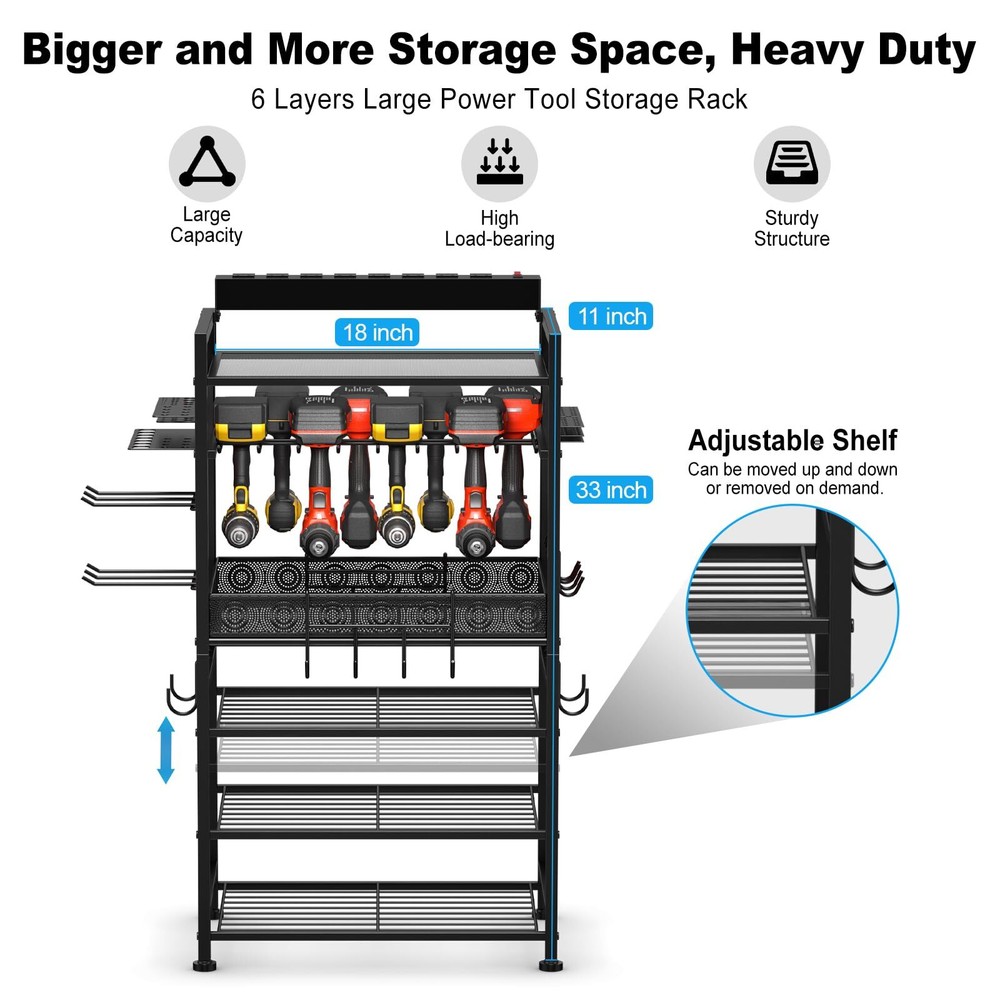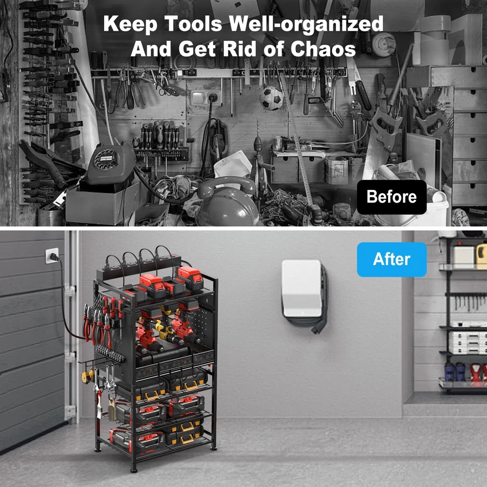 Adjustable Black Power Tool Organizer with Charging Station Storage Rack