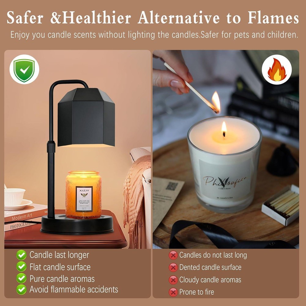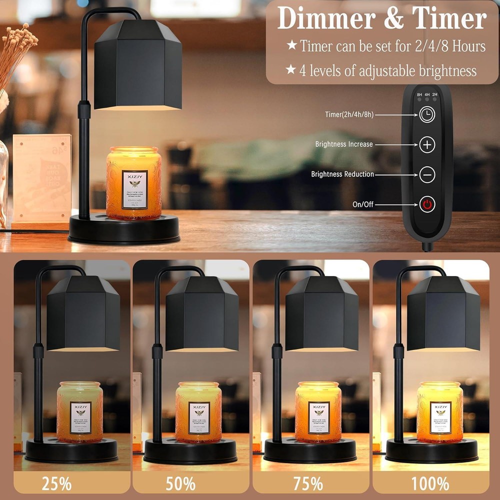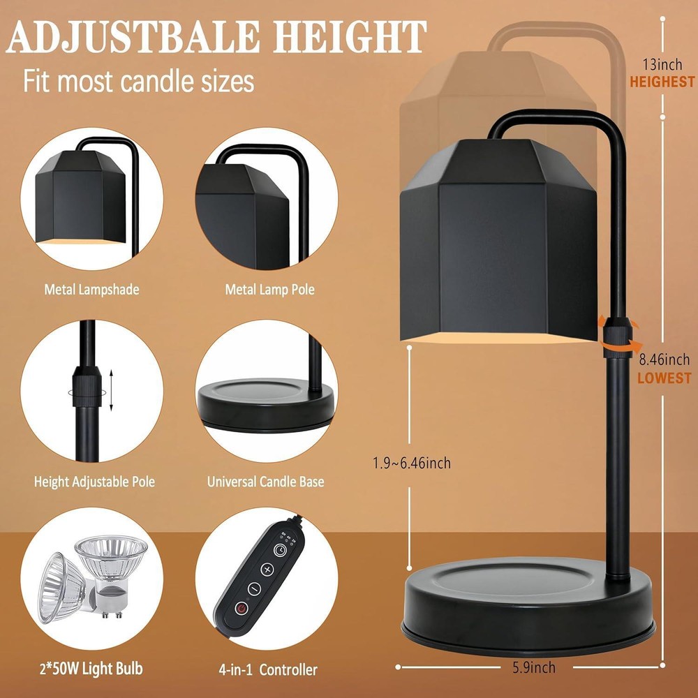Candle Warmer Lamp with Timer,Electric Candle warmer,Adjustable Height Dimmable Candle Warmer Lamp,Flameless Scented Candle Warmer,Compatible with Various Candles,Candle warmer for Home Decor,Black Base Material Metal Bulb Base E26 Lamp Type Candle Shade Material Metal Style Top 【Make Your Candles Last Longer】candle warmer lamp uses heat energy to melt candles and wax from top to bottom instead of lighting it,It will lasts twice as long as burning,It’ll save you money on candles, or, save you money to buy more candles. 【Candle Warmer Lamp With Timer】:If you always worried about starting a fire When you forgot to blow out a candle,This candle warmer takes away the worry. candle warmer is Flameless and Smokeless which will greatly reduces the risks of fire concerns and keep you away from any hazardous substances. 【Fit Most Candles】 candle warmer have a Large base,Which Can hold candles up to 5" wide and 6.3" tall, Enjoy the fragrance of your favorite scented jar candles such as the Yankee candles, Bath and Body Work 3 Wick Candles and more! Our candle warmer are engineered to last long so you can safely enjoy it for years 【Long Lasting Fragrance】🤩:This Candle warmer lamp uses heat energy to melt candles instead of burning it,It can evenly melts candle wax,The fragrance can last up to twice as long compared to burning it. 【Best Gifts】Candle warmer lamp will be the best gift choice to show your love to your families, lover, or friends .Elegant appearance and practical performance make this candle warmer birthday gifts for women, mothers day gifts for mom. Ideal for Mother's Day, Valentine's Day, Thanksgiving, Christmas gifts or other special occasions.