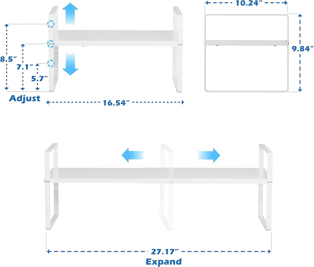 Store New Arrivals Add to Favorite View Feedback Contact Expandable Cabinet Shelf Organizer,Spice Rack Adjust Height Large Kitchen Cupboard Organizer Stackable Counter Shelf Expandable Shelves, Counter Pantry, White,3 Pack Description Style 现代 Number of Items 3 Material Metal Mounting Type Tabletop Mount Country of Origin China Unit Count 3 Count Room Type Office, Garage, Bathroom, Bedroom Weight capacity Maximum weight: 6E+1 Pounds Assembly Required Yes Product Dimensions 10.24"D x 10.24"W x 9.84"H Installation Type Countertop Product Name shelf Finish Type Powder Coated Specific Uses For Product Living Room, Bathroom, Kitchen, Garage Included Components screws, bolts Item Weight 16.13 pounds Number of Shelves 3 Special Feature Adjustable, Stackable & Foldable Weight Limit 6E+1 Pounds Shelf Type Metal Shape Rectangular Color White Furniture Finish White Recommended Uses For Product Garage, Bathroom, Kitchen, Living Room Product Care Instructions Wipe with Dry Cloth Size 16.54” to 27.17”Wx 10.24”D x 9.84”H-3PCS Expandable Length -Measure:16.54” to 27.17”Lx 10.24”W x 9.84”H,the length of the shelf organizer can be stretched from 16.54 inches to 27.17 inches. Adjustable Frame Plate Height-The height of four layers can be adjustable for placing products of different heights.you just need to loose or tight the screw to control the height of metal frame. Vertical Stackable Design-The shelves can be stacked as double layeror use it alone. Save your space and perfect for the office,Ktchen, living room, bedroom, wardrobe, garage, bathroom, and more. Durable Structure Surdy Material-Shelf can bear 60 lbs.Cabinet shelf is made of sturdy metal with anti rust coating,there is a metal support rod at the bottom of metal plate,it can ensures the shelf didn’t get collapse. Easy to assemble. Using high polishing anit-rust coating technology which make shelf can use for many years and easy to take care. If you received the package missing parts (screws ,bolts) or defective product, please we will send you the ASAP. Product Description SANNO Expandable Cabinet Shelf Organizer Rack Make easier access, better visibility of your stuff, and more efficient use of their cabinet space! DIMENSIONS COLOR:White MATERIAL:Metal SIZE:16.54"W × 10.24"D × 9.84"H MAX EXTENDABLE WIDTH:27.17"W ADJUSTABLE HEIGHT:5.7"/7.1"/8.5"H SUPERIOR DETAILS ADJUSTABLE Four levels of adjustable height can avoid the situation that you want to put things on the lower level and the height is not enough. STACKABLE You can easily stack two shelves together with just the screws, making perfect use of your unused top space and doubling the storage space. STABLE Two layer fixed by two screws can make the shelf installation more sturdy and solid.So that it will not shake easily. DURABLE The shelf is made of sturdy metal with rust-resistant coating. Support rods and screws ensure that the shelf will not collapse inward. MULTI-USE For Kitchen This cabinet shelf will keep your kitchen organized and sturdy enough to carry pots and pans or other heavy items.You also can use it as a cupboard organizer. For Office Use it in a office or study to store printer, papers, books,or makeup in an organized manner and save countertop space. For Entrance Hall This shelf is placed in the entryway to use as a shoe rack to keep your shoes organized and save space in the entryway. For Toolroom You can store screwdrivers, toolboxes, glue, paint and other tools on this shelf. And you can find what you need at a glance, very convenient. What is the width of this shelf? The size of this shelf is 16.54"W × 10.24"D × 9.84"H when folded and 27.17"W when fully extended. You can adjust it between 16.54"W and 27.17"W according to your needs. Is this shelf easy to rust? Not really. The surface of the shelf is covered with a coating, so it does not rust easily. It will remain in good condition after a long time of use. Others Shelves Add to Cart Add to Cart Add to Cart Add to Cart Add to Cart Add to Cart Customer Reviews 4.3 out of 5 stars 710 4.3 out of 5 stars 710 4.3 out of 5 stars 710 4.3 out of 5 stars 710 4.3 out of 5 stars 710 4.3 out of 5 stars 710 4.3 out of 5 stars 710 Price $26.99 $ 26 . 99 $29.99 $ 29 . 99 $49.70 $ 49 . 70 $49.90 $ 49 . 90 $66.70 $ 66 . 70 $59.99 $ 59 . 99 — Color White Black White Black White Black Black Material Metal Metal Metal Metal Metal Metal Metal Size(collapsed) 16.54"W × 8.07"D × 9.84"H 16.54"W × 10.24"D × 9.84"H 16.54"W × 8.07"D × 9.84"H 16.54"W × 10.24"D × 9.84"H 16.54"W × 8.07"D × 9.84"H 16.54"W × 10.24"D × 9.84"H 16.54"W × 8.07"D × 9.84"H Fully Extended Width 27.17"W 27.17"W 27.17"W 27.17"W 27.17"W 27.17"W 27.17"W Depth 8.07"D 10.24"D 8.07"D 10.24"D 8.07"D 10.24"D 8.07"D Quantity 1 1 2 2 3 3 1 ABOUT US We offer the best prices around on high quality products. Our E-store includes media such as books, movies, music and games while offering electronics, toys, sporting apparel, clothing, tools, general home, garden items and more. SHIPPING We are always working hard to ensure your package arrives as soon as possible. Please understand that some factors like weather, high postal traffic, and the performance of shipping companies are outside of our control. We offer free shipping to the lower 48 states and ship within 2 business days of payment, usually sooner. We do not accept P.O. Boxes. Please provide a physical address. For shipping outside of the continental USA, we only use eBay's Global Shipping Program.The item is shipped to KY and then sent to the rest of the world. International customers are responsible for all duties and taxes. Continue to check out in order to calculate costs for shipping the item to your country. Messages regarding eBay's Global Shipping Program MUST be directed at eBay EXCLUSIVELY. RETURNS We offer a 30-Day Return Policy on items which you are not completely satisfied with. You have the option for a full-refund or an exchange of the item. No returns are available on ite