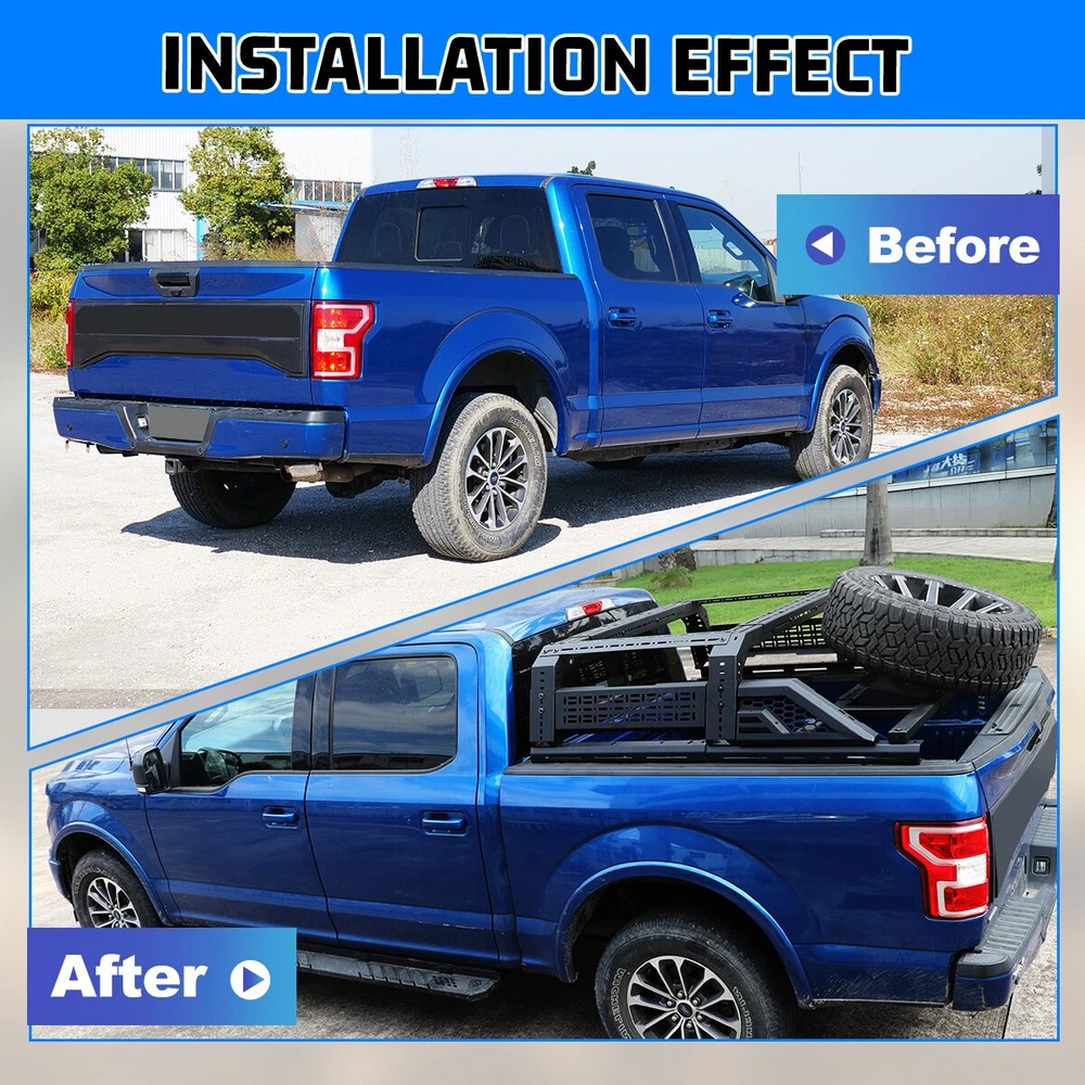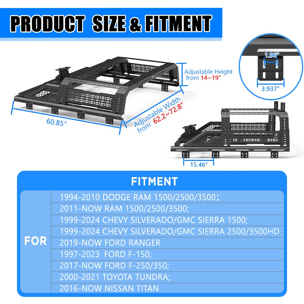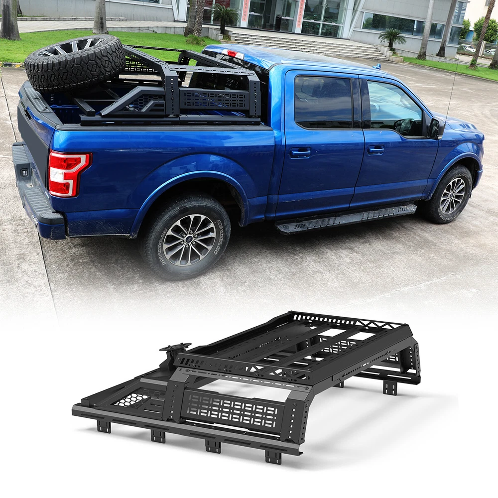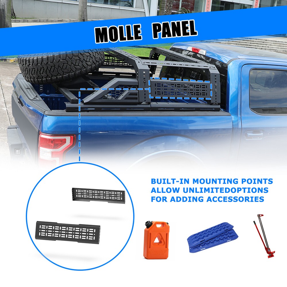 Store Categories Other Car Refrigerator Front Bumper Rear Bumper Fender Flares Inner Fenders Side Steps Running Board A-Pillar Light Mount Brackets Headlights Taillights Fog Lights LED Headlights LED Taillights LED Fog Lights Jeep Chevrolet Ford Toyota Dodge GMC More Roll Bar: https://www.ebay.com/itm/405272971219 https://www.ebay.com/itm/405256884904 https://www.ebay.com/itm/405270551962 Modular Overland Bed Rack (Front) Features: Mounting Base: ✴ Compatible with most retractable, roll-up, and folding bed covers. ✴ Bed covers will not be able to fold completely back. ✴ Can be secured by punching holes in the bed shoulders or Locked to factory side rails. LED Light Mounting Bracket: ✴ Pod light or Light Bar can be installed ✴ Adjustable position of mounting bracket ✴ Adjustable height range of 4.84-7.6inches Side Rail Mounting Bracket : Compatible with factory bed rail. Decorative Bezel: Honeycomb Mesh Allows DIY colour spraying. Modular Overland Bed Rack (Mid) Features: Mounting Base: ✴ Compatible with most retractable, roll-up, and folding bed covers. ✴ Bed covers will not be able to fold completely back. ✴ Can be secured by punching holes in the bed shoulders or Locked to factory side rails. ✴ SpareTyre Carrier can be installed above the base. Side Rail Mounting Bracket: Compatible with factory bed rail. Connection bracket: Connect to the Bed Rack(Front) Molle Panel Features: ✴ Side panels w/ plenty of long holes cutouts for adding accessories. Mount anything from lights, recovery tracks,jerry can,farm jack, fire extinguisher, bike mounts, etc. ✴ 2mm steel Construction. Spare Tyre Carrier Features: ✴ Can be mounted directly on the bed, but requires pre-punched holes and installation of the rivet nut. ✴ Compatible with most off-road tire. ✴ Available in 5mm steel plate. ✴ Width adjustment range 66.2-74.8 Inches. Compatibility ✴ For 1994-2010 Dodge Ram 1500/2500/3500; ✴ For 2011-2025 RAM 1500/2500/3500 (Not compatible for models with RamBox) ✴ For 1999-2025 Chevy silverado/GMC sierra 1500/2500HD/3500HD ✴ For 1997-2025 Ford F-150; ✴ For 2017-2025 Ford F-250/350 Super Duty; ✴ For 2000-2021 Toyota Tundra; ✴ For 2004-2024 Nissan Titan/Titan XD Specification ✴ Color: Black ✴ Materials: Q235A ✴ Placement on Vehicle: Rear ✴ Installation: Bolt-on, ✴ Attachment Type: Screw-On ✴ Items Included: Mounting Hardware ✴ Surface Finish: Black Powder Coated Steel ✴ Fitment Type: Direct Replacement ✴ Adjustable Width: 62.2~72.8 inch ✴ Adjustable Height : 14-19 inch ✴ Modular Overland Bed Rack (Front) Package Size: 33.66 *25.59*10.63 inch ✴ Modular Overland Bed Rack (Front) Package Weight: 82.67lbs ✴ Modular Overland Bed Rack (Mid) Package Size: 33.66*25.59*6.69 inch ✴ Modular Overland Bed Rack (Mid) Package Weight: 52.91 lbs ✴ Spare Tyre Carrier Package Size: 33.46*17.71*12.6 inch ✴ Spare Tyre Carrier Package Weight: 81.57 lbs ✴ Molle Panel Package Size: 27.56*7.87*5.51 inch ✴ Molle Panel Package Weight: 11.02 lbs Package List ✴ 1*Modular Overland Bed Rack (Front) ✴ 1*Modular Overland Bed Rack (Mid) ✴ 1*Spare Tyre Carrier ✴ 1*Molle Panel ✴ 1*Set of Mounting Accessories Payment Delivery details Terms of sales About us Contact us Payment We accept PayPal, credit card , Apple Pay & Google Pay etc. Delivery details All items will be shipped within 1-3 business days after payment received, we will try our best to ship out as soon as we can, hope for your understanding. Please double confirm your address and contact information, which will help the delivery faster and more accurately. Note :buyers who purchase international products need to pay import tariffs!!! Terms of sales Professional installation is highly recommended. Any problem of the item please feel free to contact us first , please D o Not leave negative feedback before that, or simply return it within 60 Days in original condition. We will resolve it for you ASAP. About us Any questions please do not hesitate to contact us directly by eBay message . We will reply you within 24 hours asap, thanks for your understanding. Contact us Should you have any problem or require any further information please feel free to contact us . If you are satisfied with our product and service, please kindly leave us a positive feedback. Popular Categories