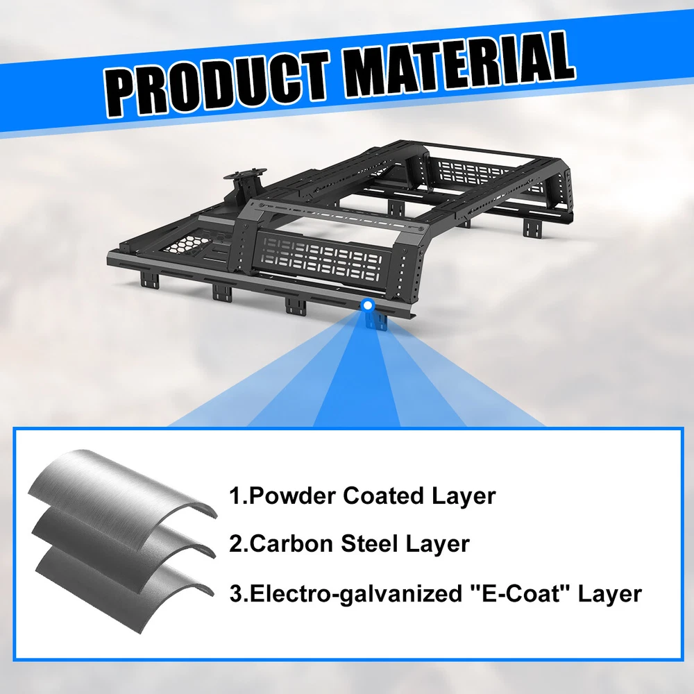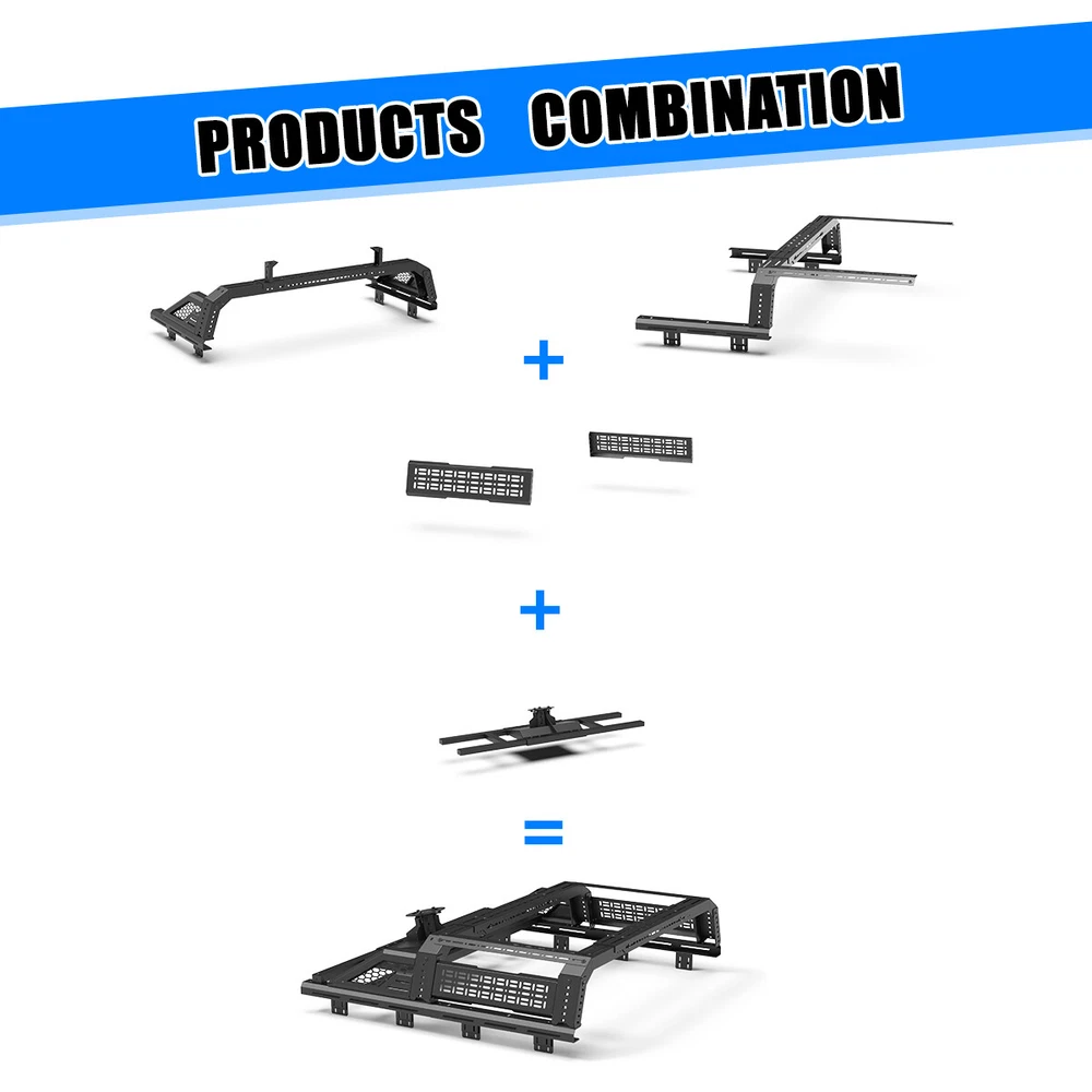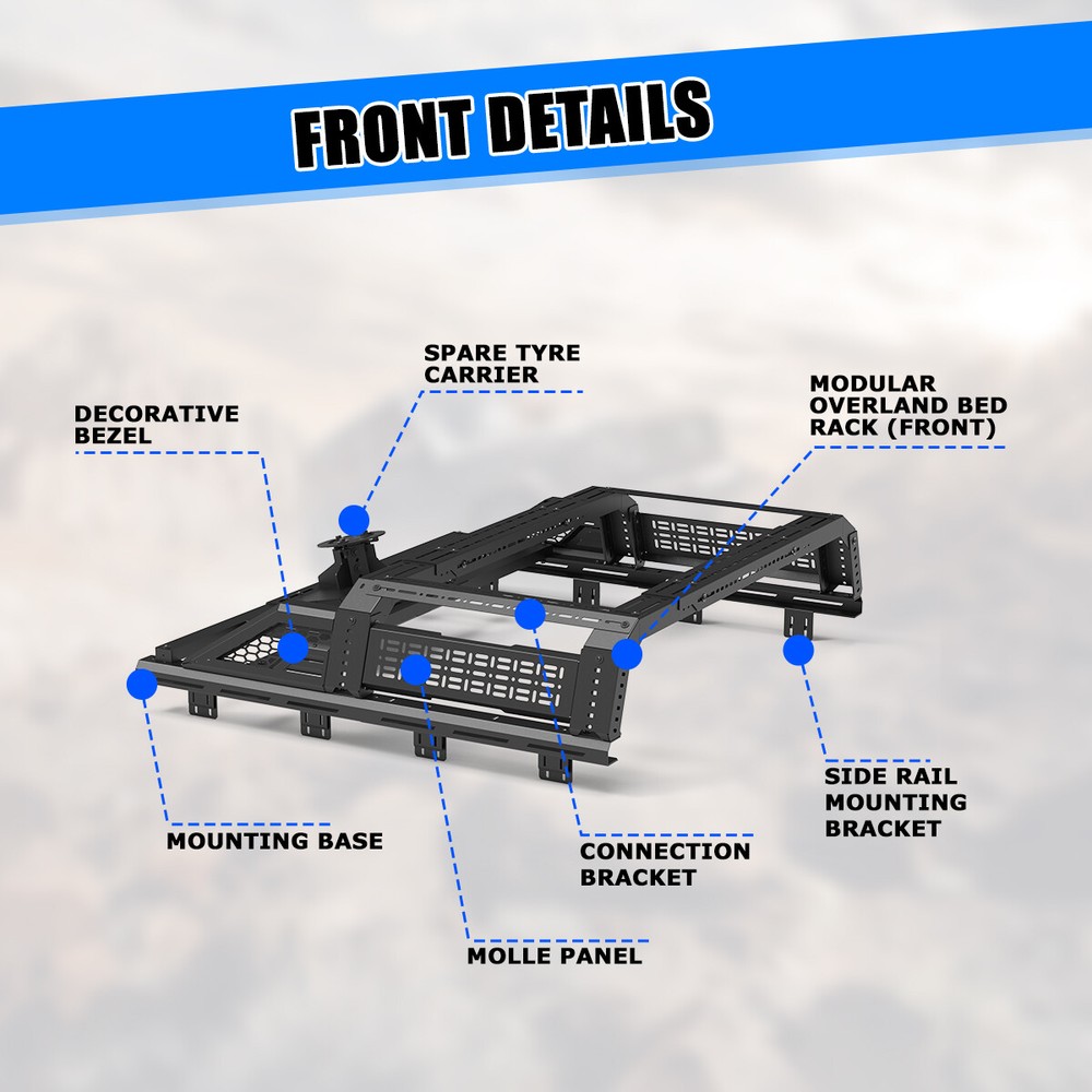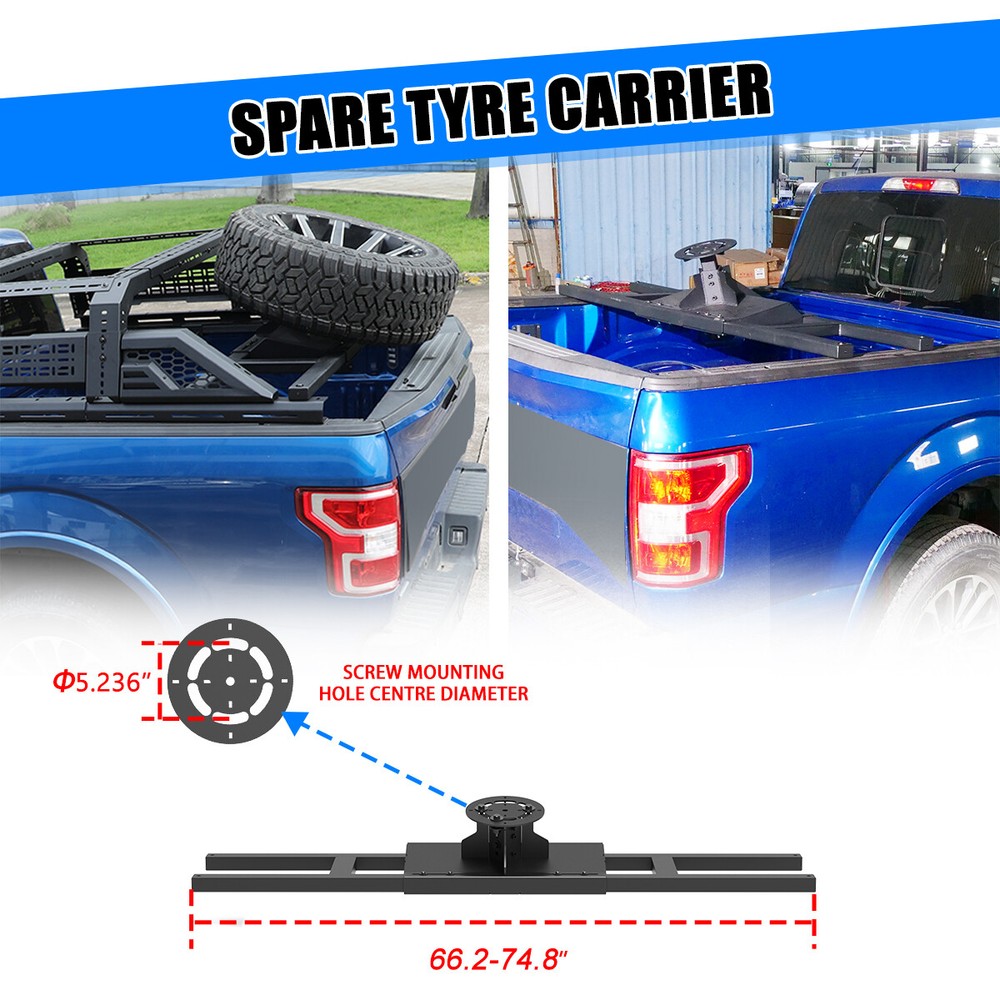 Store Categories Other Car Refrigerator Front Bumper Rear Bumper Fender Flares Inner Fenders Side Steps Running Board A-Pillar Light Mount Brackets Headlights Taillights Fog Lights LED Headlights LED Taillights LED Fog Lights Jeep Chevrolet Ford Toyota Dodge GMC More Roll Bar: https://www.ebay.com/itm/405272971219 https://www.ebay.com/itm/405256884904 https://www.ebay.com/itm/405270551962 Modular Overland Bed Rack (Front) Features: Mounting Base: ✴ Compatible with most retractable, roll-up, and folding bed covers. ✴ Bed covers will not be able to fold completely back. ✴ Can be secured by punching holes in the bed shoulders or Locked to factory side rails. LED Light Mounting Bracket: ✴ Pod light or Light Bar can be installed ✴ Adjustable position of mounting bracket ✴ Adjustable height range of 4.84-7.6inches Side Rail Mounting Bracket : Compatible with factory bed rail. Decorative Bezel: Honeycomb Mesh Allows DIY colour spraying. Modular Overland Bed Rack (Mid) Features: Mounting Base: ✴ Compatible with most retractable, roll-up, and folding bed covers. ✴ Bed covers will not be able to fold completely back. ✴ Can be secured by punching holes in the bed shoulders or Locked to factory side rails. ✴ SpareTyre Carrier can be installed above the base. Side Rail Mounting Bracket: Compatible with factory bed rail. Connection bracket: Connect to the Bed Rack(Front) Molle Panel Features: ✴ Side panels w/ plenty of long holes cutouts for adding accessories. Mount anything from lights, recovery tracks,jerry can,farm jack, fire extinguisher, bike mounts, etc. ✴ 2mm steel Construction. Spare Tyre Carrier Features: ✴ Can be mounted directly on the bed, but requires pre-punched holes and installation of the rivet nut. ✴ Compatible with most off-road tire. ✴ Available in 5mm steel plate. ✴ Width adjustment range 66.2-74.8 Inches. Compatibility ✴ For 1994-2010 Dodge Ram 1500/2500/3500; ✴ For 2011-2025 RAM 1500/2500/3500 (Not compatible for models with RamBox) ✴ For 1999-2025 Chevy silverado/GMC sierra 1500/2500HD/3500HD ✴ For 1997-2025 Ford F-150; ✴ For 2017-2025 Ford F-250/350 Super Duty; ✴ For 2000-2021 Toyota Tundra; ✴ For 2004-2024 Nissan Titan/Titan XD Specification ✴ Color: Black ✴ Materials: Q235A ✴ Placement on Vehicle: Rear ✴ Installation: Bolt-on, ✴ Attachment Type: Screw-On ✴ Items Included: Mounting Hardware ✴ Surface Finish: Black Powder Coated Steel ✴ Fitment Type: Direct Replacement ✴ Adjustable Width: 62.2~72.8 inch ✴ Adjustable Height : 14-19 inch ✴ Modular Overland Bed Rack (Front) Package Size: 33.66 *25.59*10.63 inch ✴ Modular Overland Bed Rack (Front) Package Weight: 82.67lbs ✴ Modular Overland Bed Rack (Mid) Package Size: 33.66*25.59*6.69 inch ✴ Modular Overland Bed Rack (Mid) Package Weight: 52.91 lbs ✴ Spare Tyre Carrier Package Size: 33.46*17.71*12.6 inch ✴ Spare Tyre Carrier Package Weight: 81.57 lbs ✴ Molle Panel Package Size: 27.56*7.87*5.51 inch ✴ Molle Panel Package Weight: 11.02 lbs Package List ✴ 1*Modular Overland Bed Rack (Front) ✴ 1*Modular Overland Bed Rack (Mid) ✴ 1*Spare Tyre Carrier ✴ 1*Molle Panel ✴ 1*Set of Mounting Accessories Payment Delivery details Terms of sales About us Contact us Payment We accept PayPal, credit card , Apple Pay & Google Pay etc. Delivery details All items will be shipped within 1-3 business days after payment received, we will try our best to ship out as soon as we can, hope for your understanding. Please double confirm your address and contact information, which will help the delivery faster and more accurately. Note :buyers who purchase international products need to pay import tariffs!!! Terms of sales Professional installation is highly recommended. Any problem of the item please feel free to contact us first , please D o Not leave negative feedback before that, or simply return it within 60 Days in original condition. We will resolve it for you ASAP. About us Any questions please do not hesitate to contact us directly by eBay message . We will reply you within 24 hours asap, thanks for your understanding. Contact us Should you have any problem or require any further information please feel free to contact us . If you are satisfied with our product and service, please kindly leave us a positive feedback. Popular Categories