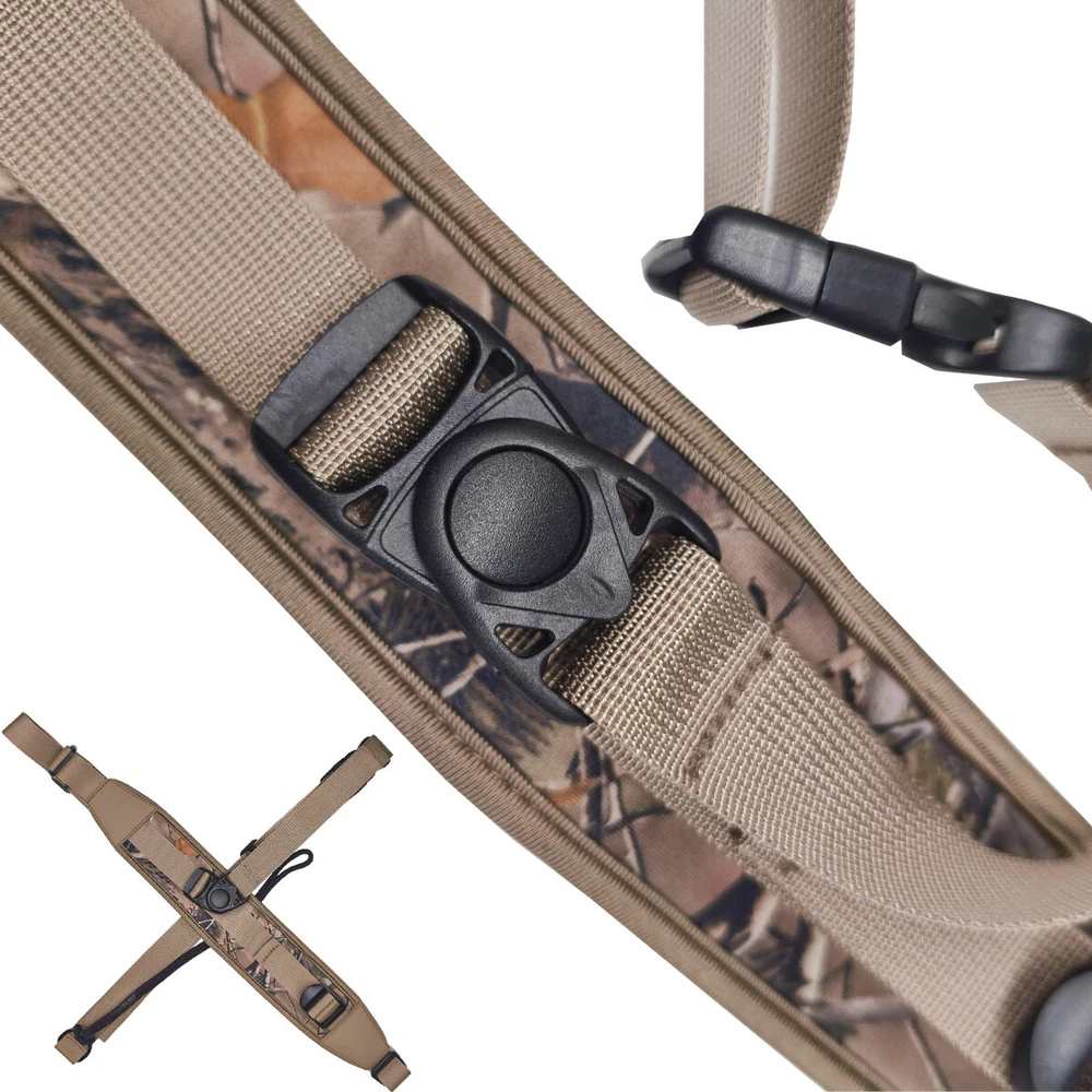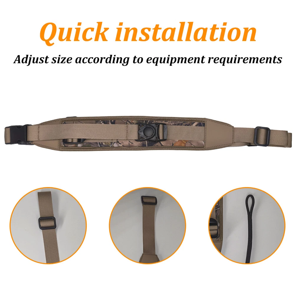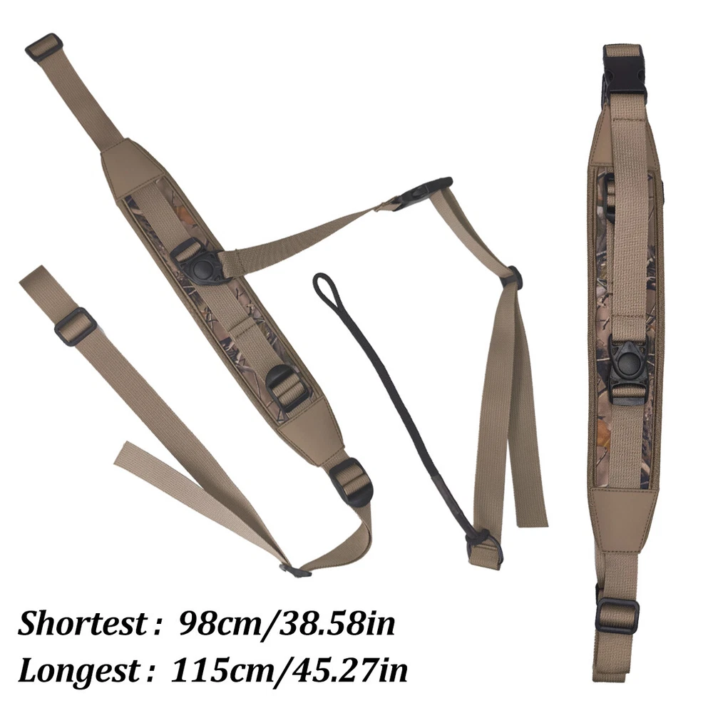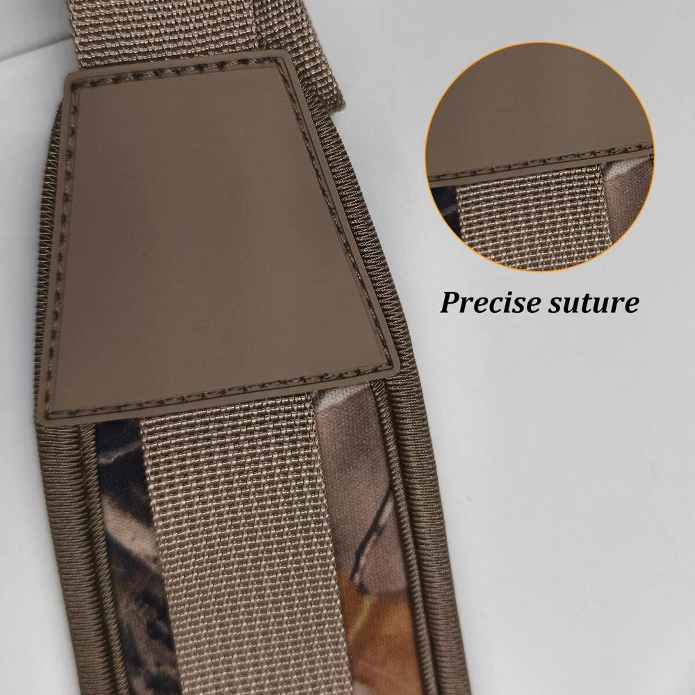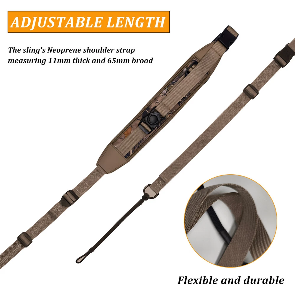 1. Enhanced Stability and Durability - Featuring a high-strength carbon steel swivel hook and durable nylon structure, this gun sling offers superior durability. It reduces sway during activities like skiing, cycling, or hiking, enhancing control. Enjoy improved stability and convenience across various activities, ensuring a more efficient and comfortable experience every time. 2. Quick Release Button - This gun sling is equipped with a quick-release button and a removable release button for fast transitions. The design allows you to move swiftly from a resting position to a hunting stance, improving your response time. The result is enhanced efficiency and quicker readiness, ensuring you're always prepared for action. 3. Easy Adjustment, Easy Fit - Crafted from high-density nylon, this camo rifle sling features four adjustable buckles, allowing for an easy length adjustment from 38 to 45 inches. This ensures an easy, personalized fit for any user, whether for different body sizes or equipment setups. The result is enhanced comfort and performance, giving you the freedom to adapt the sling to your needs effortlessly. 4. More Comfortable, More Lightweight - The sling features a 11mm thick, 65mm wide Neoprene shoulder strap, paired with a chest strap for an evenly distributed load. This design effectively eliminates the discomfort of carrying a rifle by distributing the weight across your body. The result is a more comfortable and lightweight carrying experience, allowing you to focus on your activity without being weighed down. 5. Four Mounting Options for Ultimate Flexibility - Unlike traditional fixed slings, our gun sling offers four customizable mounting options, allowing you to easily remove the QD connectors or strap. This gives you the flexibility to adjust the configuration to suit your specific needs. The result is a more versatile, comfortable, and efficient sling that adapts perfectly to any situation.