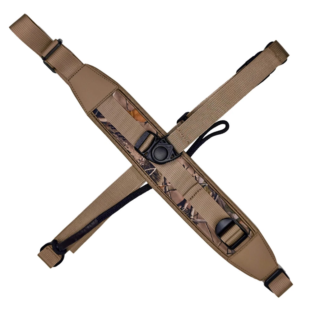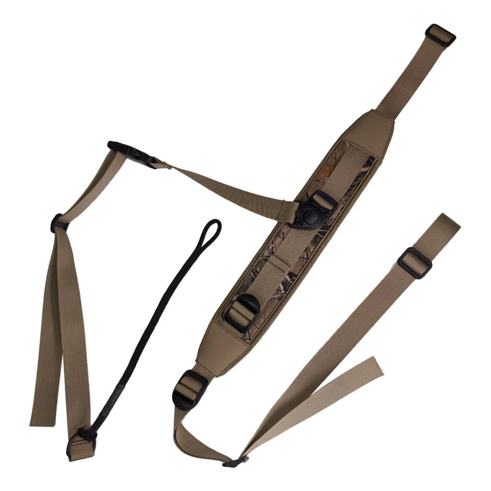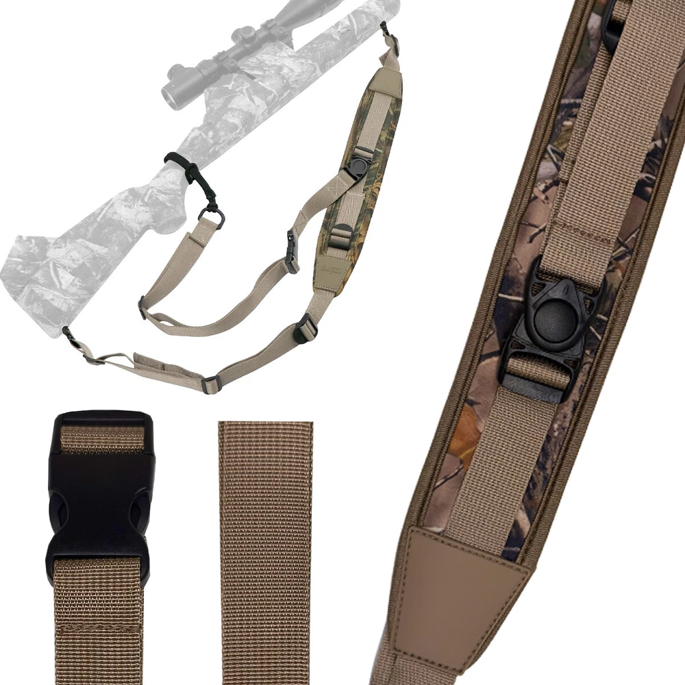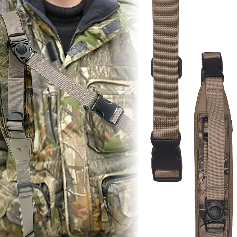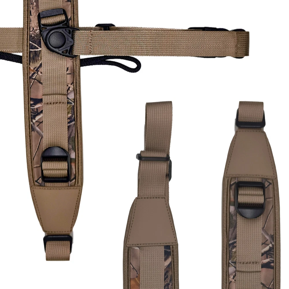 1. Enhanced Stability and Durability - Featuring a high-strength carbon steel swivel hook and durable nylon structure, this gun sling offers superior durability. It reduces sway during activities like skiing, cycling, or hiking, enhancing control. Enjoy improved stability and convenience across various activities, ensuring a more efficient and comfortable experience every time. 2. Quick Release Button - This gun sling is equipped with a quick-release button and a removable release button for fast transitions. The design allows you to move swiftly from a resting position to a hunting stance, improving your response time. The result is enhanced efficiency and quicker readiness, ensuring you're always prepared for action. 3. Easy Adjustment, Easy Fit - Crafted from high-density nylon, this camo rifle sling features four adjustable buckles, allowing for an easy length adjustment from 38 to 45 inches. This ensures an easy, personalized fit for any user, whether for different body sizes or equipment setups. The result is enhanced comfort and performance, giving you the freedom to adapt the sling to your needs effortlessly. 4. More Comfortable, More Lightweight - The sling features a 11mm thick, 65mm wide Neoprene shoulder strap, paired with a chest strap for an evenly distributed load. This design effectively eliminates the discomfort of carrying a rifle by distributing the weight across your body. The result is a more comfortable and lightweight carrying experience, allowing you to focus on your activity without being weighed down. 5. Four Mounting Options for Ultimate Flexibility - Unlike traditional fixed slings, our gun sling offers four customizable mounting options, allowing you to easily remove the QD connectors or strap. This gives you the flexibility to adjust the configuration to suit your specific needs. The result is a more versatile, comfortable, and efficient sling that adapts perfectly to any situation.