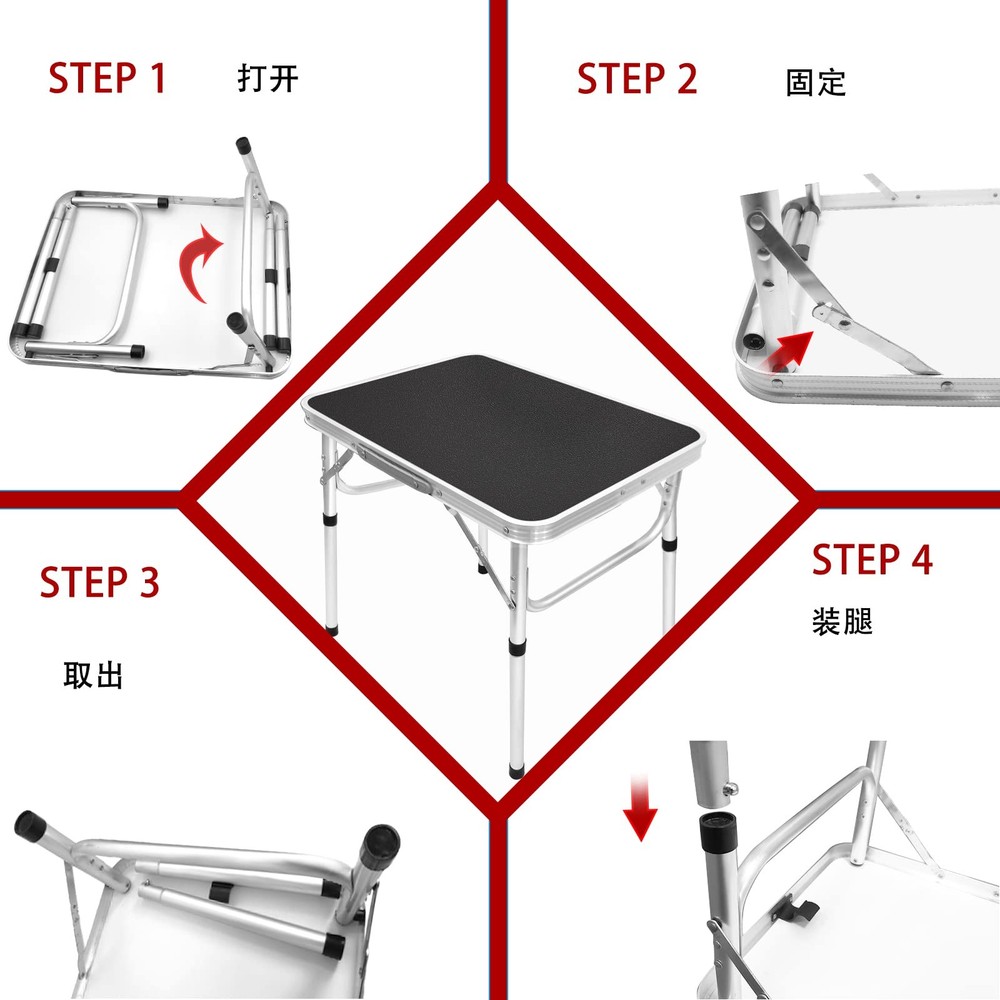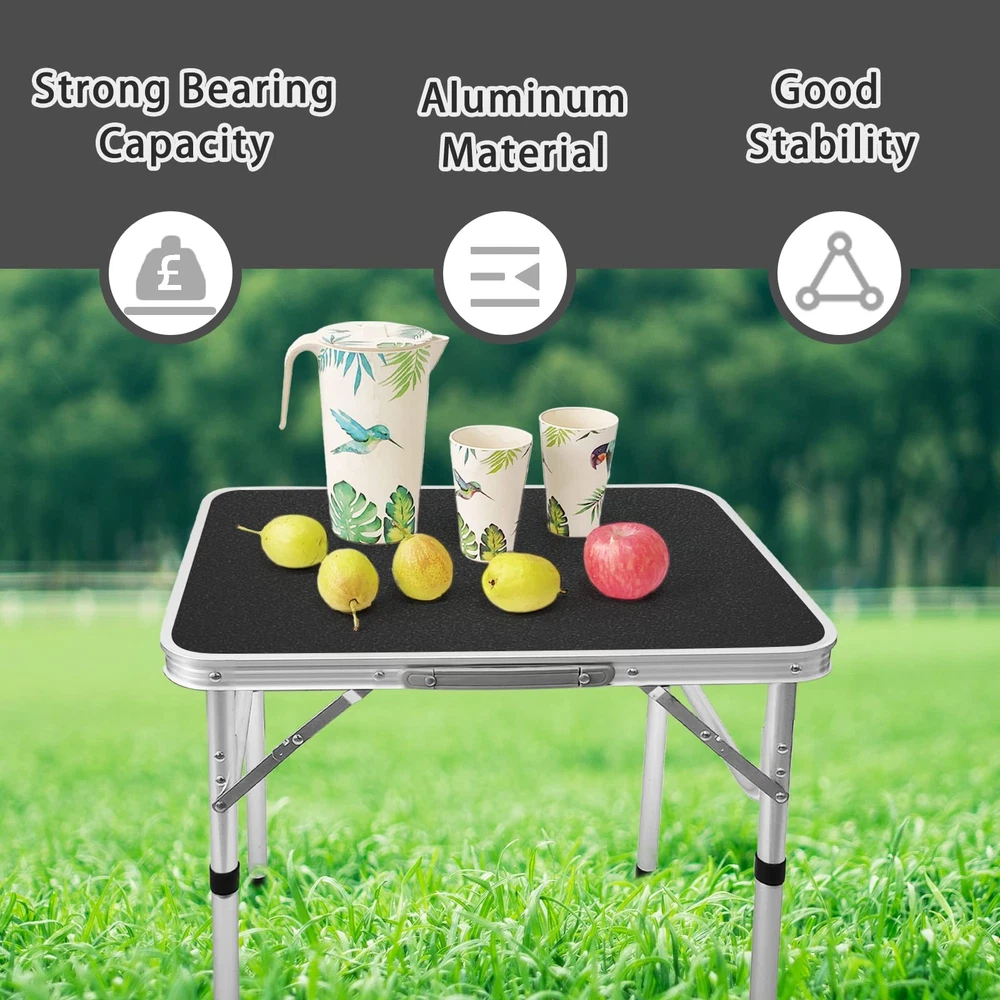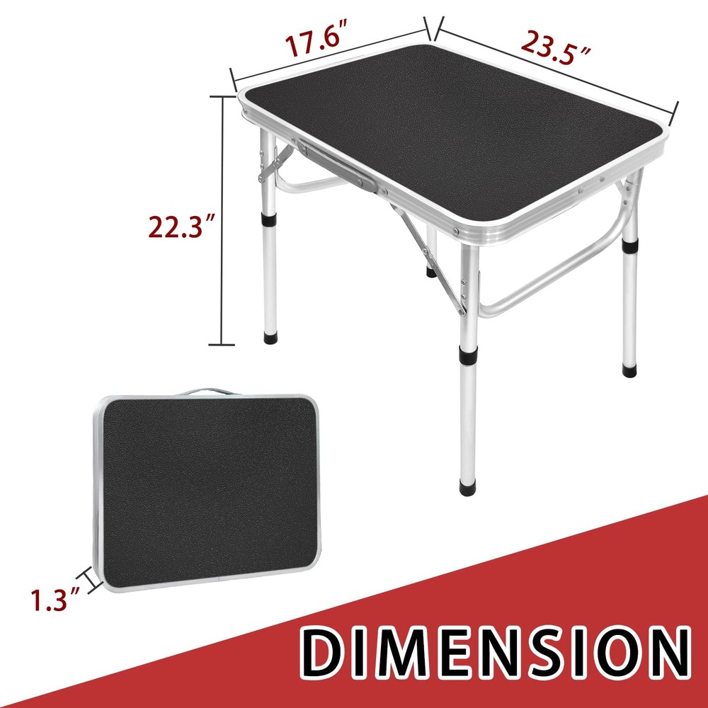 Aluminum Folding Small Table, Adjustable Height Lightweight Portable Camping Table for Picnic Beach Outdoor Indoor Easy to use :No Assembly Required, set up and fold in seconds. Two adjustable height : High height-21.6’’, Low height-10.6’’ Setup dimension:23.6''x17.7’’x21.6’’ /10.6''. Folded dimension:23.6''x1.3''x17.7''. This camping table is made of medium density fiberboard and upgrade aluminum alloy. which is stain-resistant, heavy-duty & lightweight, sturdy & durable. Versatile and practical: Whether you need a place to cook, eat, or play games, this foldable camping table is a must-have accessory for any outdoor adventure. Its compact size and lightweight construction make it easy to bring along wherever you go. Multiple Uses: Use this camp table as a picnic table, or to hold your lantern and other camping gear. It's suitable for all your outdoor activities.