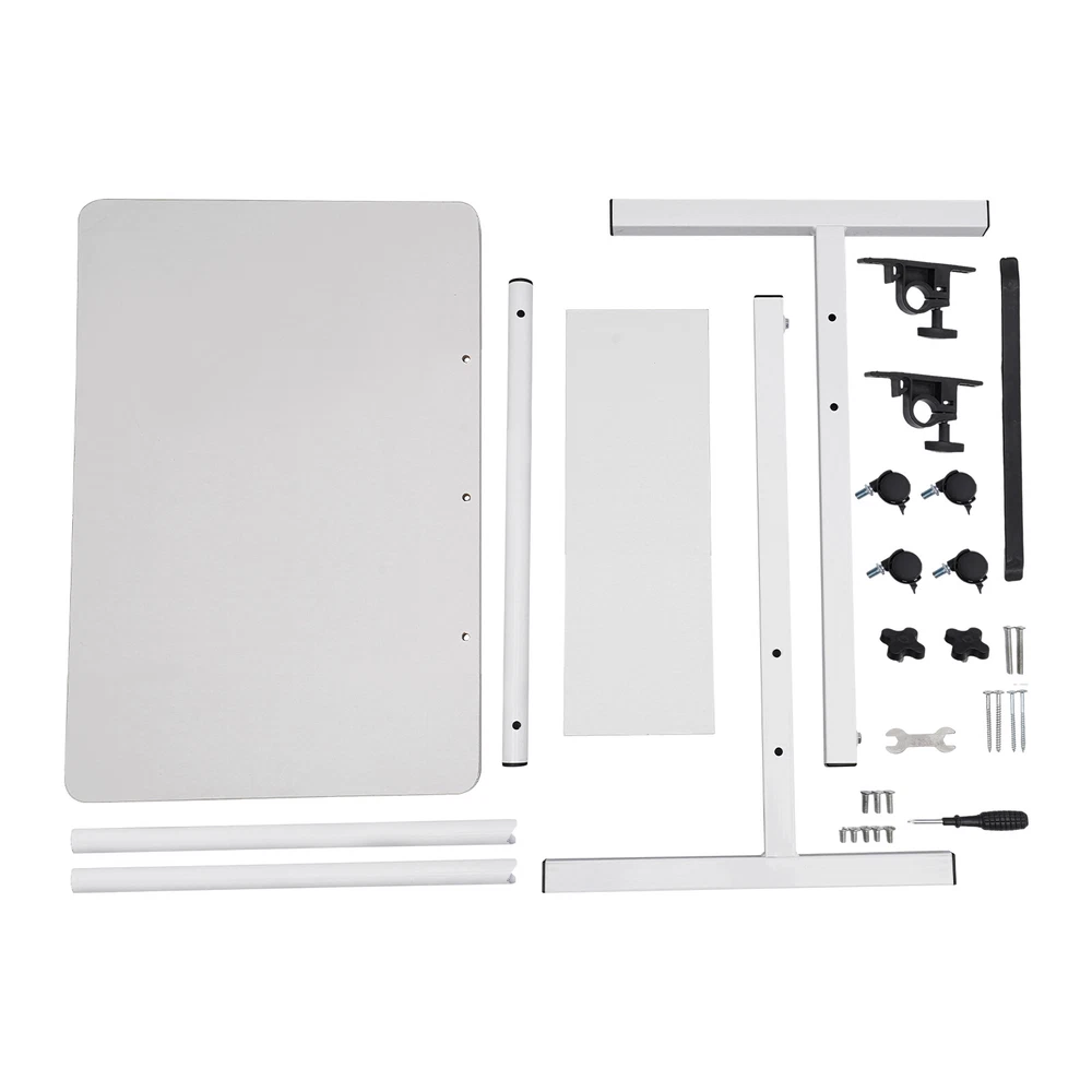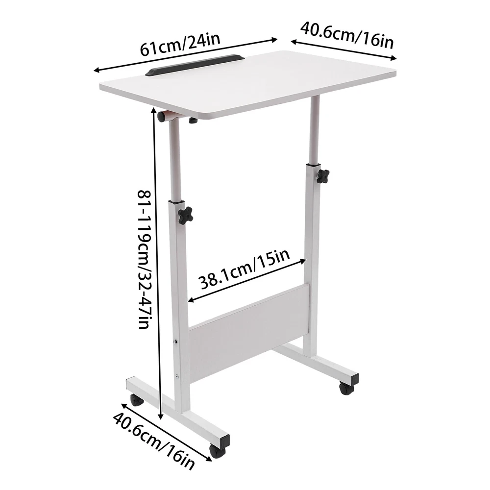 Specifications Material: MDF, Carbon Steel, Plastic Surface Treatment: Press-laminate, Plastic Spraying Color: White Style: Modern Shape: Rectangular Assembly Required: Yes Mount Type: Floor Mount Special Feature: Adjustable Recommended Uses: Working, Writing Adjustable Tilt Angle: 180° Adjustable Height: 81-119cm/32-47in Desktop Size: 61*40.6cm/24*16in Ground Leg Length: 40.6cm/16in Ground Leg Spacing: 38cm/15in Total Load-bearing Capacity: About 10kg/22lbs Gross Weight: 5.5kg/12lbs Net Weight: 5kg/11lbs Package Size: 72*45*10cm/28*18*4in Package Included 1* Adjustable Height Standing Desk 4* Wheels 1* English Installation Diagram All Accessories for Assembly Adjustable Height Standing Desk, Portable Laptop Desk, Rolling Computer Stand Welcome to my sotre (❁´◡`❁) Description If you're looking for a desk that's both practical and convenient, then this adjustable-height standing desk is an ideal solution. The adjustable height and tilt angle of the desktop can accommodate people of different heights, allowing you to sit up more comfortably. It is designed with 360° swivel wheels with brakes for effortless movement and fixation, allowing you to move around your workspace or office with ease. It is a good helper for your work and study. Key Features Build to Last: The product is made of MDF, plastic, and carbon steel and adopts press-laminate and plastic spraying processes, which are sturdy, and less prone to rust, corrosion, and scratch, ensuring a long service life. Neat Space: Its 24*16in wide desktop can hold table lamps, laptops, materials, stationery, and many other items for your easy access. They make your space neat and organized. Adjustable Design: Its height can be adjusted within 32-47in from the ground by plum-shaped knobs on the side according to your sitting or standing needs to make you soothe the spine and keep away from sub-health. The desktop is designed with a 180° adjustable tilt angle, so you can adjust it freely according to your needs. Strong Load-bearing Capacity: The sturdy rectangular structure, reinforced table legs, and high-quality materials allow it to withstand up to 22 lbs without collapsing, giving you peace of mind. Flexible to Move and Fix : Equipped with four 360° swivel wheels with brakes, you can easily move and secure the adjustable height standing desk anywhere, making it ideal for the home, office, or any space that needs to be efficiently organized. Effortless Cleaning: The smooth surface and simple structure make it very easy to clean. You just need to wipe it with a damp cloth. Assembly in a Breeze: Complete installation accessories, a clear installation diagram, and a simple structure allow you to complete the assembly in a very short time. Protective Package: To prevent the product from being damaged during transportation, we packed it with foam to protect your products to the maximum extent possible. Quality Service: We stand behind all our guests and look forward to assisting you with your purchase. It is our pleasure to answer your confusion and questions. The end of the story between us is not "we sell and you buy". Details Rounded Corners and Edges: The corners are rounded and smooth to reduce collisions and improve safety. Book Stopper: When you tilt the top surface, it can prevent books or magazines from sliding. Wire Clip: It can clamp the wire and make it easy to find the ends of your charging cables. Protective Covers: Carbon steel tubes are supplied with protective covers over the end cutout to prevent cutting your hands during installation and use. Application You can place your computer, laptop, printer, books, etc., and use it as a portable presentation podium, mobile standing computer desk, laptop table, office desk, simple dining black table, study table, service table, writing desk, computer workstation or other items for your office, living room, lounge, study, or bedroom! Specifications Material: MDF, Carbon Steel, Plastic Surface Treatment: Press-laminate, Plastic Spraying Color: White Style: Modern Shape: Rectangular Assembly Required: Yes Mount Type: Floor Mount Special Feature: Adjustable Recommended Uses: Working, Writing Adjustable Tilt Angle: 180° Adjustable Height: 81-119cm/ 32-47in Desktop Size: 61*40.6cm/24*16in Ground Leg Length: 40.6cm/16in Ground Leg Spacing: 38cm/15in Total Load-bearing Capacity: About 10kg/22lbs Gross Weight: 5.5kg/12lbs Net Weight: 5kg/11lbs Package Size: 72*45*10cm/28*18*4in Package Included 1* Adjustable Height Standing Desk 4* Wheels 1* English Installation Diagram All Accessories for Assembly Notes Please note that this product only includes a desk without other items. You should use a clean soft cloth to wipe the surface dust instead of using sharp objects to strike or hit the surface to avoid breakage. For carbon steel pipe surfaces with dust and dirt, you can use soap, weak detergent, or warm water to wash. Please allow the slight color difference caused by the shooting light and 1-3cm error due to manual measurement, and make sure you do not mind before you order. Payment Delivery details Terms of sales About us Contact us Payment We accept ebay payment 。 Fees such as import duties, taxes are not included in the item price or shipping costs. These charges are the buyer's responsibility. Delivery details Shipping: 2-9 working days to: USA Terms of sales We maintain high standards of excellence and strive for hundred percent customer satisfaction. Feedback is very important to us. We hope that you contact us immediately before you give neutral or negative feedback, so that we can address your concerns. It is impossible to address issues if we do not know about them! About us Your satis faction is our ultimate goal. We work hard to earn your trust and future business. Our certified technicians have tested each item before shipping. The unit comes with 1 year limited warranty on all manufacturing defects. a) If you receive a defective item, you may return it or ask for a disc
