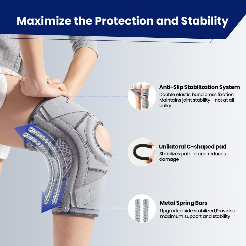 [Maximum Support & Pain Relief] Adjustable Double V-shaped oblique pressure belt can achieve 3-point fixed support, provide customized fit, relieve the pain caused by meniscus tear to the greatest extent, and help patients with meniscus tear and mild arthritis Recover Faster. [Knee Support Technology] The extended memory spring stabilizers (4 springs) on both sides strengthen the lateral support, maintain joint stability, provide sufficient compression and support for the knee and patella, and reduce the pressure on the knee joint. It is suitable for patients who are about to undergo knee surgery and postoperative recovery. [Open Patella Design] Better adapt to and fit the knee joint structure of different people. The unilateral C-shaped patella pad design distinguishes the left and right knee joints, wraps and stabilizes the patella more tightly, reduces its displacement and friction during activities, and can improve blood circulation around the knee joint. It is an ideal way to recover and relieve pain! 【High-Quality Fabric, Latex-Free Material】Using high-quality OK cloth fabric to apply targeted compression to the knee, it helps relieve joint and muscle pain, stabilize the knee, and the perforated design at the back of the knee is breathable and comfortable, so you can get compression without restricting your movement, providing extra support and compression for all-day wear! 【Maximum Support and Pain Relief】The knee brace can relieve knee pain, meniscus tears, arthritis, ACL, used for jogging, tennis, hiking, pickleball, climbing stairs, it will bring you the best sense of support, it is an ideal choice for knee injury recovery. 【After-sales service】Please don’t hesitate to if you have any quality problem.We will solve the problem for you until you are satisfied.If at any time you are not completely satisfied with your purchase feel free to return it to us for a full and prompt - No Questions.Your risk level is 0.