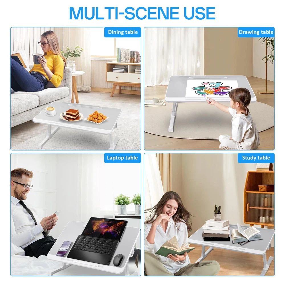 Adjustable Laptop Table Stand Lap Sofa Bed Tray Computer Notebook Desk Bullet Points: Enhanced Functionality: With a large size of 23.6x15.7 inches, our bed laptop stand accommodates 17-inch or larger laptops and features increased convenience for enjoying entertainment or working in bed Flexible Functionality: Effortlessly transform the laptop stand into a convenient snack tray during TV binges or use it as a versatile standing desk for office tasks in bed, on the sofa, table top, or floor. Plus, it's perfect for bed-bound relaxing Easy Height Adjustment: Achieve optimal comfort and convenience while working or relaxing in bed with 5 easily adjustable gear heights. Adjust your experience and enhance productivity Easily Adjustable Angle: Easily adjust the angle of the desktop to your preferred setting and lock it in place for optimum comfortable usage and productivity Easily Mobile: Use our bed laptop stand with its portable design for convenience. Foldable legs can be stored beneath the desk for easy transport and storage. Work or relax in comfort anywhere at home or business Stay productive and comfortable with our folding laptop desk. It's designed to bring more convenience to your workand versatile use for different tasks. Its height position can be easily adjusted, and you can adjust to the appropriate angle and lock it. Plus, it does not take up much space, making it ideal for small areas. Specification: Product name: bed laptop stand Product size: 23.62x15.74 inches/60x40cm Applicable to: Laptops 17 inches or larger Adjustable height: 5 positions Load capacity: about 20 kg/44.1 pound Desktop tilt angle: 0-36 degrees Legs adjustable range: 10.6-15 inches/26.92-38.1cm Packing List: 1* Laptop Desk for Bed Notes: 1. Due to different lighting and screen settings, the item color may be slightly different from the picture. 2. Due to different manual measurements, please allow a 1-2cm difference in size. We accept PayPal payment,PayPal Credit,Credit card or debit card and so on. Payment should be completed within 4 (Four) days of auction closing. Or unpaid dispute will be filed for closing auction. We will leave a positive feedback immediately after payment is received. We appreciate a positive feedback as much as you do. If for some reason there is any issue with the purchase, please contact us prior to leaving feedback, we will be glad to work together and provide a satisfying solution. 1. We ship to your eBay address. Each package will be shipped via FedEx or UPS 2-8 business days with tracking number 2. Please check your shipping address carefully before checkout, it can't be changed if order completed. 3. Shipping within 1 business days once payment completed. Orders placed on weekend will be delay 1-2 days. 4. Please allow 6 business days for delivery to any destinations. 5. As a buyer, it is your duty to pay the tax when you make an order from abroad. Our price does not include taxes, VAT, or other hidden charges. 1. We maintain high standards of excellence FIVE STAR and strive for 100% customer satisfaction! 2. Positive Feedback is very important to us. We hope that you contact us immediately BEFORE you give us neutral or negative feedback, so that we can satisfactorily address your concerns. 3. We promise to offer the best price and high quality products. 1. If you have any questions, please send a ebay message. 2. We will reply within 48 hours of your email. Weekend will be delayed a bit.