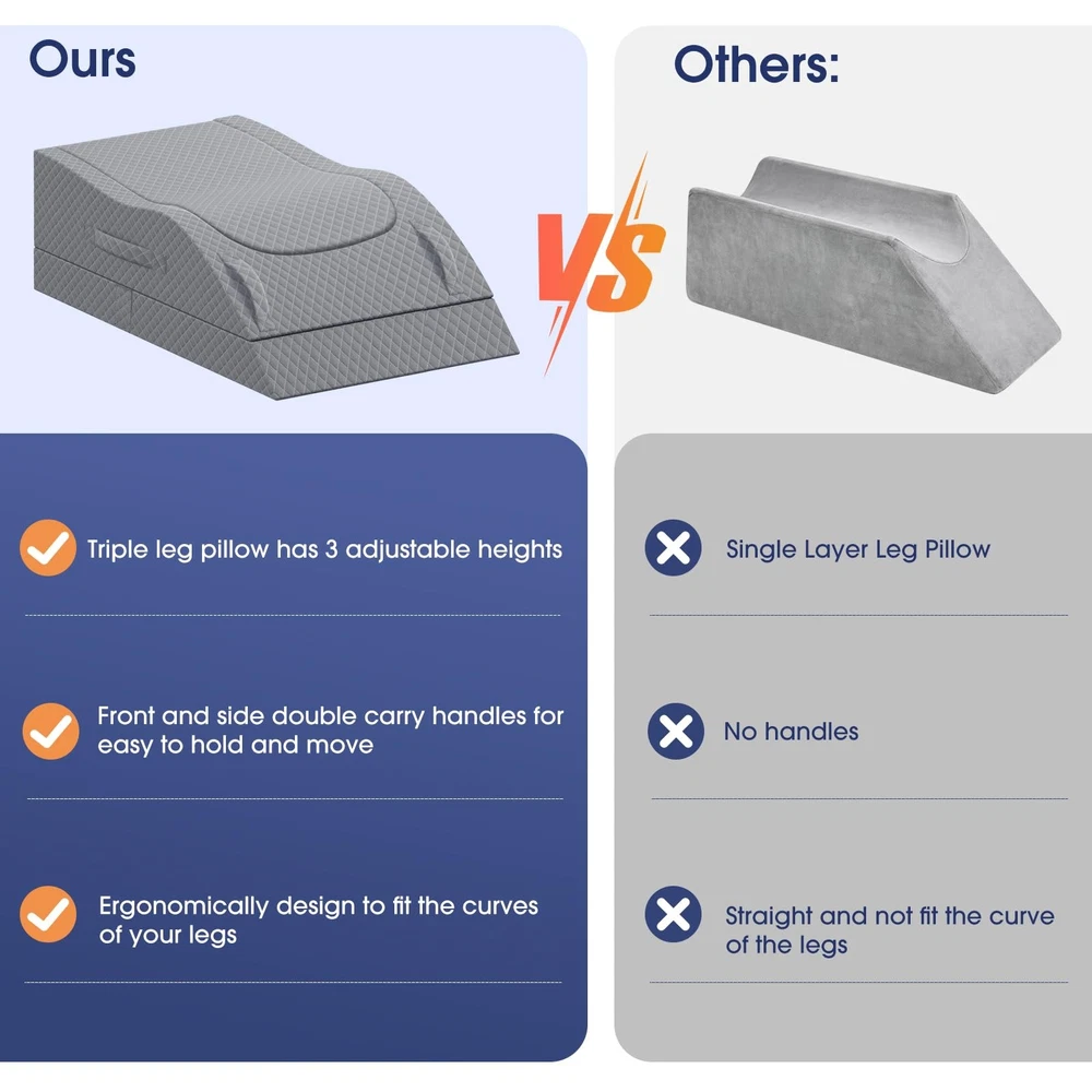 CushZone leg support pillow to elevate feet, which can be adjusted to your desired height. Its ergonomic shape and memory foam, breathable fabric ensure maximum support and comfort. Perfect for knee surgery recovery, daily relaxation. 3 Adjustable Height: Designed with your comfort in mind, this leg pillow offers easy height adjustment to cater to individual needs. The well-crafted padding ensures a comfortable experience, promoting relaxation and supporting recovery Premium Filling Material: Filled with memory foam and support foam, this pillow provides both softness and firm support. It conforms to the natural curve of your legs, relieving pressure points and preventing discomfort to promote better circulation and to help you feel your best, more quickly User-friendly Handles: Featuring conveniently placed handles on both sides, moving the pillow around is effortless. The bottom of the pillow includes an anti-slip design to ensure stability during use, keeping it firmly in place even when adjusting positions Breathable and Washable Cover: The pillowcase is crafted from smooth, breathable polyester fabric that keeps you cool and comfortable. It’s removable and machine washable, making it easy to maintain cleanliness and hygiene over time Practical Use for Daily Life and Recovery: Whether you're recovering from an injury or simply looking to relax, CushZone Leg Pillow enhances your daily life. It acts as an immobilizer to reduce swelling and improve circulation, providing extra comfort while reading, resting, or lounging