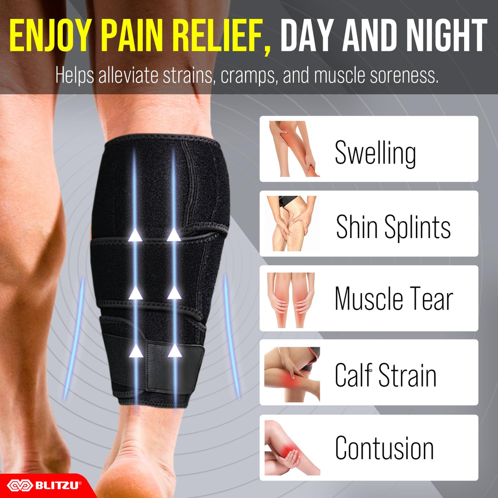 Calf Brace for Torn Calf Muscle, Adjustable Neoprene Compression Sleeve for Women, Men, Runners. Support Wrap for Shin Splints, Strain, Tear, Lower Leg Tibia Injury, and Pain Relief. S-M Effective Pain Relief: The BLITZU Calf Brace provides targeted relief from calf pain, stiffness, swelling, muscle strains, tears, cramps, tendonitis, and shin splints. Ideal for managing discomfort from injuries and overuse, it helps reduce inflammation and accelerate recovery. High-Quality Comfort: Crafted from breathable, high-quality fabric, this calf support ensures all-day comfort and flexibility. The soft, lightweight material is designed for a snug fit that contours to your calf, providing effective support without restricting Dual Adjustable Compression Straps: Features dual adjustable straps for a customizable fit and maximum support. Tailor the compression to your specific needs to stabilize your calf muscles and tendons effectively, reducing pain and preventing further injury during exercise or recovery. Versatile Use: Perfect for a wide range of activities, including running, hiking, cycling, sports, and everyday tasks. The versatile design offers reliable support for athletes and individuals seeking extra stability and comfort during physical activities and recovery. Universal Fit: Available in multiple sizes to fit various calf circumferences for both men and women. The adjustable design ensures a secure, snug fit for all body types, providing enhanced support and preventing slippage during movement. Durable & Easy to Maintain: Made from durable, long-lasting materials that can withstand regular use. The brace is easy to clean and maintain, ensuring it stays fresh and ready for your next workout or activity. Reliable Customer Support: BLITZU is committed to your satisfaction. If you encounter any issues with our calf brace, please contact us for prompt assistance. We offer a satisfactory resolution within 24 hours to ensure you receive the best service and support. Product Description The video showcases the product in use. The video guides you through product setup. The video compares multiple products. The video shows the product being unpacked. Doctor Recommended Recover with Confidence and Comfort Experience targeted relief and support with the BLITZU Adjustable Calf Brace. Designed for optimal comfort and customizable compression, this versatile brace aids in managing calf discomfort, swelling, and muscle strains, helping you stay active and recover faster. Targeted Relief for Shin and Calf Discomfort Durable Design Built with high-quality materials to withstand rigorous use and frequent wear. Enhanced Stability Stabilizes the upper arm muscles, minimizing the risk of further injury and aiding recovery. Adjustable Pressure Straps Extra compression straps allow you to adjust the pressure for optimal support, reducing swelling and adding stability. Breathable Fabric Crafted with lightweight, breathable material for all-day comfort and effective moisture control. Trusted and Approved by Professional Runners! Support That Keeps You Running Strong. "The support it provides is unmatched—I can feel the difference in muscle stability and reduced fatigue, especially during long runs and interval training. It fits perfectly and stays in place without sliding down, even during intense workouts. Plus, my recovery time has noticeably improved, making it easier to train back-to-back days. If you're serious about running and want reliable calf support, I can’t recommend this brace enough!" Trusted and Approved by Store Workers! All-Day Support for On-Your-Feet Strength. "I'm constantly on my feet, lifting, bending, and moving for hours on end. My calves used to ache by the end of the shift, but since I started using the Blitzu calf brace, the difference is night and day. It provides excellent support, reduces fatigue, and makes my legs feel stronger and more comfortable even during the busiest days. I can finally end my shifts without soreness! Highly recommend for anyone in a physically demanding job." 6.0 inches x 9.0 inches x 0.6 inches. Weight: 7.37 oz Color Black Product Dimensions 9 x 6 x 0.6 inches; 7.37 ounces Country of Origin China Specific Uses For Product Sprain Use for Calves Age Range (Description) Adult Size Small/Medium