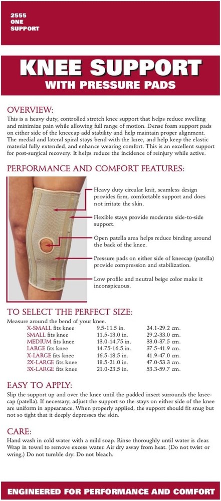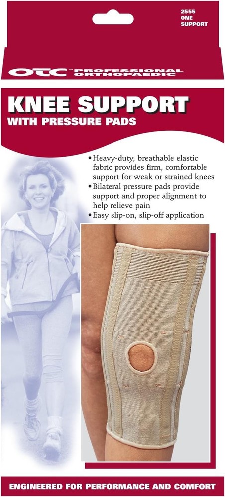 Powered by Frooition All Items See our eBay store for more great items >> Shop Categories Other Shoes and Boots Coats and Jackets Back Braces Wrist Braces Knee Braces Compression Hosiery Socks Camping Gear Misc. OTC Knee Support with Pressure Pads, X-Large Item Description Product Category : Health and Personal Care UPC : 048503255565 Title : OTC Knee Support with Pressure Pads, X-Large Walmart Subcategory : MedicalAids Description : This is for one OTC Knee Support, Pressure Pads, Knit Elastic OTC brand (model 2555) knee support with pressure pads. This is a heavy duty, controlled stretch knee support that helps reduce swelling and minimize pain while allowing full range of motion. Dense foam support pads on either side of the kneecap add stability and help maintain proper alignment. The medial and lateral spiral stays bend with the knee, and help keep the elastic material fully extended, and enhance wearing comfort.