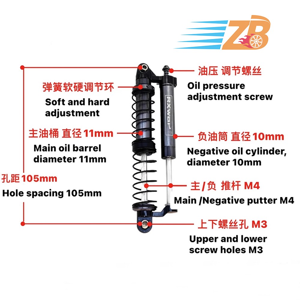 Adjustable Oil L=105mm Metal Negative Pressure Shock Absorber Double Damper For 1/8 Rc Crawler Car Meijiaxin H8h Yikong CROSSRS De fault added: 450cst shock absorber oil RX1/8 Gemini Shock Absorber Total length: 115mm Total width: 31.8mm Hole spacing: 105mm Compressed hole spacing: 71mm Suspension stroke: 34mm Shock absorber weight: 156g/4pcs Applicable vehicle model 1: CROSSRC1: 8 models: Big Rhino/Big Lion/Big Tiger/Big Leopard/Big Rock Sheep/ General use such as bison Applicable vehicle model 2: "Easy Control" 1:8 vehicle models 4081/4082/4083, etc. Universal Applicable vehicle model 3: Meijiaxin 1:8 model H8H can be installed without damage (Some of the above models may need to expand the mudguard shock absorber holes)