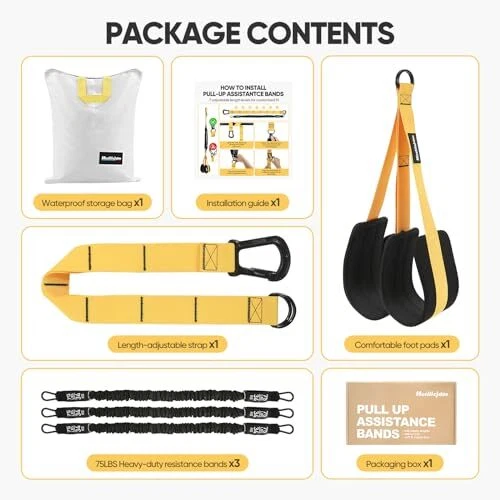 Package Weight: 0.99 Kilograms Number of Resistance Levels: 1 Brand: Does Not Apply gtin13: Does Not Apply Warranty Description: 1 YEAR Item Weight: 0.97 Kilograms UPC: Does Not Apply Item Width: 6.81 Included Components: sponge pad Sling hanging, 3Latex Tube Bands, Extension Strap MPN: Does Not Apply Type: Does Not Apply Color: Black and Yellow Date First Available: June 18, 2024 Model Name: Pull Up Assistance Set-yellow Item Length: 12.24 Part Number: Pull Up Assistance Set Item Package Dimensions L x W x H: 12.24 x 6.81 x 2.83 inches Suggested Users: unisex-adult Recommended Uses For Product: pull up, Back, Arm strength exercise, pull up helper bands, pull Material: Matal, Nylon, Natural Rubber, iron Manufacturer: Does Not Apply EAN: Does Not Apply Sport: Weightlifting, pull up, Exercise and Fitness, Strength Training, Style: Pull Up Special Feature: Heavy Duly, Portable, Stackable, Anti-Snap, Adjustable Tension Level: Heavy Item Height: 2.83