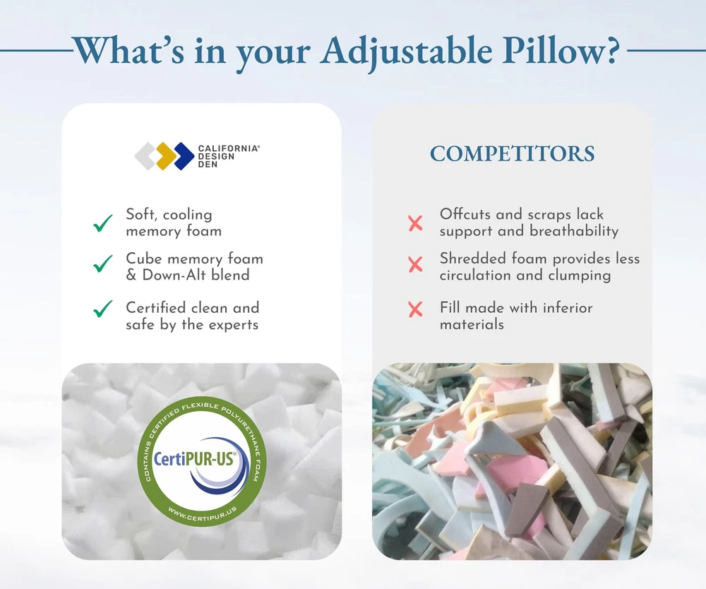 Experience the perfect blend of comfort and support with our adjustable pillow. Designed for a personalized sleep experience, this pillow allows you to customize its thickness using the included memory foam cubes. Enjoy the softness and luxury of down with the supportive functionality you need for a restful night’s sleep. This versatile pillow adapts to all sleeping positions—whether you’re a back, stomach, or side sleeper—providing tailored support to relieve neck and shoulder pain. Its gusseted design offers edge-to-edge support and enhanced airflow, ensuring a cooler and more comfortable sleep. The layered construction maintains a smooth, breathable surface, preventing overheating and ensuring consistent comfort throughout the night. Easy to care for, the pillow is washable, and its durable design extends its lifespan while supporting your healthy lifestyle. Featuring an easy-access pocket for simple adjustments, you can customize your pillow to reduce snoring and minimize tossing and turning. The pillow is CertiPUR-US Certified, reflecting our commitment to high-quality, naturally comfortable bedding. Transform your sleep with our adjustable pillow and enjoy the ultimate in personalized comfort. Adjustable Loft & Feel: Customize your comfortable sleep with our 1 piece adjustable queen size pillow / standard bed pillow (18" W x 28" L) suitable for any mattress size or type. The zippered inner core of memory foam pieces allows easy customization for your preferred height and firmness. Just use the extra fill that comes with the product. No foam scraps here but only engineered cubes for total comfort. Pain Relief: Say goodbye to neck and shoulder pain! Our gusseted queen memory foam pillows provide edge to edge support, and the included extra fill lets you adjust the height for optimal pain relief. Perfect for all types of sleepers. Cool Sleep: Enjoy a cool night's rest with our engineered cooling adjustable bed pillow. The soft, cool to the touch fabric and airflow dynamic gussets keep you comfortably cool throughout the night. Ideal for hot sleepers. Engineered Comfort: Silky down alternative fibers envelop the memory foam cubes for maximum comfort and support. Plus, the separate removable chamber allows for easy machine washing of the outer pillow. Our Commitment: Rest assured with our CertiPUR US certified pillows. Experience exceptional support from our dedicated customer care team with every purchase.