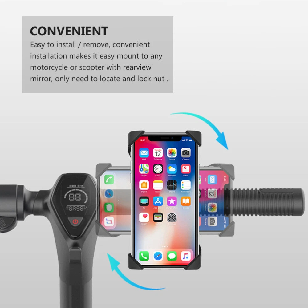 This scooter phone mount is a game-changer! It holds my phone securely, even on rough rides, and the adjustable grip fits any phone size. Super easy to install and stays firmly in place—no wobbling or slipping. The 360° rotation lets me find the perfect viewing angle, making navigation a breeze. Durable, well-built, and totally worth it for hassle-free rides!